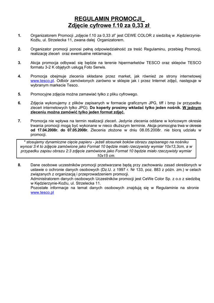 REGULAMIN PROMOCJI_ Zdjęcie cyfrowe f.10 za 0,33 zł 1. Organizatorem Promocji „zdjęcie f.10 za 0,33 zł” jest CEWE COLOR z siedzibą w .KędzierzynieKoźlu, ul. Strzelecka 11, zwana dalej Organizatorem. 2. Organizator promocji ponosi pełną odpowiedzialność za treść Regulaminu, przebieg Promocji, realizację zleceń oraz ewentualne reklamacje. 3. Akcja promocja odbywać się będzie na terenie hipermarketów TESCO oraz sklepów TESCO formatu 3-2 K objętych usługą Foto Serwis. 4. Promocja obejmuje zlecenia składane przez market, jak również ze strony internetowej www.tesco.pl. Odbiór zamówionych zarówno w sklepie jak i przez Internet zdjęć, następuje w wybranym markecie Tesco. 5. Promocyjne zdjęcia można zamawiać tylko z pliku cyfrowego. 6. Zdjęcia wykonujemy z plików zapisanych w formacie graficznym JPG, tiff i bmp (w przypadku zleceń internetowych tylko JPG). Do koperty prosimy wkładać tylko jeden nośnik. W jednym zleceniu można zamówić tylko jeden format zdjęć. 7. Promocja nie wpływa na termin realizacji zleceń. Jedynie zlecenia oddane w końcowym okresie trwania promocji mogą być wykonane w nieco dłuższym terminie. Akcja promocyjna trwa w okresie od 17.04.2008r. do 07.05.2008r. Zlecenia złożone w dniu 08.05.2008r. nie biorą udziału w promocji. * stosujemy dynamiczne cięcie papieru - jeżeli stosunek boków obrazu zapisanego na nośniku wynosi 3:4 to zdjęcie zamówione jako Format 10 będzie miało rzeczywisty wymiar 10x13,3cm, a w przypadku zapisu obrazu 2:3 zdjęcie zamówione jako Format 10 będzie miało rzeczywisty wymiar 10x15 cm. 8. Dane osobowe uczestników promocji przetwarzane będą przy zachowaniu zasad określonych w ustawie o ochronie danych osobowych (Dz.U. z 1997 r. Nr 133, poz. 883 z późn. zm.) w celach związanych z organizacją i przeprowadzeniem promocji. Administratorem danych osobowych Uczestników promocji jest CeWe Color Sp. z o.o z siedzibą w Kędzierzynie-Koźlu, ul. Strzelecka 11. Pozostałe informacje na temat danych osobowych znajdują się w Regulaminie na stronie www.tesco.pl