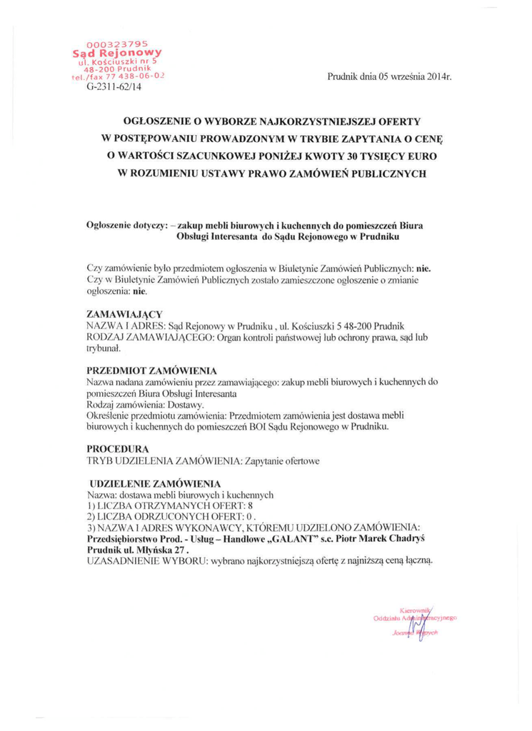 OOO323795 Sąd Rejonowy ul. Kościuszki nr 5 48-200 P r u d n i k tel./fax 77 438-06-02 G-2311-62/14 Prudnik dnia 05 września 2014r. OGŁOSZENIE O WYBORZE NAJKORZYSTNIEJSZEJ OFERTY W POSTĘPOWANIU PROWADZONYM W TRYBIE ZAPYTANIA O CENĘ O WARTOŚCI SZACUNKOWEJ PONIŻEJ KWOTY 30 TYSIĘCY EURO W ROZUMIENIU USTAWY PRAWO ZAMÓWIEŃ PUBLICZNYCH Ogłoszenie dotyczy: -zakup mebli biurowych i kuchennych do pomieszczeń Biura Obsługi Interesanta do Sądu Rejonowego w Prudniku Czy zamówienie było przedmiotem ogłoszenia w Biuletynie Zamówień Publicznych: nie. Czy w Biuletynie Zamówień Publicznych zostało zamieszczone ogłoszenie o zmianie ogłoszenia: nie. ZAMAWIAJĄCY NAZWA I ADRES: Sąd Rejonowy w Prudniku , ul. Kościuszki 5 48-200 Prudnik RODZAJ ZAMAWIAJĄCEGO: Organ kontroli państwowej lub ochrony prawa, sąd lub trybunał. PRZEDMIOT ZAMÓWIENIA Nazwa nadana zamówieniu przez zamawiającego: zakup mebli biurowych i kuchennych do pomieszczeń Biura Obsługi Interesanta Rodzaj zamówienia: Dostawy. Określenie przedmiotu zamówienia: Przedmiotem zamówienia jest dostawa mebli biurowych i kuchennych do pomieszczeń BOI Sądu Rejonowego w Prudniku. PROCEDURA TRYB UDZIELENIA ZAMÓWIENIA: Zapytanie ofertowe UDZIELENIE ZAMÓWIENIA Nazwa: dostawa mebli biurowych i kuchennych 1) LICZBA OTRZYMANYCH OFERT: 8 2) LICZBA ODRZUCONYCH OFERT: O . 3) NAZWA I ADRES WYKONAWCY, KTÓREMU UDZIELONO ZAMÓWIENIA: Przedsiębiorstwo Prod. - Usług - Handlowe „GALANT" s.c. Piotr Marek Chadryś Prudnik ul. Młyńska 27. UZASADNIENIE WYBORU: wybrano najkorzystniejszą ofertę z najniższą ceną łączną. Kierownil Oddziału Adrfiinfaacyjnego