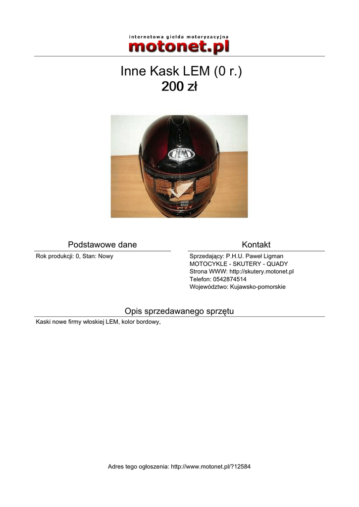 Inne Kask LEM (0 r.) 200 zł Podstawowe dane Rok produkcji: 0, Stan: Nowy Kontakt Sprzedający: P.H.U. Paweł Ligman MOTOCYKLE - SKUTERY - QUADY Strona WWW: http://skutery.motonet.pl Telefon: 0542874514 Województwo: Kujawsko-pomorskie Opis sprzedawanego sprzętu Kaski nowe firmy włoskiej LEM, kolor bordowy, Adres tego ogłoszenia: http://www.motonet.pl/?12584