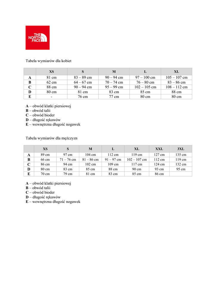 Tabela wymiarów dla kobiet A B C D E XS S M L XL 81 cm 62 cm 88 cm 80 cm - 83 – 89 cm 64 – 67 cm 90 – 94 cm 81 cm 76 cm 90 – 94 cm 70 – 74 cm 95 – 99 cm 83 cm 77 cm 97 – 100 cm 76 – 80 cm 102 – 105 cm 85 cm 80 cm 105 – 107 cm 83 – 86 cm 108 – 112 cm 88 cm 80 cm A – obwód klatki piersiowej B – obwód talii C – obwód bioder D – długość rękawów E – wewnętrzna długość nogawek Tabela wymiarów dla mężczyzn A B C D E XS S M L XL XXL 3XL 89 cm 66 cm 86 cm 80 cm 70 cm 97 cm 71 – 76 cm 94 cm 83 cm 79 cm 104 cm 81 – 86 cm 102 cm 85 cm 81 cm 112 cm 91 – 97 cm 109 cm 88 cm 83 cm 119 cm 102 – 107 cm 117 cm 90 cm 85 cm 127 cm 112 cm 124 cm 93 cm 86 cm 135 cm 119 cm 132 cm 95 cm A – obwód klatki piersiowej B – obwód talii C – obwód bioder D – długość rękawów E – wewnętrzna długość nogawek