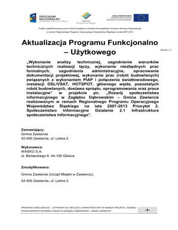 Projekt współfinansowany przez Unię Europejską ze środków Europejskiego Funduszu Rozwoju Regionalnego w ramach Regionalnego Programu Operacyjnego Województwa Śląskiego na lata 2007-2013 Aktualizacja Programu Funkcjonalno – Użytkowego „Wykonanie analizy technicznej, uzgodnienie warunków technicznych realizacji łączy, wykonanie niezbędnych prac formalnych, uzgodnienia administracyjne, opracowanie dokumentacji projektowej, wykonanie prac (robót budowlanych) związanych z wykonaniem PIAP i połączenia światłowodowego, instalacji DSL/VSAT, HOTSPOT, głównego węzła, pozostałych robót budowlanych, dostawa sprzętu, oprogramowania oraz prace instalacyjne” w projekcie pn. „Rozwój społeczeństwa informacyjnego w Zagłębiu Dąbrowskim – Gmina Zawiercie realizowanym w ramach Regionalnego Programu Operacyjnego Województwa Śląskiego na lata 2007-2013 Priorytet 2. Społeczeństwo Informacyjne Działanie 2.1 Infrastruktura społeczeństwa informacyjnego”. Zamawiający: Gmina Zawiercie 42-400 Zawiercie, ul. Leśna 2 Wykonawca: WASKO S.A. ul. Berbeckiego 6, 44-100 Gliwice Zmodyfikowano: Gmina Zawiercie (Urząd Miejski w Zawierciu), 42-400 Zawiercie, ul. Leśna 2. PROGRAM FUNKCJONALNO – UŻYTKOWY DLA REALIZACJI INFRASTRUKTURY W RAMACH PROJEKTU „ROZWÓJ SPOŁECZEŃSTWA INFORMACYJNEGO W ZAGŁĘBIU DĄBROWSKIM – GMINIE ZAWIERCIE” -1- Strona | 1 Projekt współfinansowany przez Unię Europejską ze środków Europejskiego Funduszu Rozwoju Regionalnego w ramach Regionalnego Programu Operacyjnego Województwa Śląskiego na lata 2007-2013 Zawartość opracowania: Strona | 2 Zawartość opracowania:........................................................................................................... 2 I. Część opisowa programu funkcjonalno-użytkowego.............................................................. 4 1. Opis ogólny przedmiotu zamówienia. ......................................................................... 4 1.1 Charakterystyczne parametry określające wielkość obiektu oraz zakres robót budowlanych. ............................................................................................................. 4 1.2 Aktualne uwarunkowania wykonania przedmiotu zamówienia. ................................... 7 1.2.1 Uwarunkowania funkcjonalno - przestrzenne ............................................................... 7 1.2.2 Uwarunkowania formalno – prawne wykonania przedmiotu zamówienia.................... 12 1.3 Ogólne właściwości funkcjonalno - użytkowe. .......................................................... 15 1.4 Szczegółowe właściwości funkcjonalno - użytkowe. ................................................. 16 1.4.1. Program funkcjonalno – użytkowy ............................................................................. 16 1.4.2. Szacunkowe zestawienie materiałów oraz urządzeń ................................................ 18 1.4.3. Zestawienie zapotrzebowania mediów ..................................................................... 20 2. Opis wymagań Zamawiającego w stosunku do przedmiotu zamówienia .................. 20 2.1. Przygotowanie terenu budowy ................................................................................. 20 2.2. Wymagania zamawiającego wobec zainstalowanego sprzętu oraz rozwiązań informatycznych, budowlano-konstrukcyjnych i wskaźników ekonomicznych ........... 21 2.2.1. Architektura i konstrukcja .......................................................................................... 21 2.2.2. Urządzenia technologiczne, osprzęt sieciowy oraz oprogramowanie ........................ 22 2.2.3. Instalacje................................................................................................................... 55 2.2.4. Wskaźniki ekonomiczne ............................................................................................ 55 2.3. Warunki wykonania i odbioru robót .............................................................................. 55 II. Część informacyjna programu funkcjonalno-użytkowego.................................................... 63 PROGRAM FUNKCJONALNO – UŻYTKOWY DLA REALIZACJI INFRASTRUKTURY W RAMACH PROJEKTU „ROZWÓJ SPOŁECZEŃSTWA INFORMACYJNEGO W ZAGŁĘBIU DĄBROWSKIM – GMINIE ZAWIERCIE” -2- Projekt współfinansowany przez Unię Europejską ze środków Europejskiego Funduszu Rozwoju Regionalnego w ramach Regionalnego Programu Operacyjnego Województwa Śląskiego na lata 2007-2013 1. Dane o zgodności zamierzenia z wymaganiami wynikającymi z przepisów. ............. 63 2. Prawo Zamawiającego do dysponowania nieruchomością na cele budowlane. ....... 64 3. Przepisy i normy związane z projektowaniem i robotami .......................................... 64 4. Inne informacje niezbędne do projektowania. .......................................................... 65 Strona | 3 PROGRAM FUNKCJONALNO – UŻYTKOWY DLA REALIZACJI INFRASTRUKTURY W RAMACH PROJEKTU „ROZWÓJ SPOŁECZEŃSTWA INFORMACYJNEGO W ZAGŁĘBIU DĄBROWSKIM – GMINIE ZAWIERCIE” -3- Projekt współfinansowany przez Unię Europejską ze środków Europejskiego Funduszu Rozwoju Regionalnego w ramach Regionalnego Programu Operacyjnego Województwa Śląskiego na lata 2007-2013 I. Część opisowa programu funkcjonalno-użytkowego Opis ogólny przedmiotu zamówienia. 1. Program funkcjonalno-użytkowy opracowano w celu określenia zakresu działań oraz prognozowanych kosztów prac projektowych i robót budowlanych niezbędnych do realizacji infrastruktury oraz określenia funkcji użytkowych związanych z realizacją inwestycji pn. „Rozwój Społeczeństwa Informacyjnego w Zagłębiu Dąbrowskim – Gminie Zawiercie”. Podstawą opracowania programu funkcjonalno-użytkowego jest „Koncepcja Miejskiej Sieci Bezprzewodowego dostępu do internetu dla Gminy Zawiercie”. Charakterystyczne parametry określające wielkość ob