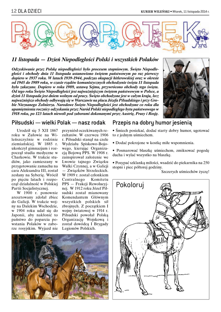 12 DLA DZIECI KURIER WILEŃSKI • Wtorek, 11 listopada 2014 r. 11 listopada — Dzień Niepodległości Polski i wszystkich Polaków Odzyskiwanie przez Polskę niepodległości było procesem stopniowym. Święto Niepodległości i obchody dnia 11 listopada ustanowiono świętem państwowym po raz pierwszy dopiero w 1937 roku. W latach 1939-1944, podczas okupacji hitlerowskiej oraz w okresie od 1945 do 1989 roku, w czasie rządów komunistycznych obchodzenie święta 11 listopada było zakazane. Dopiero w roku 1989, ustawą Sejmu, przywrócono obchody tego święta. Od tego roku Święto Niepodległości jest najważniejszym świętem państwowym w Polsce, a dzień 11 listopada jest dniem wolnym od pracy. Święto obchodzone jest w całym kraju, lecz najważniejsze obchody odbywają się w Warszawie na placu Józefa Piłsudskiego i przy Grobie Nieznanego Żołnierza. Narodowe Święto Niepodległości jest obchodzone co roku dla upamiętnienia rocznicy odzyskania przez Naród Polski niepodległego bytu państwowego w 1918 roku, po 123 latach niewoli pod zaborami dokonanymi przez Austrię, Prusy i Rosję. Piłsudski — wielki Polak — nasz rodak Urodził się 5 XII 1867 roku w Zułowie na Wileńszczyźnie w rodzinie ziemiańskiej. W 1885 r. ukończył gimnazjum i rozpoczął studia medyczne w Charkowie. W trakcie studiów, jako zamieszany w przygotowanie zamachu na cara Aleksandra III, został zesłany na Syberię. Wrócił po pięciu latach i rozpoczął działalność w Polskiej Partii Socjalistycznej. W 1900 r. ponownie aresztowany zdołał zbiec do Galicji. W trakcie wojny na Dalekim Wschodzie, w 1904 roku udał się do Japonii, aby nakłonić to państwo do poparcia powstania Polaków w zaborze rosyjskim. Wyjazd nie przyniósł oczekiwanych rezultatów. W czerwcu 1906 r. Piłsudski stanął na czele Wydziału Spiskowo-Bojowego, kierując Organizacją Bojową PPS. W 1908 r. zainspirował założenie we Lwowie tajnego Związku Walki Czynnej, a w Galicji — Związków Strzeleckich. W 1909 r. został członkiem Centralnego Komitetu PPS — Frakcji Rewolucyjnej. W 1912 roku Józef Piłsudski został mianowany Komendantem Głównym wszystkich polskich sił zbrojnych. Z początkiem I wojny światowej w 1914 r. Piłsudski powołał Polską Organizację Wojskową i został dowódcą I Brygady Legionów Polskich. Przepis na dobry humor jesienią • Śmiech posiekać, dodać starty dobry humor, ugotować to z jednym uśmiechem. • Dodać pokrojone w kostkę miłe wspomnienia. • Posmarować blaszkę uśmiechem, zmiksować pogodę ducha i wylać wszystko na blaszkę. • Posypać szklanką miłości, wsadzić do piekarnika na 250 stopni i piec półtorej godziny. Szczerych uśmiechów życzę! Pokoloruj DLA DZIECI 13 KURIER WILEŃSKI • Wtorek, 11 listopada 2014 r. Małe co nieco o grze w kręgle Zabawa: Czy masz duszę artysty Kręgle to bardzo popularna gra, która wynaleziona została przez… jaskiniowców. Wolny czas ludzie pierwotni spędzali, rzucając dużymi kamieniami w mniejsze. Traktowali to jako rozrywkę. Wiemy o tym z licznych zachowanych skalnych rysunków. Kolejne odkrycia archeologiczne dowodziły, że gra w kręgle uprawiana była przez starożytnych Egipcjan, Rzymian, Fenicjan i Kartagińczyków. W XIV wieku szał kręgli do tego stopnia opanował Anglię, że jej kolejni królowie po prostu jej zabraniali. 200 lat później gra rozpowszechniła się wśród Niemców i dotarła na kontynent północnoamerykański. Tutaj zrobiła oszałamiającą karierę. Najlepsi gracze założyli Amerykański Kongres Bowlingu i ustalili zasady gry, które obowiązują do dzisiaj. Im zawdzięczamy ustawienie 10 kręgli zamiast 9 i wywiercenie 3 otworów w kuli. Bowling stał się wówczas sportem uprawianym zawodowo. Bowling jest dziś jedną z najatrakcyjniejszych gier towarzyskich i sportowych. Fakt ten jest oczywisty dla niemal każdego, kto choć raz próbować rzucać bowlingową kulą. Dzieje się tak gdyż, aby grać w bowling, nie potrzeba żadnych wybitnych uzdolnień czy warunków fizycznych, nie potrzeba poznawać skomplikowanych zasad gry (bo są dziecinnie proste), ani przepisów ją regulujących oraz nie martwić się o prowadzenie punktacji, by wyłonić zwycięzcę rywalizacji, bo zrobi to za nas automat. Nam pozostaje jedynie wybrać kulę i rzucając nią przewrócić więcej kręgli niż przeciwnik. Wszystko oczywiście w atmosferze zdrowej rywalizacji, dobrej zabawy i integracji. Najlepsi aktorzy i świetni piosenkarze tylko z pozoru przypominają zwykłych ludzi. Różnią się od nich niezwykłą wrażliwością, talentem i... sposobem patrzenia na świat. Przekonajcie się, czy i Wy macie osobowość prawdziwej gwiazdy! Zaczynamy! 1. Pod dom, w którym mieszkacie, przytuptał mały jeż. Co robicie? a) Pomagacie mu wrócić do lasu. b) Zawozicie biedaka do zoo. c) Bierzecie go do domu i oswajacie. 2. Tata chce zabrać Was do prawdziwej opery. a) Protestujecie — opery są nudne i zdecydowanie za długie. b) Negocjujecie wyprawę do kina na nowy film. c) Zgadzacie się, ponieważ nigdy nie byliście w operze. 3. Jakie szkolne przedmioty najbardziej lubicie? a) Matematykę lub przyrodę. b) Języki obce, zwłaszcza angielski. c) Plastykę i muzykę. 4. Zaglądacie do szafy. Co zajmuje w niej najwięcej miejsca? a) Słodkie spódniczki lub kolorowe szorty. b) Sterta dżinsów. c) Koszulki z zabawnymi nadrukami. 5. Wasz pies wytarzał się w błocie, a teraz chce się do Was przytulić. a) Prosicie rodziców, by się nim zajęli. b) Zabieracie go do łazienki i myjecie. c) Przytulacie się do niego. Kochany maluch. 6. Zapomnieliście odrobić pracę domową. a) Prosicie koleżankę, by dała Wam odpisać. b) Po prostu zgłaszacie nieprzygotowanie. c) Próbujecie na szybko odrobić zadanie. 7. Kumpel mówi o Was nieprzyjemne rzeczy. I to przy Was! a) Wyjaśniacie wszystkim, że jest skończonym kłamcą. b) Wyzywacie go od najgorszych! c) Zaczynacie płakać i wyc