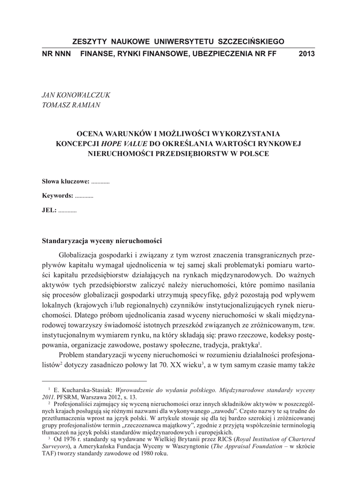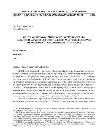 ZESZYTY NAUKOWE UNIWERSYTETU SZCZECIŃSKIEGO NR NNN FINANSE, RYNKI FINANSOWE, UBEZPIECZENIA NR FF 2013 Jan Konowalczuk Tomasz Ramian Ocena warunków i możliwości wykorzystania koncepcji hope value do określania wartości rynkowej nieruchomości przedsiębiorstw w Polsce Słowa kluczowe: ............ Keywords: ............ JEL: ............ Standaryzacja wyceny nieruchomości Globalizacja gospodarki i związany z tym wzrost znaczenia transgranicznych przepływów kapitału wymagał ujednolicenia w tej samej skali problematyki pomiaru wartości kapitału przedsiębiorstw działających na rynkach międzynarodowych. Do ważnych aktywów tych przedsiębiorstw zaliczyć należy nieruchomości, które pomimo nasilania się procesów globalizacji gospodarki utrzymują specyfikę, gdyż pozostają pod wpływem lokalnych (krajowych i/lub regionalnych) czynników instytucjonalizujących rynek nieruchomości. Dlatego próbom ujednolicania zasad wyceny nieruchomości w skali międzynarodowej towarzyszy świadomość istotnych przeszkód związanych ze zróżnicowanym, tzw. instytucjonalnym wymiarem rynku, na który składają się: prawo rzeczowe, kodeksy postępowania, organizacje zawodowe, postawy społeczne, tradycja, praktyka. Problem standaryzacji wyceny nieruchomości w rozumieniu działalności profesjonalistów dotyczy zasadniczo połowy lat 70. XX wieku, a w tym samym czasie mamy także E. Kucharska-Stasiak: Wprowadzenie do wydania polskiego. Międzynarodowe standardy wyceny 2011. PFSRM, Warszawa 2012, s. 13. Profesjonaliści zajmujący się wyceną nieruchomości oraz innych składników aktywów w poszczególnych krajach posługują się różnymi nazwami dla wykonywanego „zawodu”. Często nazwy te są trudne do przetłumaczenia wprost na język polski. W artykule stosuje się dla tej bardzo szerokiej i zróżnicowanej grupy profesjonalistów termin „rzeczoznawca majątkowy”, zgodnie z przyjętą współcześnie terminologią tłumaczeń na język polski standardów międzynarodowych i europejskich. Od 1976 r. standardy są wydawane w Wielkiej Brytanii przez RICS (Royal Institution of Chartered Surveyors), a Amerykańska Fundacja Wyceny w Waszyngtonie (The Appraisal Foundation – w skrócie TAF) tworzy standardy zawodowe od 1980 roku. Jan Konowalczuk, Tomasz Ramian do czynienia z pierwszymi próbami ujednolicania metodyki na poziomie międzynarodowym. Przykładami mogą być: − wydawnictwo TEGoVoFA z 1981 roku, standaryzujące wycenę na szczeblu kontynentu europejskiego, − standardy TIAVSC w skali światowej wydawane od 1985 roku Międzynarodowe Standardy Wyceny. Z oczywistych powodów w Polsce w tym czasie brak było nie tylko możliwości uczestniczenia, ale nawet znajomości tych wydawnictw. Jednak już na początku lat 90. XX wieku PFSRM wydała polskie tłumaczenia standardów amerykańskich USPAP i europejskich TEGoVoFA. Pomimo odwoływania się w środowisku zawodowym do uznawanych za wzorcowe rozwiązań standardów RICS (tzw. „Red Book”), nie wydano w tym czasie ich polskiego tłumaczenia. Rozwiązania znanych w Polsce standardów zagranicznych stanowiły punkt odniesienia dla tworzenia pierwszych krajowych standardów PFSRM (nazywanych na wzór brytyjskiej „czerwonej księgi” – „zieloną księgą”), które początkowo miały charakter samodzielnej regulacji organizacji zawodowej. Z powodu dużego instytucjonalnego zróżnicowania rynków nieruchomości w poszczególnych krajach, standaryzacja w skali międzynarodowej skupiała się początkowo na celach wyceny wymagających ujednolicenia dotyczącego usług wyceny realizowanych w wymiarze transgranicznym. W zakresie nieruchomości cele te dotyczyły wyceny na potrzeby sprawozdań finansowych oraz zabezpieczeń kredytów. W związku z tym, że procesy globalizacji nie dotyczyły nieruchomości poszczególnych państw oraz w bardzo małym zakresie dotyczyły nieruchomości gospodarstw domowych, to faktycznie standardy skupiły się na problemach metodycznych wyceny nieruchomości przedsiębiorstw (ang. Corporate Real Estate – w skrócie CRE)10. Podstawowym problemem wymagającym standaryzacji Asset Valuation Standards for Europe. The European Group of Valuers of Fixed Assets (TEGOVOFA). Nazywane popularnie w środowisku zawodowym „Błękitną Księgą” z pierwszym wydaniem z 1981 roku. The International Assets Valuation Standards Committee – of the American Institute of Real Estate Appraisers. Por. J.A. Edge: The Globalization of Real Estate Appraisal: A European Perspective, „The Appraisal Journal” 2001, 69 (1). Jednolite standardy praktyki zawodowej szacowania nieruchomości USA, Polska Federacja Stowarzyszeń Rzeczoznawców Majątkowych, Warszawa 1994. Tytuł oryginału: Uniform Standards of Professional Appraisal Practice (USPAP), Appraisal Standards Board (ASB) of The Appraisal Foundation, USA 1994. W Polsce standardy te znane są z tłumaczenia: Wytyczne w sprawie wyceny środków trwałych, 2 edycja, kwiecień 1988 (wraz z uzupełnieniami z 1989 i 1992 r.), PFSRM, Warszawa 1994. Royal Institution of Chartered Surveyors (RICS). Organizacja o cechach podmiotu publicznego tworzy standardy, które oprócz wymiaru krajowego znalazły uznanie za granicą i uzyskały charakter międzynarodowy, co jest zgodne ze współczesnymi celami tej organizacji. Standardy zawodowe rzeczoznawców majątkowych, PFSRM, Warszawa 1995. Szerzej: J. Konowalczuk: Standaryzacja wyceny nieruchomości w Polsce, „Świat Nieruchomości” 76/2011, s. 4–11, Kraków. 10 Pojęcie używane jest w węższym ujęciu do grupy nieruchomości wykorzystywanych do działalności operacyjnej przedsiębiorstwa zajmującego się działalnością produkcyjną, usługową i wydobywczą. W szerszym ujęciu CRE odnosi się do wszystkich kontrolowanych nieruchomości, bez względu na tytuł prawny i niezależnie od tego, czy są wykorzystywane do działalności operacyjnej, czy stanowią inwesty Ocena warunków i możliwości w