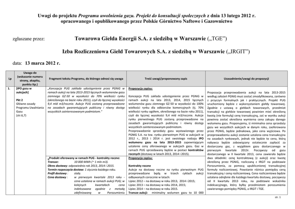 Uwagi do projektu Programu uwolnienia gazu. Projekt do konsultacji społecznych z dnia 13 lutego 2012 r. opracowanego i opublikowanego przez Polskie Górnictwo Naftowe i Gazownictwo Towarowa Giełda Energii S.A. z siedzibą w Warszawie („TGE”) zgłaszane przez: Izba Rozliczeniowa Giełd Towarowych S.A. z siedzibą w Warszawie („IRGIT”) data: 13 marca 2012 r. Lp 1. Uwaga do (wskazanie numeru strony, akapitu, punktu itp.) [IPO gazu w aukcjach] Pkt 2 Główne zasady Programu Uwalniania Gazu (str.6,7) Fragment tekstu Programu, do którego odnosi się uwaga „Koncepcja PUG zakłada udostępnienie przez PGNiG w ramach aukcji na lata 2013-2015 łącznych wolumenów gazu ziemnego GZ-50 w wysokości do 70% wielkości rynku (określonego na bazie roku 2011), czyli do łącznej wysokości 9,4 mld m3/rocznie. Aukcje PUG zostaną przeprowadzone na zasadach gwarantujących publiczny i równy dostęp wszystkich zainteresowanym podmiotom.” „Produkt oferowany w ramach PUG - kontrakty roczne: Transze: 10 000 MWh (~ 1 mln m3). Okres dostawy: odpowiednio rok 2013, 2014 i 2015. Termin rozpoczęcia dostaw: 1 stycznia każdego roku. Profil dostawy : stały. Cena dostawy : w pierwszym kwartale 2013 roku cena ustalona w ramach aukcji PUG; w kolejnych kwartałach cena indeksowana zgodnie z metodą zdefiniowaną w Porozumieniu Treśd uwagi/proponowany zapis Uzasadnienie/uwagi do propozycji Propozycja zapisu: Koncepcja PUG zakłada udostępnienie przez PGNiG w ramach aukcji na lata 2013, 2014, 2015 łącznych wolumenów gazu ziemnego GZ-50 w wysokości do 100% wielkości rynku dla odbiorców komercyjnych (tj. 70% wielkości rynku ogółem, określonego na bazie roku 2011), czyli do łącznej wysokości 9,4 mld m3/rocznie. Aukcje rynku pierwotnego PUG zostaną przeprowadzone na zasadach gwarantujących publiczny i równy dostęp wszystkich zainteresowanym podmiotom. Przeprowadzenie sprzedaży gazu wystawionego przez PGNIG S.A. na tzw. rynku pierwotnym PUG w aukcjach w 2012 r., 2013 i 2014 r. jest swoistego rodzaju IPO wolumenu gazu na lata 2013-2015 zapewniającym ustalenie ceny oferowanego w aukcjach gazu. Gaz w ramach PUG sprzedawany będzie w postaci kontraktów rocznych (dostawy w latach 2013, 2014 i 2015). Propozycja zapisu: Kontrakty roczne Aukcje na dostawy roczne na rynku pierwotnym PUG przeprowadzane będą w trzech cyklach aukcji odbywanych corocznie w latach: Lipiec 2012 – na dostawy w roku 2013, 2014 i 2015; Lipiec 2013 – na dostawy w roku 2014, 2015; Lipiec 2014 – na dostawy w roku 2015. Transze aukcji: minimalny wolumen gazu to 10 000 Propozycja przeprowadzenia aukcji na lata 2013-2015 według założeo PGNiG musi zostad zmodyfikowana, zarówno z przyczyn formalnych jak i praktycznych. Projekt PUG uruchomiony będzie z wykorzystaniem giełdy towarowej. Zgodnie z ustawą o giełdach towarowych, przedmiot transakcji na giełdzie towarowej powinien mied określoną kwotą (nie formułą) cenę transakcyjną, zaś w wyniku aukcji powinna zostad określona wymierna cena zakupu danego wolumenu gazu. Proponujemy, iż minimalna cena sprzedaży gazu we wszystkich aukcjach w danym roku, zaoferowana przez PGNiG, będzie jednakowa, jako cena wyjściowa. Po przeprowadzeniu aukcji zostanie ustalona cena transakcyjna na zasadach rynkowych, jednak nie będzie to cena, którą nabywca będzie zobowiązany ostatecznie zapłacid za dostarczany gaz, z wyjątkiem gazu dostarczanego w pierwszym kwartale 2013r. Począwszy od gazu dostarczanego w II kwartale 2013, cena zawierała będzie dwa składniki: cenę kontraktową (z aukcji) oraz kwotę określoną przez PGNiG, rozliczaną z IRGiT na podstawie Porozumienia, za pomocą upublicznionej transakcyjnej formuły rozliczeniowej. Powstanie różnica pomiędzy ceną transakcyjną i ceną rozliczeniową. Cena rozliczeniowa będzie ustalana odrębnie dla każdego kwartału dostawy, począwszy od II kwartału 2013 roku, na podstawie wskaźnika indeksacyjnego, który byłby przedmiotem porozumienia zawieranego pomiędzy PGNiG, a IRGiT i TGE. str. 1 Regulacyjnym. Kontrakty PUG zakładad będą obowiązek fizycznej dostawy, ale także fizycznego odbioru gazu na poziomie 100% zakontraktowanych wolumenów (czyli analogicznie jak ma to miejsce w przypadku handlu energią elektryczną na giełdzie towarowej). Uczestnicy aukcji będą jednak posiadali możliwośd odsprzedaży gazu w ramach rynku giełdowego. W ramach PUG gaz udostępniany będzie w systemie aukcyjnym organizowanym przy wsparciu giełdy towarowej. Zgodnie z wytycznymi Prezesa URE gaz będzie oferowany w ramach PUG w 5 aukcjach organizowanych w regularnych odstępach co 2 tygodnie. W każdej z aukcji udostępniane będzie do 1,9 mld m3 gazu dla każdego roku funkcjonowania PUG (ca 14% rynku). Po przeprowadzeniu aukcji PUG, na giełdzie towarowej zostanie uruchomiony rynek wtórny, na którym będzie możliwośd swobodnego obrotu gazem ziemnym. Na rynku wtórnym podmioty, które zakupiły gaz w ramach PUG będą mogły nim swobodnie handlowad. Handel na rynku wtórnym będzie mógł byd prowadzony zarówno na rynku giełdowym, jak i w ramach kontraktów bilateralnych (OTC)1, jak to się dzieje na wszystkich rozwiniętych rynkach gazu ziemnego. Gaz oferowany przez PGNiG w ramach aukcji PUG, a także gaz sprzedawany na rynku wtórnym, podlegad będą standardowym zasadom dotyczącym bilansowania, określonym w IRiESP oraz IRiESD.” 2. *Kształtowanie ceny gazu] Pkt 2 Główne zasady Programu Uwalniania Gazu (str.6,7) Pkt 3.4 Ad b) i c) Mechanizm kalkulacji ceny gazu oferowanego w ramach PUG; (str.11) Wyjściowa cena gazu oferowanego w ramach aukcji PUG, ustalana będzie w oparciu o cenę hurtową uwzględniającą średnie koszty pozyskania paliwa gazowego przez PGNiG ze wszystkich źródeł, uwzględniające: ˗koszty pozyskania gazu z importu dla całego portfolio importowego PGNiG, ˗koszty pozyskania gazu krajowego, wraz z należnym zwrotem z zaangażowanego kapitału, ˗koszty utrzymywania zapasów obo