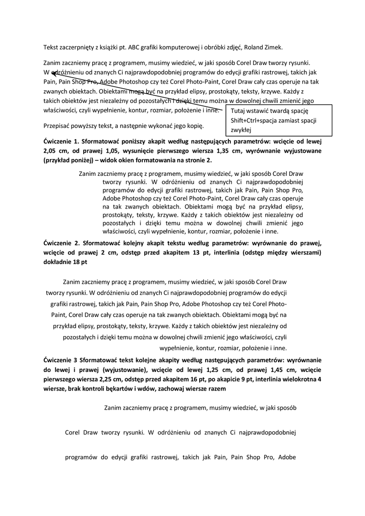Tekst zaczerpnięty z książki pt. ABC grafiki komputerowej i obróbki zdjęd, Roland Zimek. Zanim zaczniemy pracę z programem, musimy wiedzied, w jaki sposób Corel Draw tworzy rysunki. W odróżnieniu od znanych Ci najprawdopodobniej programów do edycji grafiki rastrowej, takich jak Pain, Pain Shop Pro, Adobe Photoshop czy też Corel Photo-Paint, Corel Draw cały czas operuje na tak zwanych obiektach. Obiektami mogą byd na przykład elipsy, prostokąty, teksty, krzywe. Każdy z takich obiektów jest niezależny od pozostałych i dzięki temu można w dowolnej chwili zmienid jego właściwości, czyli wypełnienie, kontur, rozmiar, położenie i inne. Tutaj wstawid twardą spację Shift+Ctrl+spacja zamiast spacji Przepisad powyższy tekst, a następnie wykonad jego kopię. zwykłej Ćwiczenie 1. Sformatowad poniższy akapit według następujących parametrów: wcięcie od lewej 2,05 cm, od prawej 1,05, wysunięcie pierwszego wiersza 1,35 cm, wyrównanie wyjustowane (przykład poniżej) – widok okien formatowania na stronie 2. Zanim zaczniemy pracę z programem, musimy wiedzied, w jaki sposób Corel Draw tworzy rysunki. W odróżnieniu od znanych Ci najprawdopodobniej programów do edycji grafiki rastrowej, takich jak Pain, Pain Shop Pro, Adobe Photoshop czy też Corel Photo-Paint, Corel Draw cały czas operuje na tak zwanych obiektach. Obiektami mogą byd na przykład elipsy, prostokąty, teksty, krzywe. Każdy z takich obiektów jest niezależny od pozostałych i dzięki temu można w dowolnej chwili zmienid jego właściwości, czyli wypełnienie, kontur, rozmiar, położenie i inne. Ćwiczenie 2. Sformatowad kolejny akapit tekstu według parametrów: wyrównanie do prawej, wcięcie od prawej 2 cm, odstęp przed akapitem 13 pt, interlinia (odstęp między wierszami) dokładnie 18 pt Zanim zaczniemy pracę z programem, musimy wiedzied, w jaki sposób Corel Draw tworzy rysunki. W odróżnieniu od znanych Ci najprawdopodobniej programów do edycji grafiki rastrowej, takich jak Pain, Pain Shop Pro, Adobe Photoshop czy też Corel PhotoPaint, Corel Draw cały czas operuje na tak zwanych obiektach. Obiektami mogą byd na przykład elipsy, prostokąty, teksty, krzywe. Każdy z takich obiektów jest niezależny od pozostałych i dzięki temu można w dowolnej chwili zmienid jego właściwości, czyli wypełnienie, kontur, rozmiar, położenie i inne. Ćwiczenie 3 Sformatowad tekst kolejne akapity według następujących parametrów: wyrównanie do lewej i prawej (wyjustowanie), wcięcie od lewej 1,25 cm, od prawej 1,45 cm, wcięcie pierwszego wiersza 2,25 cm, odstęp przed akapitem 16 pt, po akapicie 9 pt, interlinia wielokrotna 4 wiersze, brak kontroli bękartów i wdów, zachowaj wiersze razem Zanim zaczniemy pracę z programem, musimy wiedzied, w jaki sposób Corel Draw tworzy rysunki. W odróżnieniu od znanych Ci najprawdopodobniej programów do edycji grafiki rastrowej, takich jak Pain, Pain Shop Pro, Adobe Photoshop czy też Corel Photo-Paint, Corel Draw cały czas operuje na tak zwanych obiektach. Obiektami mogą byd na przykład elipsy, prostokąty, teksty, krzywe. Każdy z takich obiektów jest niezależny od pozostałych i dzięki temu można w dowolnej chwili zmienid jego właściwości, czyli wypełnienie, kontur, rozmiar, położenie i inne. Zrzuty okien dialogowych z ustawieniami (widok okien z Microsoft Word 2007 – znacząco nie odbiega od wyglądu okna w Ms Word 2003): Ćwiczenie 1. Ćwiczenie 2 Ćwiczenie 3 Ćwiczenia do samodzielnego wykonania: 1. Sformatowad treśd poniższego akapitu według parametrów: wcięcie od lewej 0, od prawej 3,55 cm, wyrównanie do środka, razem z następnym, bez kontroli bękartów i wdów. Zanim zaczniemy pracę z programem, musimy wiedzied, w jaki sposób Corel Draw tworzy rysunki. W odróżnieniu od znanych Ci najprawdopodobniej programów do edycji grafiki rastrowej, takich jak Pain, Pain Shop Pro, Adobe Photoshop czy też Corel Photo-Paint, Corel Draw cały czas operuje na tak zwanych obiektach. Obiektami mogą byd na przykład elipsy, prostokąty, teksty, krzywe. Każdy z takich obiektów jest niezależny od pozostałych i dzięki temu można w dowolnej chwili zmienid jego właściwości, czyli wypełnienie, kontur, rozmiar, położenie i inne. 2. Sformatowad treśd dwóch poniższych akapitów, każdy według innych parametrów: 1 akapit (tytuł) – wcięcie pierwszego wiersza 1,05 cm, wyrównanie do środka, wcięcie od lewej 2 cm, od prawej 2, cm, odstęp po akapicie 9 pt, razem z następnym, brak kontroli bękartów i wdów, 2 akapit wyjustowanie, wcięcie od lewej i prawej 0 cm, wcięcie pierwszego wiersza 1,45 cm, interlinia co najmniej 16 pt, kontrola bękartów i wdów, zachowaj wiersze razem Różnice między rysunkiem rastrowym a wektorowym – ABC grafiki komputerowej i obróbki zdjęd, Roland Zimek, Aleksandra Tomaszewska-Adamek. Zanim zaczniemy pracę z programem, musimy wiedzied, w jaki sposób Corel Draw tworzy rysunki. W odróżnieniu od znanych Ci najprawdopodobniej programów do edycji grafiki rastrowej, takich jak Pain, Pain Shop Pro, Adobe Photoshop czy też Corel Photo-Paint, Corel Draw cały czas operuje na tak zwanych obiektach. Obiektami mogą byd na przykład elipsy, prostokąty, teksty, krzywe. Każdy z takich obiektów jest niezależny od pozostałych i dzięki temu można w dowolnej chwili zmienid jego właściwości, czyli wypełnienie, kontur, rozmiar, położenie i inne. Formatowanie czcionki Kilka dwiczeo formatowania czcionki Ćwiczenie 1 Wykonad formatowanie czcionki w całym akapicie według parametrów: czcionka Verdana, rozmiar 13, kolor zielony. Zanim zaczniemy pracę z programem, musimy wiedzieć, w jaki sposób Corel Draw tworzy rysunki. W odróżnieniu od znanych Ci najprawdopodobniej programów do edycji grafiki rastrowej, takich jak Pain, Pain Shop Pro, Adobe Photoshop czy też Corel Photo-Paint, Corel Draw cały czas operuje na tak zwanych obiektach. Obiektami mogą być na przykład el