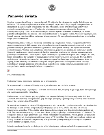 Panowie świata Średnia temperatura Ziemi w ciągu ostatnich 70 milionów lat nieustannie spada. Tak, Ziemia się ochładza. Taka wizja znajduje się w wielu naukowych rozprawach dotyczących izotopów tlenu, w skrzynkach planktonowych organizmów na dnie Atlantyku, które przedstawiają historyczny, geologiczny zapis temperatury. Pomimo to, międzynarodowa grupa ekspertów do zmian klimatycznych przy ONZ z wielkim medialnym hukiem ogłosiła niedawno informację, że nasza planeta niebezpiecznie się ociepla i że odpowiedzialni za to mogą być ludzie. Wiceszef tej grupy, Jean Jouzel, wezwał nas do walki ze zmianami klimatycznymi. Od tego globalnego ocieplenia przechodzą mi po plecach dreszcze. Wszyscy mają rację. Tylko, że niektórzy obchodzą się z nią bardzo różnie. Tak jak ministerstwo spraw wewnętrznych, które przed laty zabroniło mi zorganizowania weselnej ceremonii w lesie jodłowo-bukowym, ponieważ nadchodzą globalne, klimatyczne zmiany i nie będzie zachowana godność urzędu. Według pani urzędnik z ministerstwa, pojawiła się groźba, że państwowe godło Słowacji, zawieszone z okazji ceremonii, będzie niegodnie powiewać na wietrze spowodowanym globalnym ociepleniem, i może spaść z dębu. Podobnych argumentów używał pan z urzędu ds. lasu, kiedy zmuszał nas do wyrębów w naszym prywatnym rezerwacie, gdyż uważał, że drzewa, które rosły tam od niepamiętnych czasów, nie mogą wytrzymać natłoku tego nadchodzącego ciepła. A zapory, które mieliśmy ustawione na drogach leśnych przeciwko złodziejom drzewa, musimy natychmiast usunąć, ponieważ przeszkadzają samochodom straży pożarnej, gaszącej pożary w naszym lesie, wzniecone tym globalnym ociepleniem... Fot. Piotr Morawski Moje niewyraźne przeczucie zmieniło się w przekonanie. W argumentach o zmianach klimatycznych już od dawna nie chodzi o prawdę. Chodzi o manipulację i o politykę. I to w obu kierunkach. Tak, wszyscy mają rację, tylko że wybierają dla swoich argumentów różne lata. Podstawową cechą klimatu, gdy spoglądamy na niego w ludzkiej skali czasowej (setki lat), jest ZMIANA. Podstawową cechą klimatu, gdy na niego patrzymy z geologicznej czasowej skali (dziesięć tysięcy lat i więcej), jest STAŁOŚĆ. W ostatnich dziesięciu [a nie stu? Niżej pisze o stu, a i z rachunku i porównań wynika, że nie chodzi o te dziesięć] latach średnia temperatura podwyższyła się o 0,7oC. Przez 12,5 tys. lat średnia temperatura wzrosła o 7oC na każdy wiek! Zmiana temperatury była dziesięciokrotnie szybsza niż dziś. Styczniowe temperatury, za taki sam okres, podwyższyły się – to nie do wiary – o 20 stopni. To ocieplenie zostało nagle przerwane 200-letnim wyraźnym ochłodzeniem. Potem, przed 10 tysiącami lat, nastąpił wzrost średniej rocznej temperatury o 7oC co 50 lat. Była to 20 razy większa zmiana niż dzisiaj. O takich wahaniach temperatury, zdecydowanie przewyższających dzisiejsze ocieplenie, bardzo dobrze wie i Jean Jouzel. Istnieje zgoda naukowców co do tego, że takie klimatyczne zmiany zachodziły w przeszłości, i z Panowie świata 1 pewnością będą miały miejsce także w przyszłości. Niezależnie od działalności człowieka. Zmiany klimatu zawsze były, ale z drugiej strony nigdy nie przekroczyły one pewnej granicy. Np. produkcja ciepła słońca podwyższyła się o 25% od czasu, gdy na Ziemi powstało życie. I tak mogłoby nas w ogóle nie wzruszać podwyższenie lub opadanie temperatury o 0,7oC w ciągu 100 lat, ale moglibyśmy zainteresować się mechanizmami, które tę huśtawkę klimatu przez miliardy lat utrzymują w granicach przyjaznych dla życia. Tak się jednak nie dzieje. Tytułowe strony gazet zajmują się w tej kwestii globalnym ociepleniem, Kioto i naszym bohaterskim ministrem środowiska naturalnego, walczącym o zwiększenie limitów emisji. Dlaczego? Odpowiedzi nie należy szukać w nauce, lecz w polityce. Odpowiedzią jest jedno słowo: Biznes. Jeśli przyjmiemy wyobrażenie o nas, jako o panach świata, którzy najpierw naszą ziemską maszynę popsują, a później mądrzejsi, z miłością ją naprawią, wydaje się, że wszystko jest w naszych, ludzkich rękach. I możemy zacząć handlować. Uważa się, że globalne ocieplenie powodują cieplarniane gazy emitowane przez ludzi. Zdawałoby się, że w takiej sytuacji po prostu należy zaprzestać emisji gazów cieplarnianych. No, spróbujcie nie wypuszczać takiego cieplarnianego gazu, jakim jest metan... I dlatego zaczniemy gazami cieplarnianymi handlować. Słynny protokół z Kioto stworzył system międzynarodowego handlu emisją dwutlenku węgla. Państwo, które wytwarza dwutlenek węgla ponad określony limit, nie zmniejszy jego produkcji, lecz wykupi możliwość wypuszczania emisji od innego państwa, które swojego limitu nie wykorzystało. Dwutlenek węgla wyprodukuje się w takiej samej ilości, a biznes będzie się kręcił nadal. I o to chodzi. Druga możliwość jest taka, że rozwinięte państwo będzie wprawdzie nadal wypuszczać tlenek węgla do atmosfery, ale najmie gdzieś w Afryce jakąś organizację, która będzie za nich sadzić drzewka, tak by ilość związanego węgla z przyszłego lasu została odliczona od ilości emisji. Swój ekonomiczny wzrost wykupią sobie zalesieniem sawanny afrykańskiej. Jak wskazują naukowe rozprawy, chodzi o wielkie oszustwo. Jest to taka sama obłuda, jak i w poprzednim przykładzie. Wiatrowi i deszczowi rozkazywali kiedyś komuniści, a dziś jawnie robią to kapitaliści. Panowie świata. Naukowe rozprawy podkreślają, że kluczowymi ziemskimi ekosystemami dla akumulacji węgla są naturalne lasy umiarkowanej strefy. Nasze naturalne lasy. Zasoby węgla w przeciętnym gospodarczym lesie-plantacji to około 200-250 ton, natomiast w starym naturalnym lesie jodłowo-bukowym to około 700-900 ton. Jeśli wytniemy stary naturalny las i zamienimy go na las gospodarczy, to do atmosfery dos