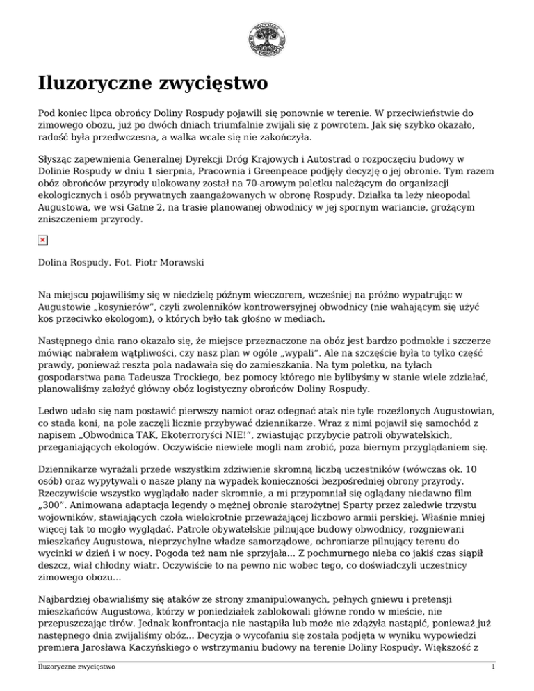 Iluzoryczne zwycięstwo Pod koniec lipca obrońcy Doliny Rospudy pojawili się ponownie w terenie. W przeciwieństwie do zimowego obozu, już po dwóch dniach triumfalnie zwijali się z powrotem. Jak się szybko okazało, radość była przedwczesna, a walka wcale się nie zakończyła. Słysząc zapewnienia Generalnej Dyrekcji Dróg Krajowych i Autostrad o rozpoczęciu budowy w Dolinie Rospudy w dniu 1 sierpnia, Pracownia i Greenpeace podjęły decyzję o jej obronie. Tym razem obóz obrońców przyrody ulokowany został na 70-arowym poletku należącym do organizacji ekologicznych i osób prywatnych zaangażowanych w obronę Rospudy. Działka ta leży nieopodal Augustowa, we wsi Gatne 2, na trasie planowanej obwodnicy w jej spornym wariancie, grożącym zniszczeniem przyrody. Dolina Rospudy. Fot. Piotr Morawski Na miejscu pojawiliśmy się w niedzielę późnym wieczorem, wcześniej na próżno wypatrując w Augustowie „kosynierów”, czyli zwolenników kontrowersyjnej obwodnicy (nie wahającym się użyć kos przeciwko ekologom), o których było tak głośno w mediach. Następnego dnia rano okazało się, że miejsce przeznaczone na obóz jest bardzo podmokłe i szczerze mówiąc nabrałem wątpliwości, czy nasz plan w ogóle „wypali”. Ale na szczęście była to tylko część prawdy, ponieważ reszta pola nadawała się do zamieszkania. Na tym poletku, na tyłach gospodarstwa pana Tadeusza Trockiego, bez pomocy którego nie bylibyśmy w stanie wiele zdziałać, planowaliśmy założyć główny obóz logistyczny obrońców Doliny Rospudy. Ledwo udało się nam postawić pierwszy namiot oraz odegnać atak nie tyle rozeźlonych Augustowian, co stada koni, na pole zaczęli licznie przybywać dziennikarze. Wraz z nimi pojawił się samochód z napisem „Obwodnica TAK, Ekoterroryści NIE!”, zwiastując przybycie patroli obywatelskich, przeganiających ekologów. Oczywiście niewiele mogli nam zrobić, poza biernym przyglądaniem się. Dziennikarze wyrażali przede wszystkim zdziwienie skromną liczbą uczestników (wówczas ok. 10 osób) oraz wypytywali o nasze plany na wypadek konieczności bezpośredniej obrony przyrody. Rzeczywiście wszystko wyglądało nader skromnie, a mi przypomniał się oglądany niedawno film „300”. Animowana adaptacja legendy o mężnej obronie starożytnej Sparty przez zaledwie trzystu wojowników, stawiających czoła wielokrotnie przeważającej liczbowo armii perskiej. Właśnie mniej więcej tak to mogło wyglądać. Patrole obywatelskie pilnujące budowy obwodnicy, rozgniewani mieszkańcy Augustowa, nieprzychylne władze samorządowe, ochroniarze pilnujący terenu do wycinki w dzień i w nocy. Pogoda też nam nie sprzyjała... Z pochmurnego nieba co jakiś czas siąpił deszcz, wiał chłodny wiatr. Oczywiście to na pewno nic wobec tego, co doświadczyli uczestnicy zimowego obozu... Najbardziej obawialiśmy się ataków ze strony zmanipulowanych, pełnych gniewu i pretensji mieszkańców Augustowa, którzy w poniedziałek zablokowali główne rondo w mieście, nie przepuszczając tirów. Jednak konfrontacja nie nastąpiła lub może nie zdążyła nastąpić, ponieważ już następnego dnia zwijaliśmy obóz... Decyzja o wycofaniu się została podjęta w wyniku wypowiedzi premiera Jarosława Kaczyńskiego o wstrzymaniu budowy na terenie Doliny Rospudy. Większość z Iluzoryczne zwycięstwo 1 nas wówczas nazbyt optymistycznie zinterpretowała deklarację premiera, jako całkowite wycofanie się z planowanej inwestycji w jej kontrowersyjnym wariancie. Jak się później okazało, nie chodziło wcale o zaniechanie prac, lecz o wstrzymanie ich jedynie na odcinkach chronionych przez sieć NATURA 2000. Tak więc budowa nadal trwa, ekolodzy wrócili do domu i wiele osób zadaje sobie pytanie, co będzie dalej z Rospudą? Oczywiście odpowiedź na to pytanie przyniesie czas, lecz jako uczestnik oraz współorganizator obozu, chciałbym pokusić się o ocenę tych kilku dni i garść osobistych refleksji. Trzeba uczciwie przyznać, że planowana akcja obrony Doliny Rospudy mogła być najtrudniejsza w historii polskiego ruchu ekologicznego. Głównie z powodu istnienia dobrze zorganizowanego oporu przeciwników. Dlatego decyzja o odkupieniu kawałka ziemi, zaraz w pobliżu Doliny, była na pewno bardzo dobrą ze strategicznego punktu widzenia. Na tej ziemi mogliśmy i na pewno jeszcze przez długi czas (choć nie wiadomo jak długi, ze względu na proces wywłaszczeniowy) będziemy mogli w miarę spokojnie przygotowywać się do działań na rzecz Rospudy, przyjmować media, odpoczywać itd. Z drugiej strony wydaje się, że zarówno Greenpeace jak i Pracownia trochę zaniedbały możliwość jeszcze lepszego zaistnienia w mediach. W sumie odwiedziło nas ok. 30 przedstawicieli różnych mediów. Dziennikarze byli nam na ogół przychylni, dobrze znali temat i mogli niemalże „jeść z ręki”. Spotkaliśmy zaledwie dwóch lub trzech reporterów, którzy opowiadali się za obwodnicą w jej kontrowersyjnym kształcie. Jak być może niektórzy się orientują, osobiste zdanie dziennikarza lub jego przełożonych ma największy wpływ na ostateczny kształt materiału prasowego. Mimo olbrzymiego zainteresowania mediów, potencjał ten nie został dostatecznie wykorzystany. W obozie brakowało przede wszystkim, dobrze znających temat, rzeczników GP bądź PNRWI, którzy nie pojawili się wcale lub tylko na chwilę. Obecność rzeczników prasowych na głównym miejscu wydarzeń byłaby wskazana głównie z uwagi na złożoność problemu augustowskiej obwodnicy, społecznego protestu itd. Myślę też, że przydałaby się lepsza komunikacja wewnętrzna. Uczestnicy obozu, rekrutujący się najczęściej z osób niezwiązanych zawodowo z ruchem ekologicznym, powinni otrzymywać lepsze informacje na temat tego, co się działo, nie mówiąc już o zwykłym podziękowaniu za podjęcie trudu przyjazdu itd. Oczywiście nikt nie oczekuje podzięko