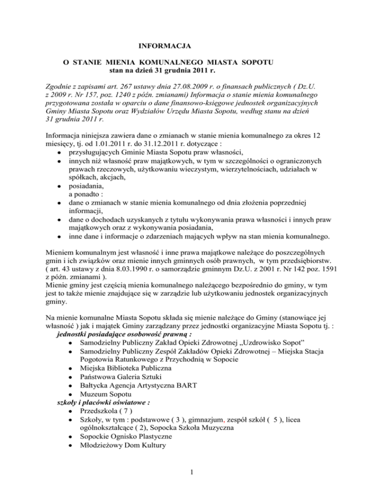 INFORMACJA O STANIE MIENIA KOMUNALNEGO MIASTA SOPOTU stan na dzień 31 grudnia 2011 r. Zgodnie z zapisami art. 267 ustawy dnia 27.08.2009 r. o finansach publicznych ( Dz.U. z 2009 r. Nr 157, poz. 1240 z późn. zmianami) Informacja o stanie mienia komunalnego przygotowana została w oparciu o dane finansowo-księgowe jednostek organizacyjnych Gminy Miasta Sopotu oraz Wydziałów Urzędu Miasta Sopotu, według stanu na dzień 31 grudnia 2011 r. Informacja niniejsza zawiera dane o zmianach w stanie mienia komunalnego za okres 12 miesięcy, tj. od 1.01.2011 r. do 31.12.2011 r. dotyczące : przysługujących Gminie Miasta Sopotu praw własności, innych niż własność praw majątkowych, w tym w szczególności o ograniczonych prawach rzeczowych, użytkowaniu wieczystym, wierzytelnościach, udziałach w spółkach, akcjach, posiadania, a ponadto : dane o zmianach w stanie mienia komunalnego od dnia złożenia poprzedniej informacji, dane o dochodach uzyskanych z tytułu wykonywania prawa własności i innych praw majątkowych oraz z wykonywania posiadania, inne dane i informacje o zdarzeniach mających wpływ na stan mienia komunalnego. Mieniem komunalnym jest własność i inne prawa majątkowe należące do poszczególnych gmin i ich związków oraz mienie innych gminnych osób prawnych, w tym przedsiębiorstw. ( art. 43 ustawy z dnia 8.03.1990 r. o samorządzie gminnym Dz.U. z 2001 r. Nr 142 poz. 1591 z późn. zmianami ). Mienie gminy jest częścią mienia komunalnego należącego bezpośrednio do gminy, w tym jest to także mienie znajdujące się w zarządzie lub użytkowaniu jednostek organizacyjnych gminy. Na mienie komunalne Miasta Sopotu składa się mienie należące do Gminy (stanowiące jej własność ) jak i majątek Gminy zarządzany przez jednostki organizacyjne Miasta Sopotu tj. : jednostki posiadające osobowość prawną : Samodzielny Publiczny Zakład Opieki Zdrowotnej „Uzdrowisko Sopot” Samodzielny Publiczny Zespół Zakładów Opieki Zdrowotnej – Miejska Stacja Pogotowia Ratunkowego z Przychodnią w Sopocie Miejska Biblioteka Publiczna Państwowa Galeria Sztuki Bałtycka Agencja Artystyczna BART Muzeum Sopotu szkoły i placówki oświatowe : Przedszkola ( 7 ) Szkoły, w tym : podstawowe ( 3 ), gimnazjum, zespół szkół ( 5 ), licea ogólnokształcące ( 2), Sopocka Szkoła Muzyczna Sopockie Ognisko Plastyczne Młodzieżowy Dom Kultury 1 Centrum Kształcenia Ustawicznego Poradnia Psychologiczno-Pedagogiczna inne : Dom Dziecka „Na Wzgórzu” Żłobek Puchatek Miejski Ośrodek Pomocy Społecznej Miejski Ośrodek Sportu i Rekreacji Zakład Oczyszczania Miasta Zarząd Dróg i Zieleni w Sopocie Dom Pomocy Społecznej oraz przez kluby sportowe , Schronisko dla bezdomnych zwierząt I. Majątek Sopotu – miasta na prawach powiatu Sopot jako miasto na prawach powiatu posiada mienie stanowiące własność powiatu, na które składają się 103 działki gruntu o łącznej powierzchni 34,2457 ha o wartości początkowej 166 447 107,00 zł. Jednostki organizacyjne Miasta Sopotu tj. : Centrum Kształcenia Ustawicznego Poradnia Psychologiczno-Pedagogiczna Dom Dziecka Na Wzgórzu posiadają budynki i budowle, urządzenia techniczne i maszyny oraz pozostałe środki trwałe stanowiące własność Sopotu – miasta na prawach powiatu, o łącznej wartości netto : 1 729 163,11 zł. Wartość ta zwiększyła się o wartość wykonanych przez Centrum Kształcenia Ustawicznego schodów wejściowych (82 078 zł.), zakupionego monitoringu (22 088,34 zł.). Na wartość przedmiotowego majątku miały wpływ również odpisy amortyzacyjne dokonywane przez te jednostki. Na terenie Sopotu znajduje się 26 dróg powiatowych o łącznej długości 25,7 km. Wartość netto dróg wykazywana w ewidencji księgowej ZDiZ w Sopocie wynosi 20 357 809,69 zł. Ogółem wartość majątku Sopotu – miasta na prawach powiatu - wynosi na dzień 31.12.2011 r. 188 534 079,80 zł. 2 II. Majątek Gminy Miasta Sopotu W tabeli nr 1 podano wartość majątku trwałego netto (ogółem) stanowiącego własność Gminy Miasta Sopotu wykazywanego w ewidencji księgowej : Urzędu Miasta Sopotu, jednostek organizacyjnych gminy, klubów sportowych, Schroniska dla bezdomnych zwierząt Tabela nr 1 Wartość majątku trwałego netto stanowiącego własność Gminy Miasta Sopotu- ogółem stan na dzień 31.12.2011 r. Lp. 1 1.1. 1.2. 2. 2.1 2.2 Wyszczególnienie Wartość w zł. Rzeczowe aktywa trwałe 723 203 727,20 442 814 155,09 Urząd Miasta Sopotu Jednostki organizacyjne GMS Pozostałe aktywa trwałe 280 389 572,11 115 055 915,04 115 009 008,27 Urząd Miasta Sopotu Jednostki organizacyjne GMS AKTYWA TRWAŁE OGÓŁEM: 46 906,77 838 259 642,24 3 Wartość majątku trwałego stanowiącego własność Gminy Miasta Sopotu ogółem, stan na dzień 31.12.2011 r., w mln zł 280,39 Jednostki organizacyjne GMS Urząd Miasta Sopotu 442,81 115,01 Rzeczowe aktywa trwałe Pozostałe aktywa trwałe Tabela nr 2 Wartość (netto) aktywów trwałych wykazywanych w ewidencji księgowej Urzędu Miasta Sopotu stan na dzień 31.12.2011 r. Lp. Wyszczególnienie Wartość w zł. 442 814 155,09 1. Rzeczowe aktywa trwałe 1.1. Środki trwałe 1.2. Inne środki trwałe 1.3. Środki trwałe w budowie 122 034 829,66 Pozostałe aktywa trwałe 115 009 008,27 2. 320 779 325,43 0, 00 2.1 Wartości niematerialne i prawne 2.2. Długoterminowe aktywa finansowe 114 934 600,00 Aktywa trwałe ogółem 557 823 163,36 74 408,27 W tabeli nr 2 w pkt. 1.1 ujęto m.in. grunty oraz budynki wchodzące do gminnego zasobu nieruchomości ( bez budynków wykazywanych w ewidencji księgowej jednostek organizacyjnych Gminy Miasta Sopotu, klubów sportowych oraz Schroniska dla bezdomnych zwierząt). 4 W okresie sprawozdawczym objętym niniejszą Informacją zakończono m.in. szereg inwestycji związanych m.in. z budową Domu Pomocy Społecznej, z termomodernizacją obiektów oświatowych, z budową Orlików. Wykazywane środki trwałe w budowie to m.in. inwest