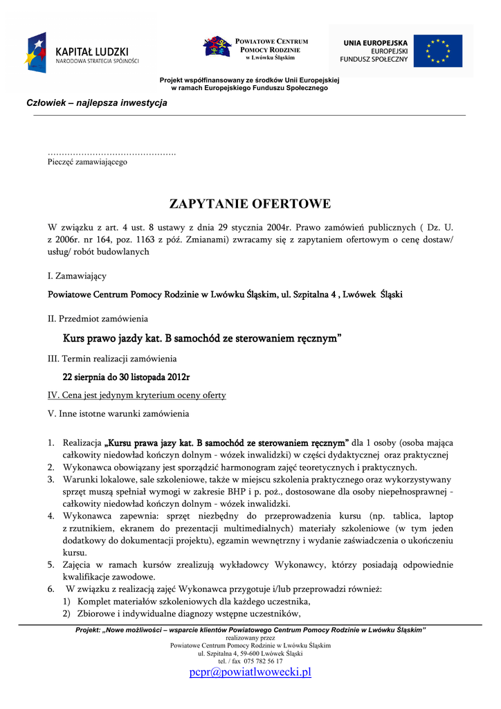 N POWIATOWE CENTRUM POMOCY RODZINIE w Lwówku Śląskim Projekt współfinansowany ze środków Unii Europejskiej w ramach Europejskiego Funduszu Społecznego Człowiek – najlepsza inwestycja ………………………………………. Pieczęć zamawiającego ZAPYTANIE OFERTOWE W związku z art. 4 ust. 8 ustawy z dnia 29 stycznia 2004r. Prawo zamówień publicznych ( Dz. U. z 2006r. nr 164, poz. 1163 z póź. Zmianami) zwracamy się z zapytaniem ofertowym o cenę dostaw/ usług/ robót budowlanych I. Zamawiający Powiatowe Centrum Pomocy Rodzinie w Lwówku Śląskim, ul. Szpitalna 4 , Lwówek Śląski II. Przedmiot zamówienia Kurs prawo jazdy kat. B samochód ze sterowaniem ręcznym” III. Termin realizacji zamówienia 22 sierpnia do 30 listopada 2012r IV. Cena jest jedynym kryterium oceny oferty V. Inne istotne warunki zamówienia 1. Realizacja „Kursu prawa jazy kat. B samochód ze sterowaniem ręcznym” dla 1 osoby (osoba mająca całkowity niedowład kończyn dolnym - wózek inwalidzki) w części dydaktycznej oraz praktycznej 2. Wykonawca obowiązany jest sporządzić harmonogram zajęć teoretycznych i praktycznych. 3. Warunki lokalowe, sale szkoleniowe, także w miejscu szkolenia praktycznego oraz wykorzystywany sprzęt muszą spełniał wymogi w zakresie BHP i p. poż., dostosowane dla osoby niepełnosprawnej całkowity niedowład kończyn dolnym - wózek inwalidzki. 4. Wykonawca zapewnia: sprzęt niezbędny do przeprowadzenia kursu (np. tablica, laptop z rzutnikiem, ekranem do prezentacji multimedialnych) materiały szkoleniowe (w tym jeden dodatkowy do dokumentacji projektu), egzamin wewnętrzny i wydanie zaświadczenia o ukończeniu kursu. 5. Zajęcia w ramach kursów zrealizują wykładowcy Wykonawcy, którzy posiadają odpowiednie kwalifikacje zawodowe. 6. W związku z realizacją zajęć Wykonawca przygotuje i/lub przeprowadzi również: 1) Komplet materiałów szkoleniowych dla każdego uczestnika, 2) Zbiorowe i indywidualne diagnozy wstępne uczestników, Projekt: „Nowe możliwości – wsparcie klientów Powiatowego Centrum Pomocy Rodzinie w Lwówku Śląskim” realizowany przez Powiatowe Centrum Pomocy Rodzinie w Lwówku Śląskim ul. Szpitalna 4, 59-600 Lwówek Śląski tel. / fax 075 782 56 17 [email protected] POWIATOWE CENTRUM POMOCY RODZINIE w Lwówku Śląskim Projekt współfinansowany ze środków Unii Europejskiej w ramach Europejskiego Funduszu Społecznego Człowiek – najlepsza inwestycja 3) Bieżący monitoring prowadzonego działania, w tym kompletowanie listy obecności i indywidualnych kart uczestników na każdym spotkaniu, prowadzenie bieżącego opisu działań i niezwłoczne informowanie pracowników socjalnych lub kierownika jednostki o jakichkolwiek nieprawidłowościach powstających w trakcie realizacji zajęć, 4) Ewaluację z raportem końcowym po zakończeniu prowadzonych działań ze szczególnym uwzględnieniem celów i rezultatów przyjętych w projekcie 5) Po zakończeniu zajęć przygotuje dla każdego uczestnika zaświadczenie/certyfikat/ dyplom ukończenia zajęć wraz z listą ich odbioru przez beneficjentów, skompletowanie teczek osobowych każdego uczestnika, 6) Jeden komplet materiałów (szkoleniowych lub opis przeprowadzonych działań) użytych podczas zajęć, w celu archiwizacji dokumentacji projektu. 7. Cena oferty za przeprowadzenie Kursu prawa jazy kat B winna obejmować wynagrodzenie za 1 osobę: a) tytułem przeprowadzenia kursu prawa jazdy, b) tytułem przeprowadzenia koniecznych badań lekarskich w związku z realizacją kursu prawa jazdy, c) tytułem opłaty za pierwszy egzamin państwowy d) oraz łączne wynagrodzenie Wykonawcy określone w lit. a, lit b i lit. c 8. Wszelkie dokumenty wydawane przez Wykonawcę, dotyczące uczestnictwa osób w szkoleniu, powinny zawierać informacje zgodne z wytycznymi dotyczącymi oznaczenia projektów w ramach Programu Operacyjnego Kapitał Ludzki według poniższego wzoru : Wersja kolorowa: Powiatowe Centrum Pomocy Rodzinie w Lwówku Śląskim Projekt współfinansowany ze środków Unii Europejskiej w ramach Europejskiego Funduszu Społecznego Człowiek – najlepsza inwestycja Projekt: „Nowe możliwości – wsparcie klientów Powiatowego Centrum Pomocy Rodzinie w Lwówku Śląskim” realizowany przez Powiatowe Centrum Pomocy Rodzinie w Lwówku Śląskim ul. Szpitalna 4, 59-600 Lwówek Śląski tel. / fax 075 782 56 17 [email protected] POWIATOWE CENTRUM POMOCY RODZINIE w Lwówku Śląskim Projekt współfinansowany ze środków Unii Europejskiej w ramach Europejskiego Funduszu Społecznego Człowiek – najlepsza inwestycja Wersja czarno-biała: Powiatowe Centrum Pomocy Rodzinie w Lwówku Śląskim Projekt współfinansowany ze środków Unii Europejskiej w ramach Europejskiego Funduszu Społecznego Człowiek – najlepsza inwestycja VI. Sposób przygotowania oferty. Ofertę sporządzić należy na załączonym druku „OFERTA” Ofertę sporządzić należy w języku polskim, w formie pisemnej, na maszynie, komputerze, nieścieralnym atramentem lub długopisem. Oferta winna być podpisana przez osobę upoważnioną. W przypadku składania oferty w siedzibie Zamawiającego lub pocztą na kopercie należy umieścić napis „ Zapytanie Zapytanie ofertowe na Kurs prawo jazdy kat. B samochód ze sterowaniem ręcznym””. ręcznym””. 1. Ofertę złożyć można osobiście u zamawiającego, pocztą, pocztą elektroniczną na adres: [email protected] wpisując w temacie wiadomości „Zapytanie ofertowe na Kurs prawo jazdy kat. B samochód ze sterowaniem ręcznym” lub faksem pod numer 075 782 56 17 2. Miejsce i termin złożenia oferty. Ofertę złożyć należy do dnia 16.08.2012r do godz 12:00. Rozpatrzenie ofert nastąpi dnia 16.08.2012r o godz: 13:00 ………….………………………………… ( data, podpis oferenta) W załączeniu: Wzór Oferty – załącznik nr 1 Oświadczenie o niepodleganiu wykluczeniu – załącznik nr 2 Projekt: „Nowe mo