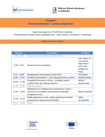 Program Forum praktyków – panelu ekspertów organizowanego przy IV Konferencji naukowej Funkcjonowanie współczesnych przedsiębiorstw – nowe trendy w zarządzaniu i marketingu Gdańsk, 19 września 2013 r. Godziny 8:30 – 9:00 9:00 – 9:15 9:15 – 10:00 10:00 – 10:45 10:45 – 11:30 11:30 – 11:45 11:45 – 12:30 12:30 – 13:15 13:15 – 14:00 Prezentacja Rejestracja uczestników i powitalna kawa Otwarcie Forum praktyków Zintegrowana komunikacja w Internecie Osobiste przywództwo – czyli moja gotowość na sukces Przepływy finansowe w firmie – zarządzaj swoimi środkami tak, aby uniknąć zatorów Przerwa kawowa Współpracuj na odległość bez wychodzenia z biura – nowoczesne narzędzia internetowe do zdalnego zarządzania firmą Podbij zagraniczne rynki- analiza popularnych metod pozyskiwania zagranicznych klientów Obiad Prelegent prof. nadzw. dr hab. Monika BoguszewiczKreft oraz Małgorzata Popis Piotr Bucki Monika Reszko Michał Komorowski Marcin Kowalik Rafał Kruczkowski 9:15 – 10:00 Zintegrowana komunikacja w Internecie Bogactwo narzędzi i kanałów komunikacji pozostających do dyspozycji każdego marketingowca jest – dzięki nowym technologiom – ogromne. Jak odnaleźć się w gąszczu możliwości, na jakie narzędzia najlepiej postawić i – wreszcie – czy są jakieś złote reguły dotyczące komunikacji na tak wielu płaszczyznach. Na te pytania odpowiemy, prezentując wszystkie narzędzia, uniwersalny model komunikacji oparty na AIDA. Omówimy w szczególności narzędzia w mediach społecznościowych i w obszarze e-mail marketingu. Prowadzenie: Piotr Bucki – ekspert komunikacji marketingowej. Współwłaściciel firmy szkoleniowej Nowe Kompetencje. Współpracuje z polskimi i zagranicznymi firmami przy tworzeniu i wdrażaniu komunikacji marketingowej. Był menadżerem projektów m.in. w Grupie Nokaut S.A., Word Travel Passport, NextData. Stały współpracownik magazynów „MaleMen”, „Dolce Vita”, „Charakterów” i innych. Trener i wykładowca, certyfikowany coach z wieloletnim doświadczeniem. Absolwent Politechniki Gdańskiej, Wyższej Szkoły Bankowej oraz Szkoły Wyższej Psychologii Społecznej, a także kursów Uniwersytetu Stanforda i Princeton. www.bucki.pro, www.nowekompetencje.pl 10:00 – 10:45 Osobiste przywództwo - czyli moja gotowość na sukces Prowadzenie własnej firmy to nie tylko wiedza, i zdrowy rozsądek. To najczęściej ryzyko, emocje i trudne decyzje. Konfrontujemy się ze stanami od zadowolenia, wręcz euforii, do zażenowania, zmęczenia, rezygnacji. Tu potrzebne są stabilne zasoby wewnętrzne: motywacja, zdecydowanie, entuzjazm i kilka innych. Zapraszamy na przewrotną prezentację o radościach i smutkach własnego biznesu, w trakcie której dowiesz się: Jak sprawdzić swoją gotowość/dojrzałość biznesową? Czy pozytywne myślenie działa? Dlaczego jedni odnoszą sukces, a inni poddają się w połowie drogi? Czy można zabezpieczyć się przed porażką? Czy kreatywność jest domeną wybrańców? Co jeszcze prowadzi do sukcesu? Prowadzenie: Monika Reszko – executive coach, badacz, trener kompetencji społecznych, autorka projektów rozwojowych, pomysłodawczyni i organizatorka konferencji, seminariów i turniejów sportowych. Ukończyła studia na Uniwersytecie im. Mikołaja Kopernika oraz Université Nancy 2 we Francji. Ukończyła także menadżerskie studium podyplomowe na Wydziale Zarządzania Politechniki Gdańskiej, jak również studium Train the Trainers na Wyższej Szkole Bankowej. Aktualnie realizuje indywidualny program magisterski w Szkole Wyższej Psychologii Społecznej. Od sierpnia 2011 r. Realizuje autorski program pod nazwą Inicjatywa Pracodawca z Wyboru. www.reszko.eu 10:45 – 11:30 Przepływy finansowe w firmie – zarządzaj swoimi środkami tak, aby uniknąć zatorów Jak powiedział kiedyś Arystoteles Onasis, pieniądza nie należy gonić, trzeba wyjść mu naprzeciw. Aby nie wdać się w taką karkołomną pogoń, warto poznać mechanizmy i zasady pozwalające na efektywniejsze zarządzanie pieniądzem. Jeżeli nadal główną stosowaną przez Ciebie metodą zarządzania finansami jest sprawdzanie stanu konta, to panel ten jest właśnie dla Ciebie. Dowiedz się, dlaczego planowanie budżetu i modelowanie przepływów finansowych to zadania warte uwagi każdego przedsiębiorcy, bez względu na skalę biznesu. Prowadzenie: Michał Komorowski, kierownik działu ekonomicznego Gdańskiej Infrastruktury WodnoKanalizacyjnej Sp. z o.o., zawodowo zajmujący się modelowaniem przepływów finansowych wynikających z realizowanych przez różne instytucje projektów inwestycyjnych, polegających w większości przypadków na budowie, bądź rozbudowie infrastruktury technicznej różnego typu. Doktorant zarządzania na Uniwersytecie Gdańskim. 11:45 – 12:30 Współpracuj na odległość bez wychodzenia z biura – nowoczesne narzędzia internetowe do zdalnego zarządzania firmą Prowadzenie biznesu w XXI wieku pozwala na korzystanie z ogromnego wyboru narzędzi, aplikacji i różnego rodzaju rozwiązań informatycznych, usprawniających i ułatwiających codzienne zarządzanie firmą. W ramach tego panelu poznasz metody komunikacji z pracownikami prostsze i tańsze niż połączenie telefoniczne, dowiesz się, że wymiana dokumentów poprzez wysłanie ich mailem to niekoniecznie najefektywniejsze rozwiązanie, a także poznasz prosty sposób pozwalający sprawdzić co właśnie czyta Bill Gates. Prowadzenie: Marcin Kowalik – dyrektor w Gemstone Partners, specjalizującej się w budowie wartości spółek. W latach 2009-2011 zaangażowany w rozwój Grupy RoboNET. Wcześniej, w latach 2007-2009 współtworzył i kierował TA Group – dostawcę innowacyjnych rozwiązań informatycznych. W okresie jego pracy obie spółki zanotowały kilkukrotny wzrost przychodów. Ukończył Wyższą Szkołę Handlu i Prawa oraz studia podyplomowe z zakresu controllingu. Obecnie jest dok