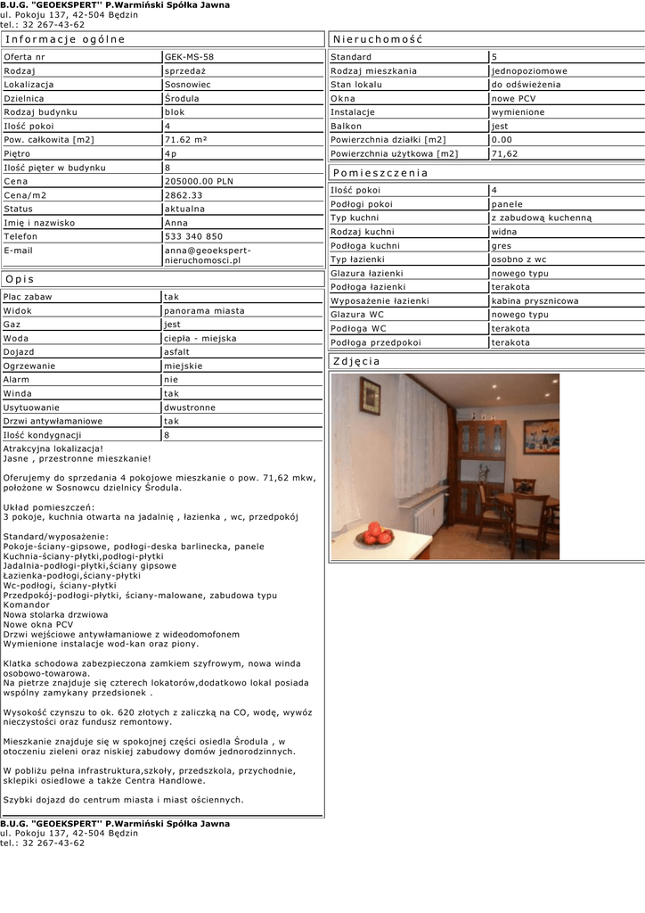 B.U.G. "GEOEKSPERT'' P.Warmiński Spółka Jawna ul. Pokoju 137, 42-504 Będzin tel.: 32 267-43-62 Informacje ogólne Nieruchomość Oferta nr GEK-MS-58 Standard 5 Rodzaj sprzedaż Rodzaj mieszkania jednopoziomowe Lokalizacja Sosnowiec Stan lokalu do odświeżenia Dzielnica Środula Okna nowe PCV Rodzaj budynku blok Instalacje wymienione Ilość pokoi 4 Balkon jest Pow. całkowita [m2] 71.62 m² Powierzchnia działki [m2] 0.00 Piętro 4p Powierzchnia użytkowa [m2] 71,62 Ilość pięter w budynku 8 Cena 205000.00 PLN Cena/m2 2862.33 Status aktualna Imię i nazwisko Anna Telefon 533 340 850 E-mail [email protected] Opis Pomieszczenia Ilość pokoi 4 Podłogi pokoi panele Typ kuchni z zabudową kuchenną Rodzaj kuchni widna Podłoga kuchni gres Typ łazienki osobno z wc Glazura łazienki nowego typu Podłoga łazienki terakota Plac zabaw tak Wyposażenie łazienki kabina prysznicowa Widok panorama miasta Glazura WC nowego typu Gaz jest Podłoga WC terakota Woda ciepła - miejska Podłoga przedpokoi terakota Dojazd asfalt Ogrzewanie miejskie Alarm nie Winda tak Usytuowanie dwustronne Drzwi antywłamaniowe tak Ilość kondygnacji 8 Atrakcyjna lokalizacja! Jasne , przestronne mieszkanie! Oferujemy do sprzedania 4 pokojowe mieszkanie o pow. 71,62 mkw, położone w Sosnowcu dzielnicy Środula. Układ pomieszczeń: 3 pokoje, kuchnia otwarta na jadalnię , łazienka , wc, przedpokój Standard/wyposażenie: Pokoje-ściany-gipsowe, podłogi-deska barlinecka, panele Kuchnia-ściany-płytki,podłogi-płytki Jadalnia-podłogi-płytki,ściany gipsowe Łazienka-podłogi,ściany-płytki Wc-podłogi, ściany-płytki Przedpokój-podłogi-płytki, ściany-malowane, zabudowa typu Komandor Nowa stolarka drzwiowa Nowe okna PCV Drzwi wejściowe antywłamaniowe z wideodomofonem Wymienione instalacje wod-kan oraz piony. Klatka schodowa zabezpieczona zamkiem szyfrowym, nowa winda osobowo-towarowa. Na pietrze znajduje się czterech lokatorów,dodatkowo lokal posiada wspólny zamykany przedsionek . Wysokość czynszu to ok. 620 złotych z zaliczką na CO, wodę, wywóz nieczystości oraz fundusz remontowy. Mieszkanie znajduje się w spokojnej części osiedla Środula , w otoczeniu zieleni oraz niskiej zabudowy domów jednorodzinnych. W pobliżu pełna infrastruktura,szkoły, przedszkola, przychodnie, sklepiki osiedlowe a także Centra Handlowe. Szybki dojazd do centrum miasta i miast ościennych. B.U.G. "GEOEKSPERT'' P.Warmiński Spółka Jawna ul. Pokoju 137, 42-504 Będzin tel.: 32 267-43-62 Zdjęcia