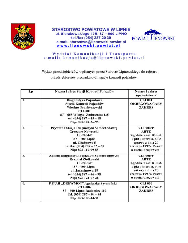 STAROSTWO POWIATOWE W LIPNIE ul. Sierakowskiego 10B, 87 – 600 LIPNO tel./fax (054) 287 20 39 e-mail: [email protected] www.lipnowski.powiat.pl Wy d z i a ł K o m u n i k a c j i i Tr a n s p o r t u e-mail: [email protected] Wykaz przedsiębiorców wpisanych przez Starostę Lipnowskiego do rejestru przedsiębiorców prowadzących stacje kontroli pojazdów. Lp Nazwa i adres Stacji Kontroli Pojazdów Numer i zakres upoważnienia 1. Diagnostyka Pojazdowa Stacja Kontroli Pojazdów Wiesław Przybyszewski CLI/001 87 – 603 Wielgie Zaduszniki 135 tel. (054) 287 – 15 – 18 Nip: 893-124-26-95 CLI 001 OKRĘGOWA CAŁY ZAKRES 4. Prywatna Stacja Diagnostyki Samochodowej Grzegorz Nawrocki CLI/004/P 87 – 600 Lipno ul. Chabrowa 5 Tel./fax (054) 287 – 32 – 60 Nip: 893-117-99-85 CLI 004/P ABTE Zgodnie z art. 83 ust. 1 pkt 1 litera a, b i c ustawy z dnia 20 czerwca 1997r. Prawo o ruchu drogowym 5. Zakład Diagnostyki Pojazdów Samochodowych Ryszard Ziółkowski CLI/005/P 87 – 600 Lipno ul. Jaśminowa 19 tel.( 054) 287 – 46 – 98 Nip: 893-121-07-26 CLI 005/P ABTE Zgodnie z art. 83 ust. 1 pkt 1 litera a, b i c ustawy z dnia 20 czerwca 1997r. Prawo o ruchu drogowym 6. P.P.U.H ,,DREWMOT” Agnieszka Szymańska CLI/006 87 – 600 Lipno Radomice 119 Tel. (054) 287 – 94 – 91 Nip: 893-100-14-31 CLI 006 OKRĘGOWA CAŁY ZAKRES 7. P.U.H. ROM – MAR Roman Krygier, Marek Szymański CLI/008/P 87 – 600 Lipno, ul. Wyszyńskiego 46 Nip:466-036-47-79 tel. 664846222 8. PHU SOJAR A.A.J. Romanowscy Spółka Jawna CLI 009 87-620 Kikół, Lubin 90 Nip: 892-13-89-623 tel. 54 444 02 71 CLI008/P ABTE Zgodnie z art. 83 ust. 1 pkt 1 litera a, b i c ustawy z dnia 20 czerwca 1997r. Prawo o ruchu drogowym CLI009 OKRĘGOWA CAŁY ZAKRES 9. „NEVADA – BIS” Stella Podkowska CLI/010 87 – 630 Skępe, ul. Klasztorna Nip: 7742377643 tel. 054 287 76 94 CLI010 OKRĘGOWA CAŁY ZAKRES 10. Ryszard Ziółkowski Zakład Diagnostyki Pojazdów Samochodowych CLI011 OKRĘGOWA CAŁY ZAKRES CLI011 87 – 605 Tłuchowo, ul. Leśna 18/2 8931210726 tel. 54 230 40 31 11. KR MOTO Spółka z Ograniczona Odpowiedzialnością CLI012 87 – 610 Dobrzyń nad Wisłą, ul. Królowej Jadwigi 2a Nip: 4660418044 CLI012 OKRĘGOWA CAŁY ZAKRES tel. 54 253 12 12 OBJAŚNIENIA: Symbole rodzajów pojazdów: A - motocykle i motorowery, B - pojazdy samochodowe o dopuszczalnej masie całkowitej do 3,5 t, z wyłączeniem motocykli i motorowerów, C - pojazdy samochodowe o dopuszczalnej masie całkowitej powyżej 3,5 t do 16 t lub CC - pojazdy samochodowe o dopuszczalnej masie całkowitej powyżej 3,5 t, D - autobusy o dopuszczalnej masie całkowitej powyżej 3,5 t, T - ciągniki rolnicze, E - przyczepy przeznaczone do łączenia z pojazdami silnikowymi, do których jest upoważniona stacja kontroli pojazdów. Symbole rodzajów badań: a - autobusów, których dopuszczalna prędkość na autostradzie i drodze ekspresowej wynosi 100 km/h, c - pojazdów przystosowanych do zasilania gazem, d - pojazdów zarejestrowanych po raz pierwszy za granicą lub pojazdów nowego typu wyprodukowanych lub importowanych w ilości jednej sztuki rocznie, e - pojazdów skierowanych na badania techniczne przez organ kontroli ruchu drogowego lub starostę, dla których wymagane jest specjalistyczne badanie, oraz pojazdów, w których dokonano zmian konstrukcyjnych lub wymiany elementów powodujących zmianę danych w dowodzie rejestracyjnym, f - pojazdu marki "SAM" co do zgodności z warunkami technicznymi, h - umieszczanie nadanych cech identyfikacyjnych pojazdu.