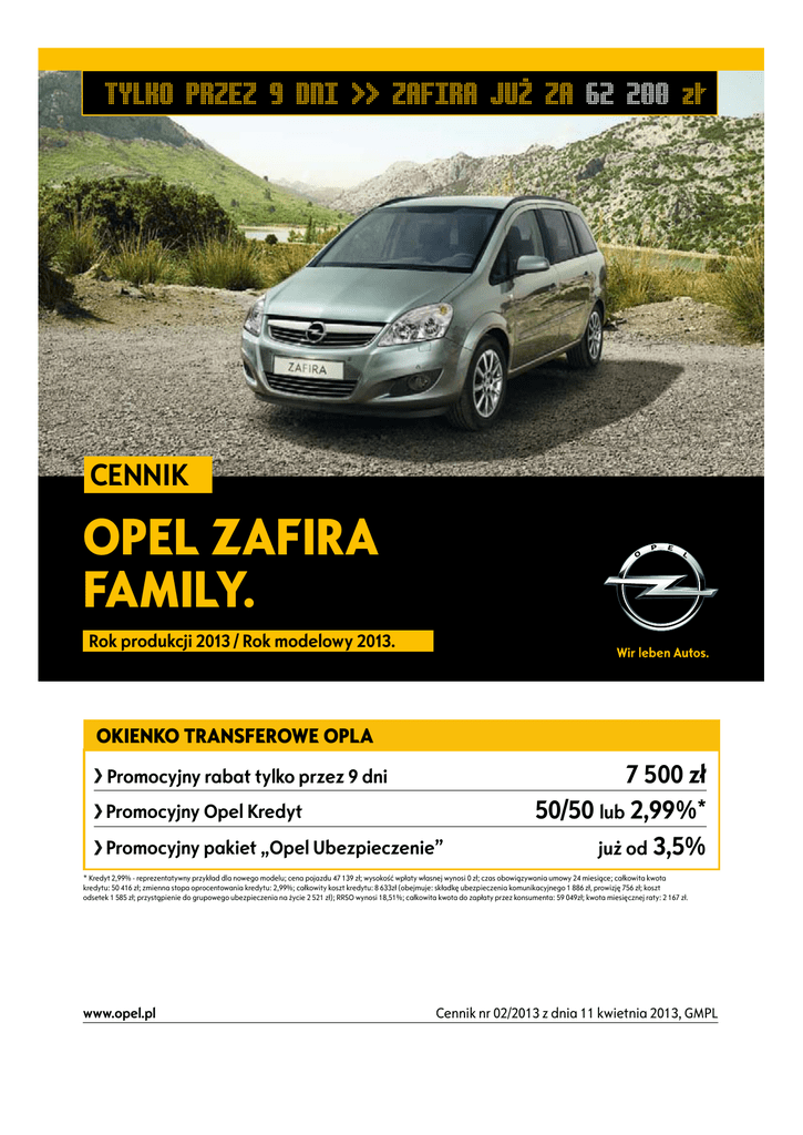 TYLKO PRZEZ 9 DNI >> ZAFIRA JUZ ZA 62 200 zl Cennik OPEL ZAFIRA FAMILY. Rok produkcji 2013 / Rok modelowy 2013. OKIENKO TRANSFEROWE OPLA Promocyjny rabat tylko przez 9 dni Promocyjny Opel Kredyt Promocyjny pakiet „Opel Ubezpieczenie” 7 500 zł 50/50 lub 2,99%* już od 3,5% * Kredyt 2,99% - reprezentatywny przykład dla nowego modelu; cena pojazdu 47 139 zł; wysokość wpłaty własnej wynosi 0 zł; czas obowiązywania umowy 24 miesiące; całkowita kwota kredytu: 50 416 zł; zmienna stopa oprocentowania kredytu: 2,99%; całkowity koszt kredytu: 8 633zł (obejmuje: składkę ubezpieczenia komunikacyjnego 1 886 zł, prowizję 756 zł; koszt odsetek 1 585 zł; przystąpienie do grupowego ubezpieczenia na życie 2 521 zł); RRSO wynosi 18,51%; całkowita kwota do zapłaty przez konsumenta: 59 049zł; kwota miesięcznej raty: 2 167 zł. www.opel.pl Cennik nr 02/2013 z dnia 11 kwietnia 2013, GMPL Cennik – Opel Zafira Family Rok produkcji 2013, rok modelowy 2013 Ceny promocyjne Family 1.6 Ecotec (115 KM) M5 62 200 1.6 Turbo Ecotec CNG (150 KM)* M5 84 650 1.8 Ecotec (140 KM) M5 68 200 MA5 74 200 1.7 CDTI Ecotec (110 KM)* M6 74 200 1.7 CDTI Ecotec (125 KM) M6 76 200 1.8 Ecotec Easytronic (140 KM) Ceny promocyjne nie łączą się z innymi promocjami niż Opel Kredyt. Dokładny opis całej oferty promocyjnej znajduje się na stronie www.opel.pl w sekcji promocje lub dostępny jest u Autoryzowanego Dystrybutora marki Opel. Ceny promocyjne dotyczą klientów indywidualnych. Klientów flotowych w sprawie zapytań ofertowych prosimy o kontakt z wybranym Autoryzowanym Dystrybutorem marki Opel. Ceny katalogowe Family 1.6 Ecotec (115 KM) M5 69 700 1.6 Turbo Ecotec CNG (150 KM)* M5 92 150 1.8 Ecotec (140 KM) M5 75 700 MA5 81 700 1.7 CDTI Ecotec (110 KM)* M6 81 700 1.7 CDTI Ecotec (125 KM) M6 83 700 1.8 Ecotec Easytronic (140 KM) * dostępny w wersji 5-miejscowej (w cenie niższej od wersji 7-miejscowej o 2 000 zł) z homologacją ciężarową N1 (bez prawa odliczenia 23% VAT) Cennik Opla Zafiry Family, rok produkcji 2013, rok modelowy 2013, nr 02/2013 z dnia 11 kwietnia 2013 1/3 Wyposażenie standardowe Family Tapicerka Twist/Elba lub Alpha/Elba, czarna Podłokietnik fotela kierowcy Klimatyzacja sterowana ręcznie Radioodtwarzacz CD 30 MP3. Zawiera: 6-głośnikowy system audio, złącze AUX-in, wyświetlacz wielofunkcyjny Elektrycznie sterowane i podgrzewane lusterka zewnętrzne w kolorze nadwozia Stalowe obręcze kół 16x6,5” z oponami 205/55 R16 Gniazdko 12 V w drugim rzędzie siedzeń / w przedziale bagażowym (tylko z zestawem naprawczym) Przesuwana dzielona kanapa w drugim rzędzie siedzeń Przednie i boczne poduszki powietrzne kierowcy i pasażera, poduszki kurtynowe Pakiet Oświetleniowy 1. Zawiera: Oświetlenie wnętrza pojazdu z przodu i z tyłu TABR/XXTC DA7 C60 UCH DDG PY3 KC7/KC8 AV4 AY0 TSP S S S S S S S S S S DDH BW4 V3E A14 VQ9 T96 TT2 QN1 QQ0 QL4/PWC QQ5 2 000 350/P 200/P 250/P 700/P 2 950 850/P 5 200 650/P 2 600 4 300 500/P A33 N34 DT4 VVH AP9 ANY C61 C68 C32 K07 2GB 1 400/P 700/P 50 700 900/P 250/P 500 1 700/P 1 250 7 500 400/P UFZ 2 350 UWA 2 100 FX3 UA6 K34 U68 UD5 700/P 2 250/P 1 500/P 900/P 1 600/P AH4 550/P A53 1 100 W7Z 1 400 AQ2 450 TSQ 950/P LP4L 950 LPI1 1 750 LPHY 1 950 LPHX 1 950 LPHZ 950 XK0 2 800 CWH 1 900 Wyposażenie dodatkowe NADWOZIE Lakier metaliczny / perłowy / opalizujący Elektrycznie składane lusterka zewnętrzne Listwy ozdobne przy dolnej krawędzi okien bocznych, chromowane Relingi dachowe, srebrne (zastępują standardowe relingi w kolorze czarnym) Przyciemniane tylne szyby Hak holowniczy – składany Reflektory przeciwmgielne Reflektory bi-ksenonowe AFL Strukturalne obręcze kół, stalowe 16x6,5” z oponami 205/55 R16 (niedostępne z 1.6 150KM CNG) Obręcze kół ze stopów lekkich 16x6,5”, z oponami 205/55 R16 Obręcze kół ze stopów lekkich 17x7,0”, z oponami 225/45 R17. Zawierają: Układ stabilizacji toru jazdy ESP® z Traction Control. Pełnowymiarowe koło zapasowe stalowe 16” (zastępuje dostępny w standardzie zestaw naprawczy) WNĘTRZE Elektrycznie sterowane tylne szyby Kierownica trójramienna pokryta skórą z przyciskami sterowania Popielniczka i zapalniczka (pakiet dla palących) Panele ozdobne wnętrza w kolorze Piano Black Siatka zabezpieczająca bagaż. Zawiera: zaczepy do zamocowania siatki w bagażniku. System mocowania bagażu FlexRail Klimatyzacja automatyczna Klimatyzacja sterowana elektronicznie. Zawiera: wyświetlacz graficzny Dodatkowe elektryczne ogrzewanie w systemie nawiewu powietrza Ogrzewanie postojowe Radioodtwarzacz CD 40 USB. Zawiera: 6-głośnikowy system audio, złącza AUX-in i USB, wyświetlacz graficzny Radioodtwarzacz CD MP3 „Touch&Connect” z nawigacją. Zawiera: 6-głośnikowy system audio, kolorowy wyświetlacz 5” i komputer pokładowy (tylko dla klimatyzacji elektronicznej), złącza AUX-in i USB. Komunikaty w języku angielskim. Portal telefonu komórkowego Bluetooth® ze sterowaniem głosowym. Zawiera: wyświetlacz graficzny BEZPIECZEŃSTWO I UKŁADY WSPOMAGAJĄCE KIEROWCĘ Układ stabilizacji toru jazdy ESP® z Traction Control (standard z silnikiem 1.6 150 KM CNG) Alarm. Zawiera system ryglujący „deadlock” Tempomat Komputer pokładowy (niedostępny z silnikiem 1.6 150KM CNG) Czujniki parkowania, przód i tył PAKIETY WYPOSAŻENIA DODATKOWEGO Pakiet Komfortowy 1 Fotel kierowcy regulowany w 6 kierunkach, regulacja podparcia lędźwiowego fotela kierowcy. Pakiet Komfortowy 2 Fotele przednie regulowane w 6 kierunkach z regulacją odcinka lędźwiowego. Pakiet Zimowy Spryskiwacze reflektorów. Podgrzewane fotele przednie. Nawiewy powietrza w trzecim rzędzie siedzeń. Pakiet Flex Organizer System mocowania „FlexRail”. System mocowania tylnych foteli z odłączanymi pasami bezpieczeństwa. Siatki do mocowania bagażu. Pakiet Oświetleniowy 2 Czujnik deszczu. Światłoczułe lusterko wewnętrzne. Automatyczne sterowanie światłami z czujnikiem oświetlenia. Pakiet Biznes Alarm. Pełnowy