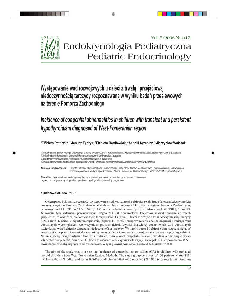 Vol. 5/2006 Nr 4(17) Endokrynologia Pediatryczna Pediatric Endocrinology Występowanie wad rozwojowych u dzieci z trwałą i przejściową niedoczynnością tarczycy rozpoznawaną w wyniku badań przesiewowych na terenie Pomorza Zachodniego Incidence of congenital abnormalities in children with transient and persistent hypothyroidism diagnosed of West-Pomeranian region 1 Elżbieta Petriczko, 2Janusz Fydryk, 3Elżbieta Bartkowiak, 4Anhelli Syrenicz, 1Mieczysław Walczak Klinika Pediatrii, Endokrynologii, Diabetologii, Chorób Metabolicznych i Kardiologii Wieku Rozwojowego Pomorskiej Akademii Medycznej w Szczecinie Klinika Pediatrii Hematologii i Onkologii Pomorskiej Akademii Medycznej w Szczecinie 3 Zakład Medycyny Nuklearnej Pomorskiej Akademii Medycznej w Szczecinie 4 Klinika Endokrynologii, Nadciśnienia Tętniczego i Chorób Przemiany Materii Pomorskiej Akademii Medycznej w Szczecinie 1 2 Adres do korespondencji: Elżbieta Petriczko, Klinika Pediatrii, Endokrynologii, Diabetologii, Chorób Metabolicznych i Kardiologii Wieku Rozwojowego Pomorskiej Akademii Medycznej w Szczecinie, 71-252 Szczecin, ul. Unii Lubelskiej 1, tel/fax 914253167, [email protected] Słowa kluczowe: wrodzona niedoczynność tarczycy, przejściowa niedoczynność tarczycy, badania przesiewowe Key words: congenital hypothyroidism, persistent hypothyroidism, screening programme STRESZCZENIE/ABSTRACT Celem pracy była analiza częstości występowania wad wrodzonych u dzieci z trwałą i przejściową niedoczynnością tarczycy z regionu Pomorza Zachodniego. Metodyka. Praca dotyczyła 131 dzieci z regionu Pomorza Zachodniego, ocenianych od 1 I 1992 do 31 XII 2001, u których w badaniu neonatalnym stwierdzono stężenie TSH ≥ 20 mIU/l. W okresie tym badaniami przesiewowymi objęto 213 831 noworodków. Pacjentów zakwalifikowano do trzech grup: dzieci z wrodzoną niedoczynnością tarczycy (WNT) (n=47), dzieci z przejściową niedoczynnością tarczycy (PNT) (n=31), dzieci z hipertyreotropinemią (hiperTSH) (n=53).Przeprowadzono analizę częstości i rodzaju wad wrodzonych występujących we wszystkich grupach dzieci. Wyniki. Najwięcej dodatkowych wad wrodzonych stwierdzono wśród dzieci z wrodzoną niedoczynnością tarczycy. Wystąpiły one u 10 dzieci z tym rozpoznaniem. W grupie dzieci z przejściową niedoczynnością tarczycy dodatkowe wady rozwojowe stwierdzano u pięciorga dzieci. Na szczególną uwagę zasługuje fakt, że nie stwierdzono w ogóle współistnienia wad wrodzonych w grupie dzieci z hipertyreotropinemią. Wnioski. U dzieci z zaburzeniami czynności tarczycy, szczególnie z rozpoznaniem WNT, stwierdzono wysoką częstość wad wrodzonych, w tym głównie wad serca. Endokrynol. Ped., 5/2006;4(17):35-40 The aim of the study was to assess the incidence of congenital abnormalities (CA) in children with perinatal thyroid disorders from West Pomeranian Region. Methods. The study group consisted of 131 patients whose TSH level was above 20 mIU/l and forms 0.061% of all children that were screened (213 831 screening tests). Based on 35 Endokrynologia_17.indd 35 2007-01-02, 09:56 Praca oryginalna Endokrynol. Ped., 5/2006;4(17):35-40 neoTSH, FT3 and FT4 collected at 1. visit, patients were qualified into 3 groups: congenital hypothyroidism (CH n=47), transient hypothyroidism (TH n=31), hyperthyreotropinaemia (hyperTSH n=53). Results. The higher incidence of CA in a group of CH (10 children, 21.3%) was found. In a TH group CA were detected in 5 children (20%). The absence of CA in children from hyperTSH group (is worth emphasizing). Conclusions. In children with perinatal thyroid disorders high incidence of congenital anomalies, especially congenital heart defects, was detected. Pediatr. Endocrinol., 5/2006;4(17):35-40 Wstęp Wrodzona niedoczynność tarczycy jest jedną z najczęstszych przyczyn upośledzenia intelektualnego, która dzięki wprowadzeniu w wielu krajach populacyjnych badań przesiewowych może zostać w porę wykryta i skutecznie leczona [1–4]. Większość przypadków trwałej niedoczynności tarczycy (80–85%) jest spowodowana dysgenezją gruczołu tarczowego, będącą wynikiem zaburzeń rozwoju tarczycy we wczesnym okresie organogenezy. Wiele doniesień opublikowanych w ostatnich latach wskazuje na możliwość występowania mutacji genetycznych w obrębie czynników transkrypcyjnych ( TTF1, TTF2, PAX8) i receptora tyreotropowego (TSHR), które mogą zaburzać proces prawidłowego różnicowania tyreocytów [5, 6]. Zaburzenia genetyczne prowadzące do wadliwej produkcji niektórych czynników transkrypcyjnych mogą dotyczyć nie tylko czynników odgrywających rolę w prawidłowej organogenezie tarczycy, ale również innych narządów, w tym serca. Stwarza to sytuację, w której u dzieci z wrodzonymi zaburzeniami czynności tarczycy współwystępować mogą inne wady rozwojowe. Cel pracy Celem niniejszej pracy było określenie częstości występowania wad wrodzonych u dzieci z trwałą i przejściową niedoczynnością tarczycy z regionu Pomorza Zachodniego Materiał i metody Badaniami objęto 131 dzieci, u których w badaniu neonatalnym stwierdzono stężenie TSH ≥ 20 mIU/l. Byli to pacjenci diagnozowani i leczeni w II Klinice Chorób Dzieci Katedry Chorób Dzieci PAM oraz w Przyklinicznej Przychodni Specjalistycznej w okresie od 1 I 1992 do 31 XII 2001. W okresie tym w Pracowni Oznaczeń Hormonalnych i Przesiewowych Zakładu Medycyny Nuklearnej Pomorskiej Akademii Medycznej badaniami przesiewowymi w kierunku wrodzonej niedoczyn- ności tarczycy objęto 213 831 noworodków. Objęta badaniami własnymi grupa 131 dzieci stanowiła 0,061 % wszystkich dzieci poddanych badaniom przesiewowym w analizowanym okresie. Badaną grupę stanowiło 69 dziewczynek (52,67%) i 62 chłopców (47,33%). Wiek pacjentów w czasie badania mieścił się w przedziale od 18 dni do 7,9 lat (średnia 839 dni, mediana 426 dni). W wyniku przeprowadzonych badań hormonalnych przed leczeniem (I weryfi