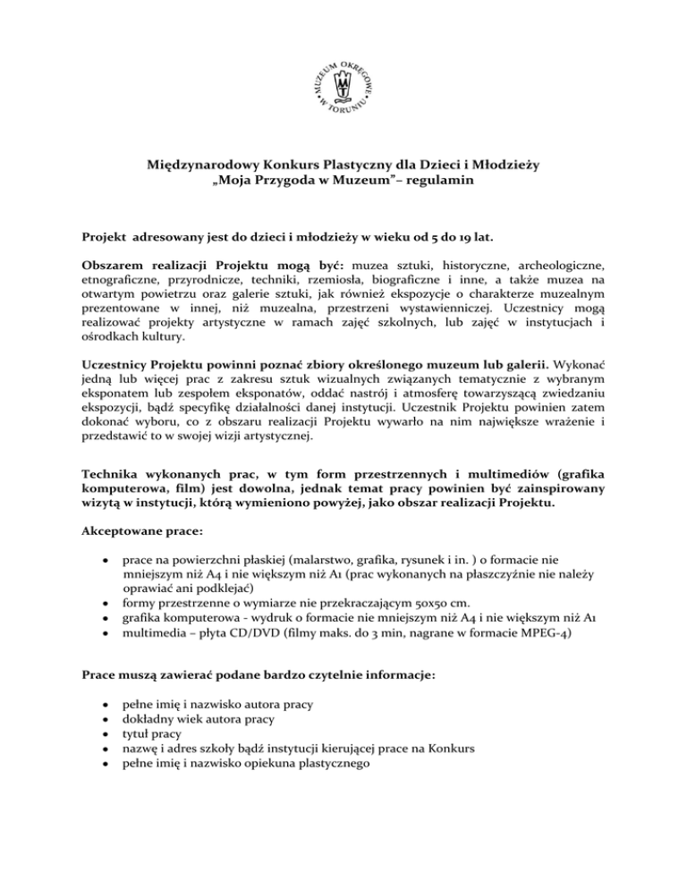 Międzynarodowy Konkurs Plastyczny dla Dzieci i Młodzieży „Moja Przygoda w Muzeum”– regulamin Projekt adresowany jest do dzieci i młodzieży w wieku od 5 do 19 lat. Obszarem realizacji Projektu mogą być: muzea sztuki, historyczne, archeologiczne, etnograficzne, przyrodnicze, techniki, rzemiosła, biograficzne i inne, a także muzea na otwartym powietrzu oraz galerie sztuki, jak również ekspozycje o charakterze muzealnym prezentowane w innej, niż muzealna, przestrzeni wystawienniczej. Uczestnicy mogą realizować projekty artystyczne w ramach zajęć szkolnych, lub zajęć w instytucjach i ośrodkach kultury. Uczestnicy Projektu powinni poznać zbiory określonego muzeum lub galerii. Wykonać jedną lub więcej prac z zakresu sztuk wizualnych związanych tematycznie z wybranym eksponatem lub zespołem eksponatów, oddać nastrój i atmosferę towarzyszącą zwiedzaniu ekspozycji, bądź specyfikę działalności danej instytucji. Uczestnik Projektu powinien zatem dokonać wyboru, co z obszaru realizacji Projektu wywarło na nim największe wrażenie i przedstawić to w swojej wizji artystycznej. Technika wykonanych prac, w tym form przestrzennych i multimediów (grafika komputerowa, film) jest dowolna, jednak temat pracy powinien być zainspirowany wizytą w instytucji, którą wymieniono powyżej, jako obszar realizacji Projektu. Akceptowane prace: prace na powierzchni płaskiej (malarstwo, grafika, rysunek i in. ) o formacie nie mniejszym niż A4 i nie większym niż A1 (prac wykonanych na płaszczyźnie nie należy oprawiać ani podklejać) formy przestrzenne o wymiarze nie przekraczającym 50x50 cm. grafika komputerowa - wydruk o formacie nie mniejszym niż A4 i nie większym niż A1 multimedia – płyta CD/DVD (filmy maks. do 3 min, nagrane w formacie MPEG-4) Prace muszą zawierać podane bardzo czytelnie informacje: pełne imię i nazwisko autora pracy dokładny wiek autora pracy tytuł pracy nazwę i adres szkoły bądź instytucji kierującej prace na Konkurs pełne imię i nazwisko opiekuna plastycznego Muzea, szkoły, instytucje i ośrodki kultury ustalają formy organizacyjne oraz zakres upowszechniania i przebiegu Projektu na ich terenie. Dopuszcza się możliwość indywidualnego przysłania prac. Organizator Projektu zastrzega sobie prawo do wstępnej kwalifikacji prac do Konkursu. Prace należy przysyłać na finał Konkursu do końca czerwca danego roku na adres: MUZEUM OKRĘGOWE W TORUNIU DZIAŁ EDUKACJI RYNEK STAROMIEJSKI 1 87 – 100 TORUŃ tel. (056) 66 05 632; fax (056) 622-40-29 www.muzeum.torun.pl; [email protected] Przegląd nadesłanych w ramach Projektu prac odbywać się będzie na początku lipca każdego roku. Specjaliści z zakresu sztuki, muzealnictwa i pedagogiki (Jury Konkursu) przyznają równorzędne nagrody i równorzędne wyróżnienia w czterech kategoriach wiekowych: 5-9 lat, 10-12 lat, 13-15 lat, 16-19 lat, oraz zakwalifikują ok. 200 najlepszych prac na wystawę pokonkursową. Informacje o przyznanych nagrodach, wyróżnieniach i kwalifikacji na wystawę zostaną przesłane pocztą. Nagrodzeni uczniowie i ich opiekunowie zostaną zaproszeni na Galę podsumowującą Projekt (około połowy września danego roku) połączoną z wręczeniem nagród, wernisażem wystawy, panelem dyskusyjnym i warsztatami. Wyróżnienia i dyplomy dla uczestników, których prace zostały zakwalifikowane na wystawę, zostaną przesłane pocztą. Uwagi organizatora: prace plastyczne nadesłane na Międzynarodowy Konkurs nie będą zwracane autorom i przechodzą na własność organizatora. Organizator zastrzega sobie prawo do swobodnego dysponowania pracami, m. in. nieodpłatnego reprodukowania prac w celach reklamowych (w prasie, TV, katalogach, folderach, innych wydawnictwach promujących Projekt oraz na stronie internetowej Muzeum Okręgowego w Toruniu); Organizator nie ponosi odpowiedzialności za zniszczenia zaistniałe podczas transportu prac; prac nie wolno podklejać ani oprawiać; prace plastyczne wykonane z materiałów mogących być zagrożeniem dla zbiorów muzealnych nie będą dopuszczone do Konkursu; zagadnienia nieobjęte niniejszym regulaminem rozstrzyga Organizator;