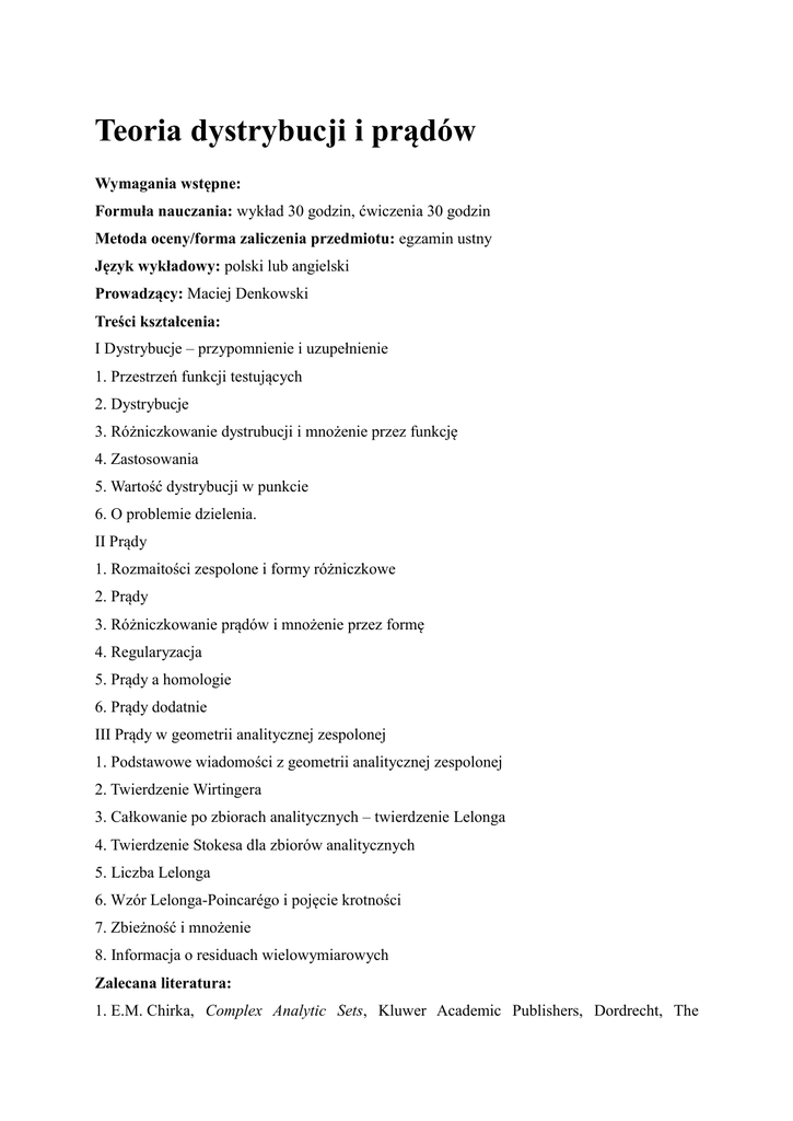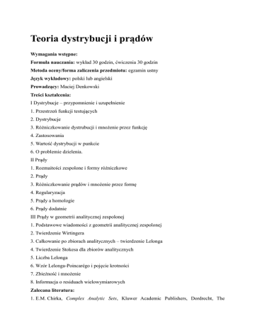 Teoria dystrybucji i prądów Wymagania wstępne: Formuła nauczania: wykład 30 godzin, ćwiczenia 30 godzin Metoda oceny/forma zaliczenia przedmiotu: egzamin ustny Język wykładowy: polski lub angielski Prowadzący: Maciej Denkowski Treści kształcenia: I Dystrybucje – przypomnienie i uzupełnienie 1. Przestrzeń funkcji testujących 2. Dystrybucje 3. Różniczkowanie dystrubucji i mnożenie przez funkcję 4. Zastosowania 5. Wartość dystrybucji w punkcie 6. O problemie dzielenia. II Prądy 1. Rozmaitości zespolone i formy różniczkowe 2. Prądy 3. Różniczkowanie prądów i mnożenie przez formę 4. Regularyzacja 5. Prądy a homologie 6. Prądy dodatnie III Prądy w geometrii analitycznej zespolonej 1. Podstawowe wiadomości z geometrii analitycznej zespolonej 2. Twierdzenie Wirtingera 3. Całkowanie po zbiorach analitycznych – twierdzenie Lelonga 4. Twierdzenie Stokesa dla zbiorów analitycznych 5. Liczba Lelonga 6. Wzór Lelonga-Poincarégo i pojęcie krotności 7. Zbieżność i mnożenie 8. Informacja o residuach wielowymiarowych Zalecana literatura: 1. E.M. Chirka, Complex Analytic Sets, Kluwer Academic Publishers, Dordrecht, The Netherlands, 1989. 2. G. De Rham, Variétés Différentiables, Hermann, Paris 1955. 3. H. Federer, Geometric Measure Theory, Springer Verlag, Grundlehren der math. Wissenschaften 153, Berlin 1969. 3. P. Lelong, Fonctions plurisousharmoniques et formes differentielles positives, Gordon and Breach 1968. 4. W. Rudin, Analiza funkcjonalna, PWN 1998. 5. Z. Szmydt, Transformacja Fouriera i równania liniowe.