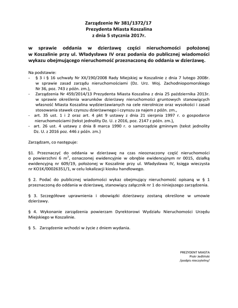 Zarządzenie Nr 381/1372/17 Prezydenta Miasta Koszalina z dnia 5 stycznia 2017r. w sprawie oddania w dzierżawę części nieruchomości położonej w Koszalinie przy ul. Władysława IV oraz podania do publicznej wiadomości wykazu obejmującego nieruchomość przeznaczoną do oddania w dzierżawę. Na podstawie: - § 3 i § 16 uchwały Nr XX/190/2008 Rady Miejskiej w Koszalinie z dnia 7 lutego 2008r. w sprawie zasad zarządu nieruchomościami (Dz. Urz. Woj. Zachodniopomorskiego Nr 36, poz. 743 z późn. zm.), - Zarządzenia Nr 459/2014/13 Prezydenta Miasta Koszalina z dnia 25 października 2013r. w sprawie określenia warunków dzierżawy nieruchomości gruntowych stanowiących własność Miasta Koszalina wydzierżawianych na cele nierolnicze oraz wysokości i zasad stosowania stawek czynszu dzierżawnego i czynszu za najem z późn. zm., - art. 35 ust. 1 i 2 oraz art. 4 pkt 9 ustawy z dnia 21 sierpnia 1997 r. o gospodarce nieruchomościami (tekst jednolity Dz. U. z 2016, poz. 2147 z późn. zm.), - art. 26 ust. 4 ustawy z dnia 8 marca 1990 r. o samorządzie gminnym (tekst jednolity Dz. U. z 2016 poz. 446 z późn. zm.) Zarządzam, co następuje: §1. Przeznaczyć do oddania w dzierżawę na czas nieoznaczony część nieruchomości o powierzchni 6 m2, oznaczonej ewidencyjnie w obrębie ewidencyjnym nr 0015, działką ewidencyjną nr 609/19, położonej w Koszalinie przy ul. Władysława IV, księga wieczysta nr KO1K/00026351/1, w celu lokalizacji kiosku handlowego. § 2. Podać do publicznej wiadomości wykaz obejmujący nieruchomość opisaną w § 1 przeznaczoną do oddania w dzierżawę, stanowiący załącznik nr 1 do niniejszego zarządzenia. § 3. Szczegółowe uprawnienia i obowiązki dzierżawcy zostaną określone w umowie dzierżawy. § 4. Wykonanie zarządzenia powierzam Dyrektorowi Wydziału Nieruchomości Urzędu Miejskiego w Koszalinie. § 5. Zarządzenie wchodzi w życie z dniem wydania. PREZYDENT MIASTA Piotr Jedliński /podpis nieczytelny/ Załącznik nr 1 do Zarządzenia Prezydenta Miasta Koszalina Nr 381/1372/17 z dnia 5 stycznia 2017r. WYKAZ NIERUCHOMOŚCI przeznaczonej do oddania w dzierżawę Lp. 1 1. Oznaczenie nieruchomości wg operatu ewidencji gruntów 1 – działka nr 2 – obręb nr 3 – Księga Wieczysta nr 4 – powierzchnia działki (m2) 2 1 - 609/19 2 - 0015 3KO1K/00026351/1 4 - 1180 Powierzchnia nieruchomości do oddania w dzierżawę Opis i położenie nieruchomości 1/ Przeznaczenie w planie zagospodarowania przestrzennego Forma udostępnienia nieruchomości 2/ Termin wnoszenia opłaty 2/ Sposób jej zagospodarowania 3 6m 4 2 ul. Władysława IV - zgodnie z załącznikiem graficznym (nr 2) do zarządzenia 5 1/ usługi komercyjne typu handel, gastronomia, rzemiosło usługowe z dopuszczeniem funkcji mieszkaniowej - adaptacja 1/ Wysokość opłaty z tytułu dzierżawy 3/ Zasady aktualizacji opłaty 7 dzierżawa na czas nieoznaczony 8 1/ według stawki: - usługi: 3,26 zł/m2 + 23 % podatku VAT 2/ miesięcznie /N 13 – 27 UK, MJ/ 2/ - kiosk handlowy 3/ stawka czynszu dzierżawnego podlega corocznie waloryzacji z dniem 1 stycznia każdego roku w stopniu odpowiadającym wskaźnikowi cen towarów i usług konsumpcyjnych w okresie pierwszych trzech kwartałów roku poprzedzającego waloryzację stawki, w stosunku do analogicznego okresu roku poprzedniego. PREZYDENT MIASTA Piotr Jedliński /podpis nieczytelny/