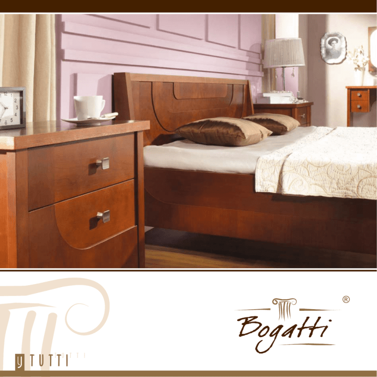 T U T T I TUTTI TUTTI T U T T I Kolekcja mebli Tutti jest inna niż wszystkie dostępne na rynku. Jest wyjątkowa, elegancka, oryginalna, intrygująca oraz wzbudzająca zachwyt i podziw. Bez względu na to, czy umebluje się nią pokój dzienny, jadalnię czy sypialnię, będzie stanowić niezaprzeczalną ozdobę pomieszczenia. Perfekcyjne wykonanie, dbałość o detale, urok drewna olchowego i naturalnej okleiny z czereśni amerykańskiej, intrygujące zaokrąglenia i wybarwienie na kolor jatoby, funkcjonalność, ciekawe oświetlenie i ekologia w postaci zastosowanego wodnego lakieru, stanowią o wyjątkowości tego programu. Tutti jest stworzony dla wymagających klientów, którzy szanują swoje pieniądze i chcą mieć najwyższy komfort, a także oryginalną, niepowtarzalną stylistykę za rozsądną cenę. Bogactwo elementów kolekcji Tutti pozwoli na aranżację każdego domowego pomieszczenia. TUTTI T U T T I Tutti furniture collection is very much different from anything currently available on the market. It is exceptional, original, intriguing, delightful and admirable. Whether one furnishes the living room, dining room or bedroom it will without a doubt decorate the space beautifully. Perfect workmanship, attention to detail, charm of alder wood and natural American Cherry veneer, intriguing round corners, Jatobá colouring, functional versatility, interesting lighting and environmental sustainability thanks to the use of water-based clear coat all are a testament to uniqueness of this furniture set. Tutti has been created for demanding customers, who are looking for a great value for their money as well as originality, unique design and the highest degree of comfort. Wide range of Tutti collection elements makes it possible to furnish any home interior. Коллекция мебели Тутти отличается от всех других доступных на рынке. Она является исключительно оригинальной и пленяющей, вызывая одновременно восхищение и удивление. Независимо от того, разместить ли ее в гостиной, в столовой или в спальне, она непременно становится украшением помещения. Совершенство исполнения, старательность проработки в деталях, очарование, источаемое древесиной ольхи и натуральным шпоном из американской черешни, интригующие заокругленные углы и прокрас цвета ятобы, функциональность, использование интересной подсветки и применение экологического лака на водной основе – всё это вместе взятое определяет исключительность этой программы. Тутти создана для клиентов с высокими требованиями, относящимися с уважением к своим деньгам и желающим в разумной цене получить максимум комфорта и оригинальную неповторимую стилистику. Благодаря обилию элементов, входящих в коллекцию Тутти, ею можно меблировать любое домашнее помещение. 190 195 62 127 Szafa 3-drzwiowa z lustrem 3-door wardrobe with mirror Шкаф 3-створчатый с зеркалом 135 121 47 45 98 42 Krzesło 1 Chair 1 Cтул 1 46 95 Krzesło 2 Chair 2 Cтул 2 62 100 Szafa 2-drzwiowa 2-door wardrobe Шкаф 2-створчатый 150 Kredens 3-częściowy wysoki, oszklony 3-section cupboard, tall, glazed Креденс из 3 частей высокий, oстекленный 195 86 47 63 Kredens 3-częściowy 3-section cupboard Креденс из 3 частей 115 104 47 Komoda wysoka Chest of drawers high Комод высокий 59 115 Mатериал: Oльха, Американская черешня Отделка/окраска: Ятоба 86 195 47 55 Witryna 2-drzwiowa 2-door display unit Витрина 2-дверная 47 Komoda niska Chest of drawers Комод низкий 155 76 (92 z nadstawką) 65 150 Biurko Desk Письменный стол 195 47 Witryna 1-drzwiowa prawa i lewa 1-door display unit right & left Витрина 1-дверная правая и левая 52 47 Szafka RTV szeroka TV bench, wide Шкафчик RTV широкий 3 Lustro składane Shutter mirror Зеркало складное 39 115 76 47 Toaletka Dressing table Tуалетный столик Bogatti Sp. z o.o. ul. Powstańców Wlkp. 3, PL 64-030 Śmigiel tel.: +48 65 518 90 03, fax: +48 65 518 90 07 [email protected] www.bogatti.pl 150-200-250 76 85 Stół prostokątny Rectangular table Стол прямоугольный 126 50 86 Stolik okolicznościowy Coffee table Журнальный столик 55 61 42 148 80/39 Szafka nocna Łóżko 140 lewa i prawa Bed 140 Night stand Кровать 140 left & right Тумбочка ночная левая и правая 210 168 80/39 Łóżko 160 Bed 160 Кровать 160 210 188 80/39 Niniejszy folder nie stanowi oferty w rozumieniu prawa i jest publikowany jedynie w celach informacyjnych. Producent zastrzega sobie prawo wprowadzania zmian konstrukcyjnych i kolorystycznych TUTTI Material: Alder, American Cherry Finishing/colour: Jatobá 210 Łóżko 180 Bed 180 Кровать 180 © www.perspective.com.pl Materiał: Olcha, Czereśnia amerykańska Wykończenie/wybarwienie: Jatoba T U T T I