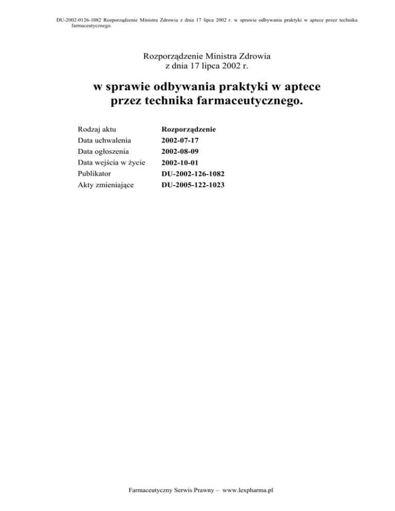 DU-2002-0126-1082 Rozporządzenie Ministra Zdrowia z dnia 17 lipca 2002 r. w sprawie odbywania praktyki w aptece przez technika farmaceutycznego. Rozporządzenie Ministra Zdrowia z dnia 17 lipca 2002 r. w sprawie odbywania praktyki w aptece przez technika farmaceutycznego. Rodzaj aktu Rozporządzenie Data uchwalenia 2002-07-17 Data ogłoszenia 2002-08-09 Data wejścia w życie 2002-10-01 Publikator DU-2002-126-1082 Akty zmieniające DU-2005-122-1023 Farmaceutyczny Serwis Prawny – www.lexpharma.pl DU-2002-0126-1082 Rozporządzenie Ministra Zdrowia z dnia 17 lipca 2002 r. w sprawie odbywania praktyki w aptece przez technika farmaceutycznego. DU-2002-0126-1082 Rozporządzenie Ministra Zdrowia z dnia 17 lipca 2002 r. w sprawie odbywania praktyki w aptece przez technika farmaceutycznego. Na podstawie art. 91 ust. 3 ustawy z dnia 6 września 2001 r. - Prawo farmaceutyczne (Dz. U. Nr 126, poz. 1381 i z 2002 r. Nr 113, poz. 984) zarządza się, co następuje: § 1. Rozporządzenie określa program praktyki w aptece oraz sposób i tryb jej odbywania przez technika farmaceutycznego. § 2. 1. Praktyka technika farmaceutycznego w aptece, zwana dalej „praktyką”, obejmuje pogłębienie wiedzy teoretycznej oraz doskonalenie umiejętności praktycznych w zakresie czynności fachowych, w szczególności polegających na sporządzaniu, wytwarzaniu i wydawaniu produktów leczniczych i wyrobów medycznych. 2. Program praktyki technika farmaceutycznego określa załącznik nr 1 do rozporządzenia. §3 1. Technik farmaceutyczny, zwany dalej „praktykantem”, odbywa praktykę na podstawie umowy o pracę zawartej na czas nieokreślony lub na czas określony w celu odbycia praktyki. 2. Czas trwania praktyki określony w art. 91 ust. 1 ustawy z dnia 6 września 2001 r. - Prawo farmaceutyczne, zwanej dalej „ustawą”, ulega przedłużeniu w przypadku: 1) pracy w niepełnym wymiarze czasu pracy, 2) nieprzerwanej niezdolności do pracy, o której mowa w art. 92 § 1 Kodeksu pracy, przez okres dłuższy niż 14 dni, 3) urlopu macierzyńskiego, 4) powołania po zakończeniu nauki do odbycia przeszkolenia wojskowego, 5) urlopu wychowawczego, nie dłużej jednak niż o rok, 6) urlopu bezpłatnego, nie dłużej jednak niż o 3 miesiące, 7) niezrealizowania programu praktyki w związku z ciążą odbywającej praktykę lub sprawowania opieki nad dzieckiem do lat 4. 3. Przedłużenie czasu trwania praktyki, o którym mowa w ust. 2 pkt 1, obejmuje okres do pełnego wymiaru czasu pracy. 4. W przypadkach, o których mowa w ust. 2 pkt 2-7, przedłużenie czasu trwania praktyki następuje na okres realizacji tej jej części, która nie została zrealizowana w czasie, o którym mowa w art. 91 ust. 1 ustawy. 5. Okres odbywania stażu lub przygotowania zawodowego przez technika farmaceutycznego, który otrzymał skierowanie starosty na podstawie art. 53 ustawy z dnia 20 kwietnia 2004 r. o promocji zatrudnienia i instytucjach rynku pracy (Dz. U. Nr 99, poz. 1001 i Nr 273, poz. 2703 oraz z 2005 r. Nr 64, poz. 565 i Nr 94, poz. 788), może być wliczony do okresu praktyki. § 4. 1. Praktykę odbywa się w aptece zapewniającej świadczenie usług farmaceutycznych, co najmniej w zakresie, o którym mowa w art. 86 ust. 2 ustawy. 2. Dopuszcza się możliwość odbywania praktyki w innej aptece, pod warunkiem umożliwienia praktykantowi odbycia części zajęć praktycznych w aptece zapewniającej świadczeFarmaceutyczny Serwis Prawny – www.lexpharma.pl DU-2002-0126-1082 Rozporządzenie Ministra Zdrowia z dnia 17 lipca 2002 r. w sprawie odbywania praktyki w aptece przez technika farmaceutycznego. nie usług farmaceutycznych, co najmniej w zakresie określonym w art. 86 ust. 2 ustawy. 3. Jeżeli praktyka nie może być kontynuowana w aptece, w której praktykant odbywa praktykę, dopuszcza się odbywanie dalszej części praktyki w innej aptece, pod warunkiem, że zmiana ta umożliwi pełną realizację programu praktyki. 4. skreślony 5. skreślony § 5. 1. Praktyką kieruje kierownik apteki, w której praktykant odbywa aktualnie praktykę, lub wyznaczony przez kierownika tej apteki farmaceuta, zwany dalej „opiekunem”. Opiekun może kierować jednocześnie praktyką najwyżej dwóch praktykantów. 2. Do obowiązków opiekuna należy: 1) sporządzanie planu i harmonogramu zajęć praktycznych i nadzór nad ich wykonaniem, 2) prowadzenie zajęć praktycznych w aptece, 3) pisemne stwierdzenie zrealizowania przez praktykanta całości programu praktyki. § 6. Praktykant może samodzielnie wykonywać czynności pomocnicze przy sporządzaniu, wytwarzaniu, wydawaniu produktów leczniczych i wyrobów medycznych, z wyłączeniem produktów leczniczych, o których mowa w art. 91 ust. 1 ustawy, i preparatów leczniczych będących: 1) lekami do żywienia pozajelitowego, 2) lekami do żywienia dojelitowego, 3) lekami w dawkach dziennych, w tym lekami cytostatycznymi, 4) płynami infuzyjnymi, 5) roztworami do hemodializy i dializy dootrzewnowej. § 7. 1. Praktykant prowadzi „Dziennik praktyki aptecznej technika farmaceutycznego”, zwany dalej „dziennikiem”, w którym odnotowuje wykonywane zajęcia praktyczne. 2. Dziennik posiada formę książkową z ponumerowanymi kolejno stronami. 3. Na pierwszej stronie dziennika umieszcza się imię i nazwisko praktykanta, nazwę apteki, w której praktykant rozpoczyna praktykę, datę wydania oraz numer dyplomu potwierdzającego uzyskanie tytułu technika farmaceutycznego, a także datę rozpoczęcia praktyki oraz imię i nazwisko opiekuna praktyki; na poszczególnych stronach dziennika należy umieścić nazwę apteki, w której praktykant wykonuje zajęcia praktyczne, ich opis oraz ocenę osoby nadzorującej wykonywanie tych zajęć. 4. Jeżeli wpisy w dzienniku dotyczą czynności wykonywanych pod nadzorem innej osoby niż opiekun, wymagają, oprócz potwierdzenia przez osobę nadzorującą zajęcia, dodatkowo potwierdzenia przez opiekuna. 5. Jeżeli praktyka odbywana jest w różny