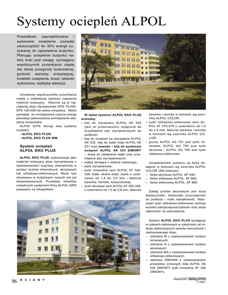 Systemy ociepleń ALPOL Prawidłowo zaprojektowane i wykonane ocieplenie pozwala zaoszczędzić do 30% energii zużywanej do ogrzewania budynku. Planując ocieplenie budynku należy brać pod uwagę: wymagany współczynnik przenikania ciepła dla danej przegrody budowlanej, grubość warstwy ocieplającej, trwałość ocieplenia, koszt, łatwość wykonania, estetykę elewacji. Uzyskanie współczynnika przenikania ciepła o zakładanej wartości zapewnia materiał izolacyjny. Obecnie są to najczęściej płyty styropianowe EPS 70-040, EPS 100-038 lub wełna mineralna. Warto pamiętać, że zmniejszenie zużycia energii powoduje jednocześnie zmniejszenie skażenia środowiska. ALPOL GIPS oferuje dwa systemy ociepleń: - ALPOL EKO PLUS; - ALPOL EKO PLUS WM. System ociepleń ALPOL EKO PLUS ALPOL EKO PLUS wykorzystuje jako materiał izolacyjny płyty styropianowe z zastosowaniem wyprawy zewnętrznej w postaci tynków mineralnych, akrylowych lub silikatowo-silikonowych. Może być stosowany w budynkach nowych lub już eksploatowanych. Przykłady obiektów ocieplonych systemami firmy ALPOL GIPS pokazano na fotografiach. W skład systemu ALPOL EKO PLUS wchodzą: – klej do styropianu ALPOL AK 530 (jest on przeznaczony wyłącznie do przyklejania płyt styropianowych do podłoża); – klej do ociepleń na styropianie ALPOL AK 532, klej do siatki biały ALPOL AK 531 oraz nowość – klej do systemów ociepleń ALPOL AK 534 ZIMOWY – służą do zatapiania siatki oraz przyklejania płyt styropianowych; – siatka zbrojąca z włókna szklanego; – płyty styropianowe; – tynki mineralne serii ALPOL AT 320338: białe, ekstra białe, szare o uziarnieniu od 1,5 do 3,0 mm i fakturze baranka, kornika, kamyczkowej; – tynki akrylowe serii ALPOL AT 350-358: o uziarnieniu od 1,0 do 2,5 mm, fakturze baranka i kornika w kolorach wg wzornika ALPOL COLOR; – tynki silikatowo-silikonowe serii ALPOL AT 370-378 o uziarnieniu od 1,0 do 2,5 mm, fakturze baranka i kornika w kolorach wg wzornika ALPOL COLOR; – grunty ALPOL AG 701 pod tynki mineralne, ALPOL AG 705 pod tynki akrylowe i ALPOL AG 706 pod tynki silikatowo-silikonowe. Uzupełnieniem systemu są farby dostępne w kolorach wg wzornika ALPOL COLOR (255 kolorów): – farba akrylowa ALPOL AF 640; – farba silikatowa ALPOL AF 660; – farba silikonowa ALPOL AF 680. Zaletą tynków akrylowych jest duża elastyczność, doskonała przyczepność do podłoża i mała nasiąkliwość. Natomiast tynki silikatowo-silikonowe cechuje wysoka paroprzepuszczalność oraz duża odporność na zabrudzenia. System ALPOL EKO PLUS występuje w czterech odmianach w zależności od rodzaju dekoracyjnych warstw wierzchnich i zastosowanego kleju: – odmiana M z zastosowaniem tynków mineralnych; – odmiana N z zastosowaniem tynków akrylowych; – odmiana SIS z zastosowaniem tynków silikatowo-silikonowych; – odmiana ZIMOWA z zastosowaniem produktów zimowych (klej ALPOL AK 534 ZIMOWY, tynk mineralny AT 326 ZIMOWY). 96 Ś C I A N Y 2/2007 System we wszystkich odmianach został sklasyfikowany jako nierozprzestrzeniający ognia (NRO). System ociepleń ALPOL EKO PLUS uzyskał Aprobatę Techniczną ITB nr AT15-5022/2007 oraz Certyfikat Zakładowej Kontroli Produkcji nr ITB-0178/Z dopuszczające do stosowania w budownictwie. Wszystkie elementy systemu posiadają wymagane Deklaracje Zgodności oraz Atesty Higieniczne Państwowego Zakładu Higieny. System ociepleń ALPOL EKO PLUS WM ALPOL EKO PLUS WM wykorzystuje jako materiał izolacyjny płyty z wełny mineralnej, a jako wyprawę zewnętrzną tynki mineralne lub silikatowo-silikonowe. System ALPOL EKO PLUS WM może być stosowany w budynkach nowych lub eksploatowanych. W skład systemu ALPOL EKO PLUS WM wchodzą: – klej do styropianu ALPOL AK 533 oraz nowość – klej do systemów ociepleń ALPOL AK 534 ZIMOWY do przyklejania płyt z wełny mineralnej i zatapiania siatki zbrojącej; – siatka zbrojąca z włókna szklanego; – płyty z wełny mineralnej fasadowej lub lamelowej (o układzie włókien prostopadłym do płaszczyzny płyty); – tynki mineralne serii ALPOL AT 320338: białe, ekstra białe, szare o uziarnieniu od 1,5 do 3,0 mm i fakturze baranka, kornika, kamyczkowej; – tynki silikatowo-silikonowe serii ALPOL AT 370-378 o uziarnieniu od 1,0 do 2,5 mm, fakturze baranka i kornika w kolorach wg wzornika ALPOL COLOR; – grunty ALPOL AG 701 pod tynki mineralne i ALPOL AG 706 pod tynki silikatowo-silikonowe. Uzupełnieniem systemu są farby dostępne w kolorach wg wzornika ALPOL COLOR (255 kolorów): – farba silikatowa ALPOL AF 660; – farba silikonowa ALPOL AF 680. W ociepleniach z wełną mineralną nie zaleca się stosować tynków i farb akrylowych ze względu na ich małą paroprzepuszczalność. System ALPOL EKO PLUS WM na wełnie mineralnej występuje w czterech odmianach: – odmiana M z zastosowaniem tynków mineralnych; – odmiana SIS z zastosowaniem tynków silikatowo-silikonowych; – odmiana K bez tynku, do wykonywania ociepleń stropów od strony sufitów w garażach zamkniętych oraz w pomieszczeniach nie ogrzewanych np. w piwnicach, nad którymi znajdują się pomieszczenia ogrzewane; – odmiana ZIMOWA z zastosowaniem produktów zimowych (kleju ALPOL AK 534 ZIMOWY, tynku mineralnego AT 326 ZIMOWY). System w odmianach M, K i ZIMOWA został sklasyfikowany jako niepalny oraz nierozprzestrzeniający ognia (NRO), a w odmianie SIS jako nierozprzestrzeniający ognia (NRO). System ociepleń budynków ALPOL EKO PLUS WM uzyskał aprobatę Techniczną ITB AT-15-6540/2007 i posiada wymagany przepisami dokument dopuszczający go do obrotu – Certyfikat Zgodności ITB-0875/W. Ponadto wszystkie elementy systemu posiadają wymagane Deklaracje Zgodności oraz Atesty Higienicznego Państwowego Zakładu Higieny. Więcej informacji na temat zastosowania produktów firmy ALPOL GIPS można uzyskać na stronie internetowej www.alpol.pl Do dyspozycji Klientów są również regionalni przedstawiciele han