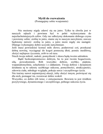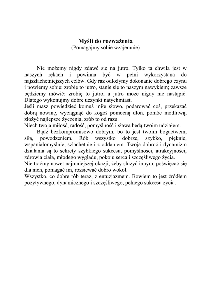 Myśli do rozważenia (Pomagajmy sobie wzajemnie) Nie możemy nigdy zdawć się na jutro. Tylko ta chwila jest w naszych rękach i powinna być w pełni wykorzystana do najszlachetniejszych celów. Gdy raz odłożymy dokonanie dobrego czynu i powiemy sobie: zrobię to jutro, stanie się to naszym nawykiem; zawsze będziemy mówić: zrobię to jutro, a jutro może nigdy nie nastąpić. Dlatego wykonujmy dobre uczynki natychmiast. Jeśli masz powiedzieć komuś miłe słowo, podarować coś, przekazać dobrą nowinę, wyciągnąć do kogoś pomocną dłoń, pomóc modlitwą, złożyć najlepsze życzenia, zrób to od razu. Niech twoja miłość, radość, pomyślność i sława będą twoim udziałem. Bądź bezkompromisowo dobrym, bo to jest twoim bogactwem, siłą, powodzeniem. Rób wszystko dobrze, szybko, pięknie, wspaniałomyślnie, szlachetnie i z oddaniem. Twoja dobroć i dynamizm działania są to sekrety szybkiego sukcesu, pomyślności, atrakcyjności, zdrowia ciała, młodego wyglądu, pokoju serca i szczęśliwego życia. Nie traćmy nawet najmniejszej okazji, żeby służyć innym, poświęcać się dla nich, pomagać im, rozsiewać dobro wokół. Wszystko, co dobre rób teraz, z entuzjazmem. Bowiem to jest źródłem pozytywnego, dynamicznego i szczęśliwego, pełnego sukcesu życia.