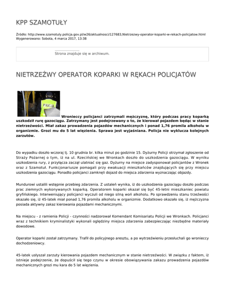 KPP SZAMOTUŁY NIETRZEŹWY OPERATOR KOPARKI W