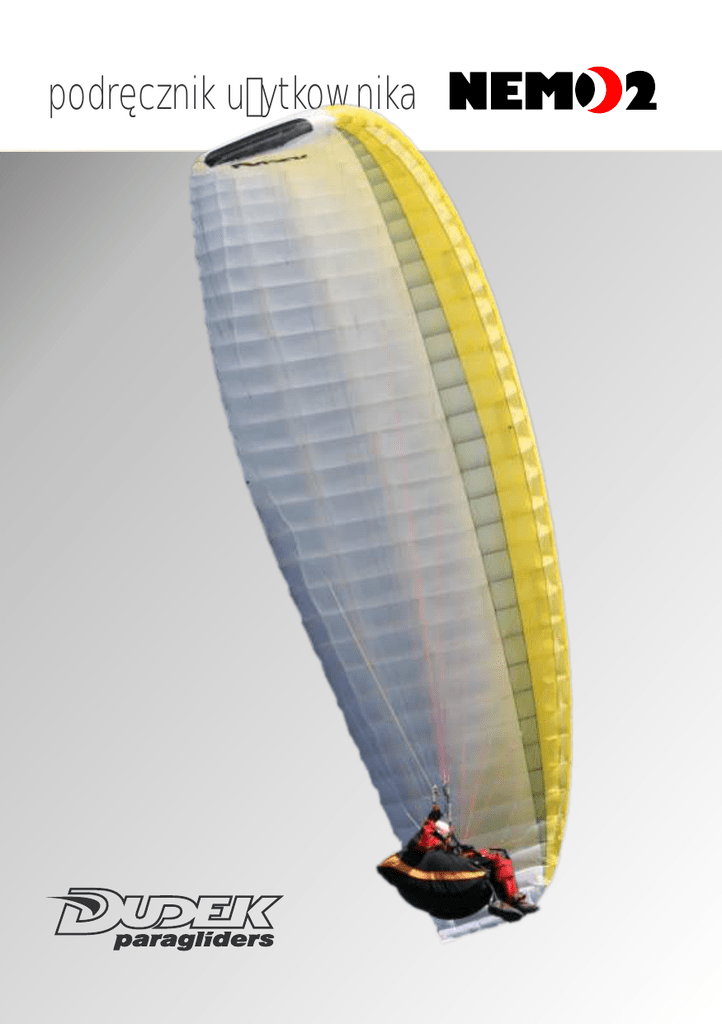 podręcznik użytkownika UWAGA! Przed pierwszym użyciem skrzydła zapoznaj się dokładnie z tym podręcznikiem SPIS TREŚCI Str. 1. Wprowadzenie.......................................................................................3 2. O skrzydle.............................................................................................4 DLA KOGO Nemo2 PROJEKT KONSTRUKCJA TKANINA OLINOWANIE TAŚMY NOŚNE SPEED SYSTEM Jak dopasować Jak używać JAKA UPRZĄŻ 3. Użytkowanie w locie...........................................................................11 KONTROLA PRZED STARTEM START Start klasyczny Start alpejski (odwrócony) ZAKRĘTY LOTY TERMICZNE I ŻAGLOWE LATANIE ZE SPEED SYSTEMEM LĄDOWANIE HOLOWANIE ZA WYCIĄGARKĄ I MOTOPARALOTNIARSTOWO SZYBKIE WYTRACANIE WYSOKOŚCI Uszy Spirala B-sztal AKROBATYKA WING OVER SYTUACJE NIEBEZPIECZNE Podwinięcie boczne (klapa) Podwinięcie czołowe (frontsztal) Przeciągnięcie i spirala negatywna (negatywka) Spadochronowanie Przerzucenie linki (krawat) Sterowanie w sytuacjach awaryjnych 4. Jak dbać o paralotnię.........................................................................20 PRZECHOWYWANIE CZYSZCZENIE NAPRAWY JAK OGRANICZYĆ STARZENIE SIĘ SKRZYDŁA 5. Dane techniczne.................................................................................22 6. Gwarancja, AeroCasco.......................................................................23 7. Co kupiłeś...........................................................................................25 8. Schemat i tabele długości linek.........................................................26 9. Konstrukcja i osprzęt taśm nośnyc..................................................28 Stabilizator Krawędź natarcia Cela Wloty Żebra Krawędź spływu Taśmy nośne Belka speed PODRĘCZNIK UŻYTKOWNIKA 1. Wprowadzenie GRATULACJE! Jest nam bardzo miło powitać cię wśród stale rosnącego grona pilotów skrzydeł produkcji DUDEK PARAGLIDERS. Stałeś się właścicielem rekreacyjnej paralotni Nemo2, skonstruowanej zgodnie z najwyższymi światowymi standardami spotykanymi w tej klasie skrzydeł. Doświadczenie konstruktorskie, nowoczesny proces produkcji i dokładne testowanie pozwoliło stworzyć paralotnię przyjazną w pilotażu, bezpieczną, o dobrych osiągach i sprawiającą wiele radości podczas latania. Życzymy Ci wielu godzin przyjemnie i bezpiecznie spędzonych w powietrzu! ZASTRZEŻENIE Prosimy o bardzo uważne przestudiowanie tego podręcznika i o odnotowanie następujących informacji: n Ten podręcznik ma służyć wyłącznie jako pomoc w posługiwaniu się paralotnią Nemo2. Nie służy on w żadnym wypadku do nauki latania na tej lub jakiejkolwiek innej paralotni. n Loty na paralotni mogą być wykonywane przez osoby posiadające odpowiednie uprawnienia (Świadectwo Kwalifikacji) lub podczas nauki pod nadzorem instruktora. n Pilot jest osobiście odpowiedzialny za swoje bezpieczeństwo i utrzymanie paralotni w stanie pełnej sprawności. n Użytkowanie paralotni odbywa się wyłącznie na ryzyko użytkownika! Producent ani sprzedawca nie ponosi z tego tytułu żadnej odpowiedzialności. n W dniu odbioru paralotni od producenta spełnia ona wymagania EN 926-1 i 926-2 lub posiada świadectwo zdatności technicznej wystawione przez producenta. Wprowadzenie jakichkolwiek zmian do paralotni powoduje utratę ważności tych certyfikatów. Uwaga Ze względu na nieustający proces doskonalenia konstrukcji Producent zastrzega, że zakupiona paralotnia może nieznacznie różnić się od tej, opisanej w podręczniku. 3 2. O skrzydle Nemo2 Dla kogo Nemo2? Nemo2 jest rekreacyjnym skrzydłem o nowoczesnej konstrukcji, dobrych osiągach i bardzo dużym bezpieczeństwie. Przeznaczone jest dla pilotów o niewielkich umiejętnościach, nadaje się także do lotów z napędem, do holowania za wyciągarką, oraz do szkolenia. PROJEKT Nemo2 jest następcą popularnego Nemo w klasie paralotni szkolno rekreacyjch. Jest skrzydłem do latania swobodnego, w projektowaniu którego wykorzystaliśmy najnowocześniejsze oprogramowanie inżynierskie Glider Plan. Projektując Nemo2 wiele pracy włożyliśmy w zapewnienie bezpieczeństwa lotu, efektywnego sterowania, prostoty użytkowania, dobrych osiągów i atrakcyjnego wyglądu. W wielu prototypach poprzedzających ostateczną wersję Nemo2 przetestowaliśmy różne profile, obrysy i ugięcia płata pod względem ich stateczności, odporności na turbulencje w różnych konfiguracjach lotu a dodatkowo, wyselekcjonowany profil został przebadany i zoptymalizowany za pomocą specjalnego oprogramowania do badania dynamiki płynów CFD (Computational Fluid Dynamics). Nowe możliwości w połączeniu z doświadczeniem konstruktorskim Piotra Dudka, pozwoliły stworzyć skrzydło o doskonale ustabilizowanej bryle, idealnie dopasowane do oczekiwań pilotów w tej klasie skrzydeł. Nemo2 jest bezpieczne, ma dobre osiągi, łatwo i spokojnie startuje, doskonale się holuje i świetnie lata z napędem. Jesteśmy przekonani, że Nemo2 jest jednym z najlepszych produktów w swojej klasie. KONSTRUKCJA Cała bryła Nemo2 została zaprojektowana w naszym systemie CSG (Canopy Shape Guard), na który składa się wiele podsystemów dających w efekcie wyjątkową spójność bryły i jej trwałość. Poniżej zamieszczamy krótki opis tych podsystemów. 4 PODRĘCZNIK UŻYTKOWNIKA Nemo2 ma eliptyczny obrys o lekko wycofanych końcówkach. Co druga komora podzielona jest na dwie cele a żebra dodatkowo podparte są w systemie wsparć diagonalnych VSS (V-Shaped Supports). Konstrukcja taka zapewnia gładkość górnej powierzchni, wierne odtworzenie profilu aerodynamicznego na całej rozpiętości, lepszy rozkład obciążeń i co ważne, możliwie małą liczbę punktów nośnych. Na dolnej powierzchni, wewnątrz skrzydła zastosowane zostały wzmocnienia wykonane w systemie RSS (Reinforcing Strap System). RSS to niezależny od baloningu system wzmocnień na d