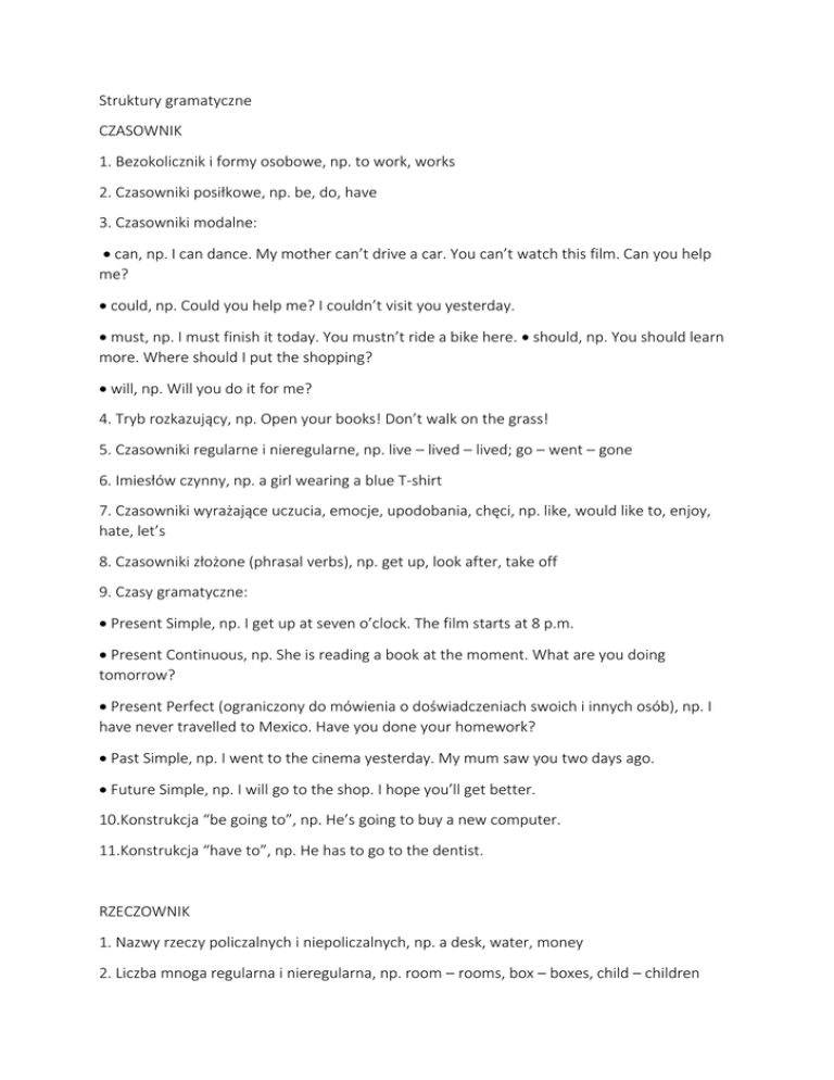 Struktury gramatyczne CZASOWNIK 1. Bezokolicznik i formy osobowe, np. to work, works 2. Czasowniki posiłkowe, np. be, do, have 3. Czasowniki modalne: can, np. I can dance. My mother can’t drive a car. You can’t watch this film. Can you help me? could, np. Could you help me? I couldn’t visit you yesterday. must, np. I must finish it today. You mustn’t ride a bike here. should, np. You should learn more. Where should I put the shopping? will, np. Will you do it for me? 4. Tryb rozkazujący, np. Open your books! Don’t walk on the grass! 5. Czasowniki regularne i nieregularne, np. live – lived – lived; go – went – gone 6. Imiesłów czynny, np. a girl wearing a blue T-shirt 7. Czasowniki wyrażające uczucia, emocje, upodobania, chęci, np. like, would like to, enjoy, hate, let’s 8. Czasowniki złożone (phrasal verbs), np. get up, look after, take off 9. Czasy gramatyczne: Present Simple, np. I get up at seven o’clock. The film starts at 8 p.m. Present Continuous, np. She is reading a book at the moment. What are you doing tomorrow? Present Perfect (ograniczony do mówienia o doświadczeniach swoich i innych osób), np. I have never travelled to Mexico. Have you done your homework? Past Simple, np. I went to the cinema yesterday. My mum saw you two days ago. Future Simple, np. I will go to the shop. I hope you’ll get better. 10.Konstrukcja “be going to”, np. He’s going to buy a new computer. 11.Konstrukcja “have to”, np. He has to go to the dentist. RZECZOWNIK 1. Nazwy rzeczy policzalnych i niepoliczalnych, np. a desk, water, money 2. Liczba mnoga regularna i nieregularna, np. room – rooms, box – boxes, child – children 3. Sposoby wyrażania posiadania i przynależności, np. Kate’s notebook, the photo of my sister PRZEDIMEK Przedimek, np. a dog, an apple, the sun, breakfast PRZYMIOTNIK 1. Stopniowanie regularne i nieregularne używane do porównań w stopniu równym, wyższym i najwyższym, np. cold – colder – the coldest, beautiful – more beautiful – the most beautiful, good – better – the best 2. Przymiotniki dzierżawcze, np. my, her, their PRZYSŁÓWEK 1. Stopniowanie regularne i nieregularne, np. elegantly – more elegantly – the most elegantly, badly – worse – the worst 2. Tworzenie przysłówka z przymiotnika, np. slow – slowly, good – well 3. Przysłówki sposobu, częstotliwości, np. He usually comes late. Speak slowly. ZAIMEK 1. Zaimki osobowe, np. I, me, they, them 2. Zaimki dzierżawcze, np. mine, yours 3. Zaimki wskazujące, np. this, those 4. Zaimki pytające, np. who, how, why, which 5. Zaimki względne, np. who, which, that 6. Zaimki nieokreślone, np. some, any, much, many, no 7. Zaimki one/ones w zdaniach typu I will take the blue one/ones. LICZEBNIK 1. Liczebniki główne, np. one, a hundred 2. Liczebniki porządkowe, np. first, 25th May PRZYIMEK 1. Przyimki z określeniami miejsca, kierunku, odległości, np. next to the shop, on the left, in the north 2. Przyimki z określeniami czasu, np. on Saturday, in the morning, at 7 a.m. 3. Przyimki z określeniami sposobu, np. by car 4. Przyimki po niektórych czasownikach i przymiotnikach, np. wait for, interested in SPÓJNIK Spójniki, np. and, or, because, when, before, so, after SKŁADNIA 1. Zdania twierdzące, przeczące i pytające w czasach: Present Simple, Present Continuous, Present Perfect, Past Simple, Future Simple 2. Zdania rozkazujące, np. Come here! Don’t close the door! 3. Zdania z podmiotem it, np. It is cold today. 4. Zdania z podmiotem there, np. There is a new stadium in my town. There were many people in the park. 5. Zdania z dwoma dopełnieniami, np. Give me some water. 6. Zdania współrzędnie złożone, np. My brother lives in a big city and I live in the country. 7. Zdania podrzędnie złożone, np. He is sad because he lost his mobile. I know where they are. She went to the shop to buy a present for her friend. 8. Konstrukcje bezokolicznikowe i gerundialne, np. It’s nice to meet you. He likes listening to music. I’m good at swimming. 9. Zdania wykrzyknikowe, np. What a surprise!