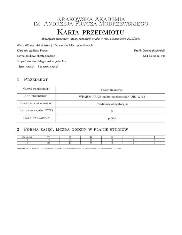 Krakowska Akademia im. Andrzeja Frycza Modrzewskiego Karta przedmiotu obowiązuje studentów, którzy rozpoczęli studia w roku akademickim 2012/2013 WydziałPrawa, Administracji i Stosunków Miedzynarodowych Kierunek studiów: Prawo Profil: Ogólnoakademicki Forma studiów: Niestacjonarne Kod kierunku: PR Stopień studiów: Magisterskie, jednolite Specjalności: 1 2 bez specjalności Przedmiot Nazwa przedmiotu Prawo finansowe Kod przedmiotu WPAISM PRAJednolite magisterskieN OB3 12/13 Kategoria przedmiotu Przedmioty obligatoryjne Liczba punktów ECTS 8 Język wykładowy polski Forma zajęć, liczba godzin w planie studiów Semestr 5 6 W 18 20 C 18 20 K 0 0 S 0 0 Legenda: W — WykładC — Ćwiczenia/ JęzykiK — KonwersatoriumS — SeminariumL — LabolatoriumI — Inne L 0 0 I 0 0 Krakowska Akademia im. Andrzeja Frycza Modrzewskiego 3 Cele przedmiotu Cel 1 Zapoznanie studentów ze zjawiskami procesów zachodzących w gospodarce finansowej państwa i samorządu; pokazanie specyfiki gospodarki finansowej i regulującego ją prawa finansowego; zwrócenie uwagi na siatkę pojęciową prawa finansowego. Cel 2 Zapoznanie studentów z problematyką teoretycznych możliwości stosowanych w działalności finansowej państwa, jednostek samorządu terytorialnego i innych podmiotów publicznych oraz z obowiązującymi rozwiązaniami normatywnymi w celu nabycia przez absolwentów umiejętności interpretacji i stosowania przepisów prawa finansowego w praktyce zawodowej oraz przygotowania do dalszego samokształcenia się i realizacji w życiu zawodowym. 4 Wymagania wstępne 1 Zaliczone prawo konstytucyjne. 2 Zaliczone prawo cywilne - ogólne. 5 Modułowe efekty kształcenia MW1 Ma poszerzoną wiedzę w zakresie prawa finansowego: 1. zna zakres normatywny, 2. Charakteryzuje szczegółowo podstawowe regulacje pranowfinansowe, 3. wskazuje powiązania prawa finansowego z innymi gałęziami prawa. K_ W07 Ma pogłębioną wiedzę o stosunkach społecznych i ekonomicznych poddawanych regulacji prawa finansowego oraz o rządzących nimi prawidłowościach istotnych z punktu widzenia procesu legislacyjnego. K_ W04 Ma pogłębioną i uporządkowaną wiedzę o kluczowych regulacjach w zakresie prawa finansowego, hierarchii źródeł prawa, wzajemnych relacjach finansowych pomiędzy organami władzy państwowej i samorządowej, treści stosunków prawnych, na którą składają się uprawnienia i obowiązki podmiotów stosunków prawnofinansowych, formach aktywności organów podatkowych, skarbowych i kontroli finansowej; a w szczególności o prawie budżetowym, długu publicznym, gospodarce finansowej państwa i JST, prawie podatkowym, publicznym prawie bankowym, europejskim i międzynarodowym prawie finansowym. K_ W06 Zna zasady opodatkowania niezbędne dla rozwoju form indywidualnej przedsiębiorczości, w szczególności w zakresie obsługi prawnej przez doradców podatkowych. K_ W13 Ma pogłębioną i rozszerzoną wiedze o źródłach i miejscu nauki prawa finansowego w systemie nauk prawnych oraz o jej przedmiotowych i metodologicznych powiązaniach z innymi dyscyplinami nauk, w szczególności z nauką finansów publicznych, zna strategie i metody badań stosowanych w nauce prawa finansowego. K_ W01 Opisuje podstawowe poglądy na istotę prawa finansowego i jego społeczne funkcje. K_ W02 Opisuje i charakteryzuje elementy stosunku prawnofinansowego. K_ W05 Zna proceduralne aspekty stosowania prawa podatkowego i dyscypliny budżetowej, zrelacjonuje przebieg postępowań podatkowych przed organami podatkowymi i sądami administracyjnymi. K_ W08 Zna i opisuje etapy stosowania prawa finansowego, w szczególności prawa podatkowego, zna sposoby rozwiązywania sporów z administracją podatkową. K_ W10 MU2 Korzysta z siatki pojęciowej prawa finansowego i swobodnie porusza się po niej, potrafi wykorzystywać wiedzę teoretyczną w celu analizowania i interpretowania problemów społecznych. K_U01 Samodzielnie dokonuje kwalifikacji prawnofinansowej różnych stanów faktycznych, umie dokonywać wykładni i stosować w praktyce przepisy prawa finansowego. K_U07 Posiada umiejętności prezentowania rozbudowanej argumentacji w kontekście poglądów różnych autorów, kierując się przy tym zasadami etycznymi, racjonalnie podejmie dyskusję ze specjalistą w zakresie finansów i prawa finansowego, zaprezentuje swoje argumenty. K_U10 Rozumie mechanizmy społeczne i polityczne determinujące treść prawa finansowego, przewiduje skutki regulacji normatywnych. K_U02 Dokona subsumpcji stanu faktycznego, zaprezentuje projekt rozstrzygnięcia, przedstawi zasady sporządzania jego uzasadnienia w postępowaniach sądowoadministracyjnych i przed organami administracji publicznej. K_U08 Posiada umiejętność analizy orzecznictwa sądowego oraz poglądów uznanych autorytetów wyrażanych w komentarzach i pracach naukowych. K_U11 Ma umiejętność logicznej analizy pojęć prawnofinansowych; posługiwania się dyrektywami wykładni i wnioskowań prawniczych i uzasadniania twierdzeń. K_U05 Posiada umiejętność tworzenia projektów aktów normatywnych, rozwinie poprawnie uzasadnienie, potrafi wskazać konsekwencje projektowanego aktu. K_U06 Posiada umiejętność zespołowego analizowania zagadnień prawnych, prowadzenia dyskursu i prezentacji wniosków w zespołach specjalistów i zespołach interdyscyplinarnych. K_U12 Potrafi stosować zasady i normy etyczne w podejmowanej działalno- Strona 2/9 Krakowska Akademia im. Andrzeja Frycza Modrzewskiego ści, dostrzega i analizuje dylematy etyczne. K_U14 Posiada pogłębioną umiejętność przygotowania różnych prac pisemnych oraz wystąpień ustnych w zakresie prawa finansowego. K_U15 MK3 Rozumie znaczenie przestrzegania prawa finansowego jako regulatora stosunków społecznych, a także ma świadomość konsekwencji tolerancji wobec naruszeń prawa. K_K02 Rozumie potrzebę ciągłego dokształcania zawodowego i rozwoju osobistego, dokonuje samooceny własnych kom