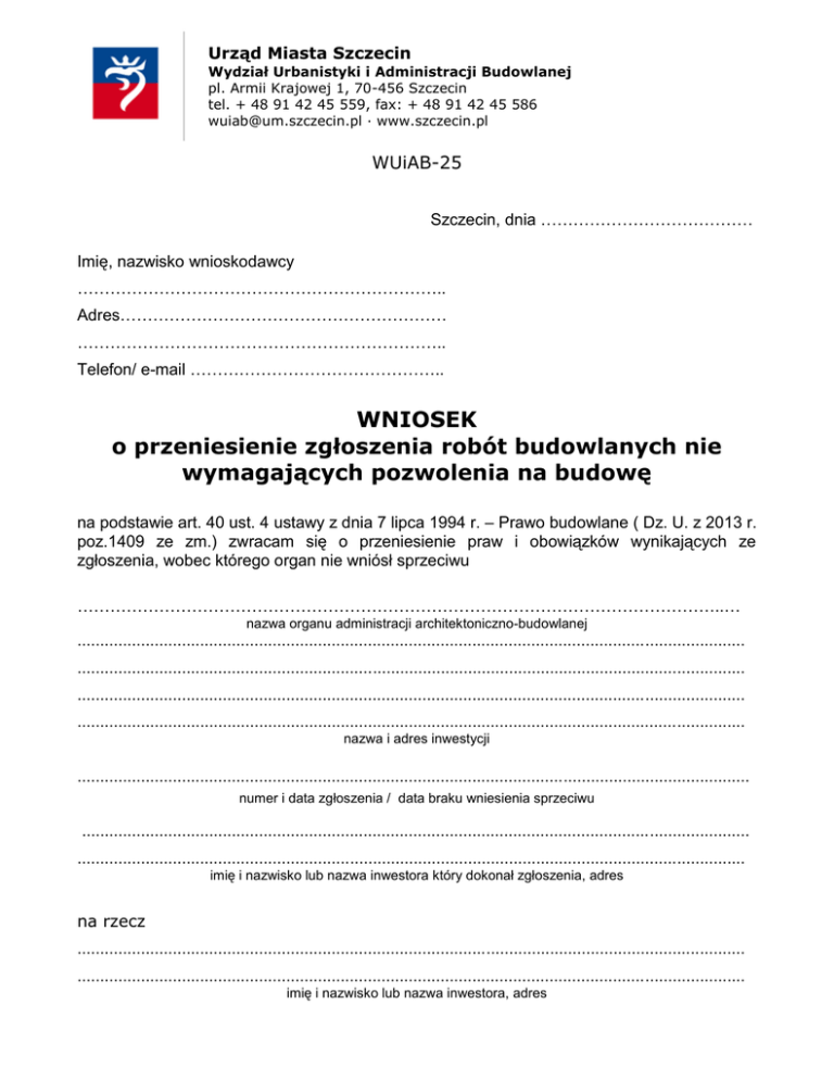 Urząd Miasta Szczecin Wydział Urbanistyki i Administracji Budowlanej pl. Armii Krajowej 1, 70-456 Szczecin tel. + 48 91 42 45 559, fax: + 48 91 42 45 586 [email protected] ∙ www.szczecin.pl WUiAB-25 Szczecin, dnia ………………………………… Imię, nazwisko wnioskodawcy ………………………………………………………….. Adres…………………………………………………… ………………………………………………………….. Telefon/ e-mail ……………………………………….. WNIOSEK o przeniesienie zgłoszenia robót budowlanych nie wymagających pozwolenia na budowę na podstawie art. 40 ust. 4 ustawy z dnia 7 lipca 1994 r. – Prawo budowlane ( Dz. U. z 2013 r. poz.1409 ze zm.) zwracam się o przeniesienie praw i obowiązków wynikających ze zgłoszenia, wobec którego organ nie wniósł sprzeciwu ………………………………………………………………………………………………………..… nazwa organu administracji architektoniczno-budowlanej ................................................................................................................................................... ................................................................................................................................................... ................................................................................................................................................... ................................................................................................................................................... nazwa i adres inwestycji .................................................................................................................................................... numer i data zgłoszenia / data braku wniesienia sprzeciwu ................................................................................................................................................... ................................................................................................................................................... imię i nazwisko lub nazwa inwestora który dokonał zgłoszenia, adres na rzecz ................................................................................................................................................... ................................................................................................................................................... imię i nazwisko lub nazwa inwestora, adres A. Oświadczenie inwestora, który dokonał zgłoszenia Ja................................................................................................................................................ ..................................................................................................................................................... imię i nazwisko lub nazwa inwestora który dokonał zgłoszenia, adres oświadczam, że wyrażam zgodę na przeniesienia praw i obowiązków wynikających ze zgłoszenia ......................................................................................................................................................................... podać numer i datę zgłoszenia, organ i datę nie wniesienia sprzeciwu na rzecz …………………………………………………………………………………………………………… …………………………………………………………………………………………………………… imię i nazwisko lub nazwa wstępującego w miejsce zgłaszającego, adres ...................................................... podpis B. Oświadczenie podmiotu wstępującego w miejsce inwestora: Ja ..................................................................................................................................... imię i nazwisko lub nazwa wstępującego w miejsce zgłaszającego, adres oświadczam, że przejmuję wszystkie prawa i obowiązki wynikające ze zgłoszenia ......................................................................................................................................... ......................................................................................................................................... podać nr i datę zgłoszenia, organ i datę nie wniesienia sprzeciwu ........................................................................................................................................ imię i nazwisko lub nazwa inwestora który dokonał zgłoszenia, adres .......................................... podpis Przedkładam następujące załączniki: 1. oświadczenie o posiadanym prawie do dysponowania nieruchomością na cele budowlane 2. …………………………………………………………………………………………………….. ............................................................... podpis wnioskodawcy