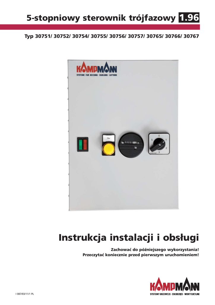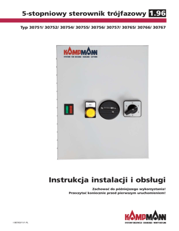 1.26 1.45 5-stopniowy sterownik trójfazowy 1.96 Typ 30751/ 30752/ 30754/ 30755/ 30756/ 30757/ 30765/ 30766/ 30767 Instrukcja instalacji i obsługi Zachować do późniejszego wykorzystania! Przeczytać koniecznie przed pierwszym uruchomieniem! I 087/03/11/1 PL 1.96 5-stopniowy sterownik trójfazowy Typ 30751/ 30752/ 30754/ 30755/ 30756/ 30757/ 30765/ 30766/ 30767 Instrukcja instalacji i montażu Objaśnienie znaków: Uwaga! Niebezpieczeństwo! N a s t ę p s t w e m nieprzestrzegania niniejszej wskazówki mogą być poważne szkody osobowe lub rzeczowe. Niebezpieczeństwo porażenia prądem! N a s t ę p s t w e m nieprzestrzegania niniejszej wskazówki mogą być poważne s z k o d y osobowe lub rzeczowe spowodowane przez prąd elektryczny. 1. Ważne wskazówki 1.1 1.2 Użycie zgodnie z przeznaczeniem . . . . . . . . . . . . . . . . . . . . . . Wskazówki dotyczące bezpieczeństwa . . . . . . . . . . . . . . . . . . 3 4 2. Montaż 2.1 2.2 2.3 2.4 2.5 Zabezpieczenie. . . . . . . . . . . . . . . . . . . . . . . . . . . . . . . . . . . . . . . . . Dane techniczne . . . . . . . . . . . . . . . . . . . . . . . . . . . . . . . . . . . . . Przyłącze elektryczne. . . . . . . . . . . . . . . . . . . . . . . . . . . . . . . . . . . . Przewody przyłączeniowe: . . . . . . . . . . . . . . . . . . . . . . . . . . . . Praca równoległa większej liczby aparatów grzewczo-wentylacyjnych . . . . . . . . . . . . . . . . . . . . . . . . . . . . . . 5 6 6 7 8 3. Obsługa . . . . . . . . . . . . . . . . . . . . . . . . . . . . . . . . . . . . . . . . . . . . . . . 9 4. Uruchomienie 4.1 4.2 4.3 Sprawdzenie przed uruchomieniem . . . . . . . . . . . . . . . . . . . . . Uruchomienie . . . . . . . . . . . . . . . . . . . . . . . . . . . . . . . . . . . . . . Kontrola podczas pracy . . . . . . . . . . . . . . . . . . . . . . . . . . . . . . Wskazówka Ważna wskazówka! W przypadku nieprzestrzegania nie można zagwarantować poprawnego działania urządzenia (urządzeń). Prosimy starannie zapoznać się z treścią niniejszej instrukcji przed rozpoczęciem montażu i instalacji! Wszystkie osoby, biorące udział w zabudowie, uruchomieniu i stosowaniu tego produktu mają obowiązek przekazania tej instrukcji wszystkim osobom, których to dotyczy, aż po użytkownika końcowego. Zmiany w treści lub szacie graficznej mogą być przeprowadzane bez wcześniejszej zapowiedzi! 10 10 11 5-stopniowy sterownik trójfazowy 1.96 Typ 30751/ 30752/ 30754/ 30755/ 30756/ 30757/ 30765/ 30766/ 30767 Instrukcja instalacji i montażu 1. Ważne wskazówki 1.1 Użycie zgodnie z przeznaczeniem 5-stopniowy sterownik trójfazowy firmy Kampmann został skonstruowany zgodnie ze stanem techniki i uznanymi zasadami bezpieczeństwa technicznego. Mimo to, może podczas użytkowania dojść do zagrożenia dla ludzi lub uszkodzeń urządzenia, jeżeli nie zostało ono zamontowane i uruchomione w sposób fachowy lub było użytkowane niezgodnie z przeznaczeniem. Obszary zastosowania Sterowniki firmy Kampmann typu 30751-30767 wolno stosować wyłącznie: w pomieszczeniach wewnętrznych (np. halach przemysłowych i magazynowych, pomieszczeniach biurowych, salach wystawowych, itp.) Sterowników firmy Kampmann typu 30751-30767 nie wolno stosować: w pomieszczeniach, w których występuje niebezpieczeństwo wybuchu, w pomieszczeniach z agresywną atmosferą, na zewnątrz Podczas montażu należy chronić urządzenie przed wilgocią. W razie wątpliwości odnośnie zastosowania należy skontaktować się z producentem. Każde inne użycie, wykraczające poza opisane, jest uznawane za niezgodne z przeznaczeniem. Za wynikające stąd szkody odpowiada wyłącznie użytkownik. Użytkowanie zgodne z przeznaczeniem obejmuje także przestrzeganie wskazówek dotyczących montażu, zawartych w niniejszej instrukcji. Wiedza fachowa Montaż i instalacja elektryczna tego wyrobu wymaga wiedzy specjalistycznej z zakresu ogrzewania, klimatyzacji, wentylacji i elektrotechniki. Wiedza ta, stanowiąca z reguły przedmiot nauczania zawodowego w powyższej specjalności, nie została tutaj opisana. Za szkody wynikające z nieprawidłowego montażu odpowiada użytkownik. W kombinacji z 5-stopniowymi sterownikami typu 30751-30767 mogą pracować następujące urządzenia firmy Kampmann: • Typoszeregi Airblock, TOP, TIP, Resistent, Ultra • Urządzenia z końcówką w oznaczeniu typu 36 i 38 • Wentylatory dachowe z 2-stopniowym silnikiem trójfazowym Zakres obowiązywania niniejszej instrukcji • Montaż • Instalacja elektryczna • Pierwsze uruchomienie i obsługa 3 1.96 5-stopniowy sterownik trójfazowy Typ 30751/ 30752/ 30754/ 30755/ 30756/ 30757/ 30765/ 30766/ 30767 Instrukcja instalacji i montażu Przepisy • Przepisy BHP oraz dotyczące zapobieganiu wypadkom • DIN VDE 0100, DIN VDE 0105 • EN 60730 (część 1) • Przepisy (TABs) i lokalnego zakładu energetycznego jak również ogólnie znane reguły techniki 1.2 Wskazówki dotyczące bezpieczeństwa Instalację i montaż oraz prace konserwacyjne przy urządzeniach elektrycznych mogą wykonywać tylko elektroinstalatorzy posiadający odpowiednie uprawnienia SEP. Przyłączenie należy wykonać zgodnie z obowiązującymi przepisami SEP i wytycznymi zakładu energetycznego. Instalator tego urządzenia powinien w związku ze swoim wykształceniem zawodowym posiadać wystarczającą wiedzę o - przepisach dotyczących bezpieczeństwa i zapobiegania wypadkom, - wytycznych i obowiązujących zasadach techniki, jak np. przepisy SEP, normy DIN i EN. Uwaga: W przypadku nieprzestrzegania przepisów obsługi mogą wystąpić zakłócenia działania następczymi i zagrożeniem dla osób. Błędne polegające na zamianie przewodów grozi niebezpieczeństwem! i instrukcji ze szkodami przyłączenie śmiertelnym Praca ze świadomością bezpieczeństwa • Podczas prac konserwacyjnych odłączyć wszystkie elementy instalacji od napięcia! • Zabezpieczyć instalację przed nieuprawnionym ponownym załączenie