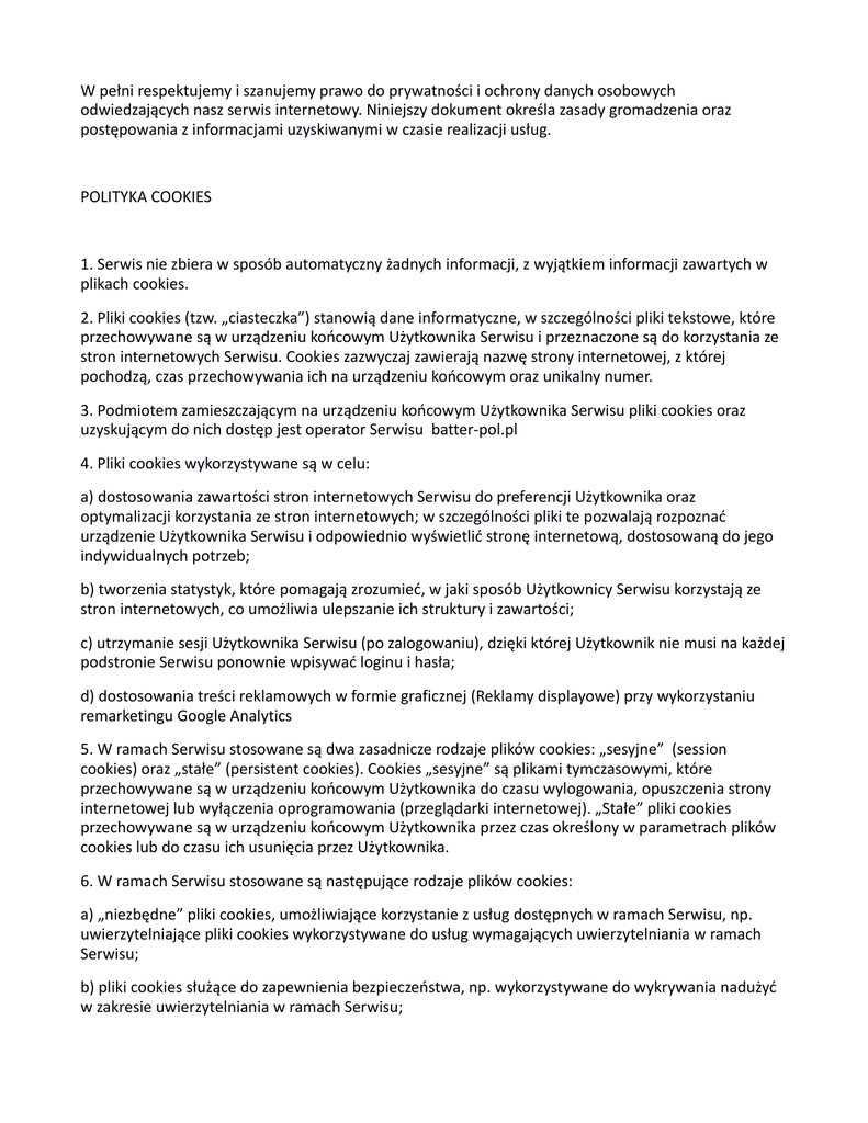 W pełni respektujemy i szanujemy prawo do prywatności i ochrony danych osobowych odwiedzających nasz serwis internetowy. Niniejszy dokument określa zasady gromadzenia oraz postępowania z informacjami uzyskiwanymi w czasie realizacji usług. POLITYKA COOKIES 1. Serwis nie zbiera w sposób automatyczny żadnych informacji, z wyjątkiem informacji zawartych w plikach cookies. 2. Pliki cookies (tzw. „ciasteczka”) stanowią dane informatyczne, w szczególności pliki tekstowe, które przechowywane są w urządzeniu końcowym Użytkownika Serwisu i przeznaczone są do korzystania ze stron internetowych Serwisu. Cookies zazwyczaj zawierają nazwę strony internetowej, z której pochodzą, czas przechowywania ich na urządzeniu końcowym oraz unikalny numer. 3. Podmiotem zamieszczającym na urządzeniu końcowym Użytkownika Serwisu pliki cookies oraz uzyskującym do nich dostęp jest operator Serwisu batter-pol.pl 4. Pliki cookies wykorzystywane są w celu: a) dostosowania zawartości stron internetowych Serwisu do preferencji Użytkownika oraz optymalizacji korzystania ze stron internetowych; w szczególności pliki te pozwalają rozpoznać urządzenie Użytkownika Serwisu i odpowiednio wyświetlić stronę internetową, dostosowaną do jego indywidualnych potrzeb; b) tworzenia statystyk, które pomagają zrozumieć, w jaki sposób Użytkownicy Serwisu korzystają ze stron internetowych, co umożliwia ulepszanie ich struktury i zawartości; c) utrzymanie sesji Użytkownika Serwisu (po zalogowaniu), dzięki której Użytkownik nie musi na każdej podstronie Serwisu ponownie wpisywać loginu i hasła; d) dostosowania treści reklamowych w formie graficznej (Reklamy displayowe) przy wykorzystaniu remarketingu Google Analytics 5. W ramach Serwisu stosowane są dwa zasadnicze rodzaje plików cookies: „sesyjne” (session cookies) oraz „stałe” (persistent cookies). Cookies „sesyjne” są plikami tymczasowymi, które przechowywane są w urządzeniu końcowym Użytkownika do czasu wylogowania, opuszczenia strony internetowej lub wyłączenia oprogramowania (przeglądarki internetowej). „Stałe” pliki cookies przechowywane są w urządzeniu końcowym Użytkownika przez czas określony w parametrach plików cookies lub do czasu ich usunięcia przez Użytkownika. 6. W ramach Serwisu stosowane są następujące rodzaje plików cookies: a) „niezbędne” pliki cookies, umożliwiające korzystanie z usług dostępnych w ramach Serwisu, np. uwierzytelniające pliki cookies wykorzystywane do usług wymagających uwierzytelniania w ramach Serwisu; b) pliki cookies służące do zapewnienia bezpieczeństwa, np. wykorzystywane do wykrywania nadużyć w zakresie uwierzytelniania w ramach Serwisu; c) „wydajnościowe” pliki cookies, umożliwiające zbieranie informacji o sposobie korzystania ze stron internetowych Serwisu; d) „funkcjonalne” pliki cookies, umożliwiające „zapamiętanie” wybranych przez Użytkownika ustawień i personalizację interfejsu Użytkownika, np. w zakresie wybranego języka lub regionu, z którego pochodzi Użytkownik, rozmiaru czcionki, wyglądu strony internetowej itp.; e) „reklamowe” pliki cookies, umożliwiające dostarczanie Użytkownikom treści reklamowych bardziej dostosowanych do ich zainteresowań. 7. W wielu przypadkach oprogramowanie służące do przeglądania stron internetowych (przeglądarka internetowa) domyślnie dopuszcza przechowywanie plików cookies w urządzeniu końcowym Użytkownika. Użytkownicy Serwisu mogą dokonać w każdym czasie zmiany ustawień dotyczących plików cookies. Ustawienia te mogą zostać zmienione w szczególności w taki sposób, aby blokować automatyczną obsługę plików cookies w ustawieniach przeglądarki internetowej bądź informować o ich każdorazowym zamieszczeniu w urządzeniu Użytkownika Serwisu. Szczegółowe informacje o możliwości i sposobach obsługi plików cookies dostępne są w ustawieniach oprogramowania (przeglądarki internetowej). Użytkownicy mogą zablokować usługę Analytics dla reklam displayowych oraz dostosowywać reklamy w sieci reklamowej Google w Menedżerze preferencji reklam. Można również pobrać program blokujący Google Analytics ze strony https://tools.google.com/dlpage/gaoptout/ 8. Operator Serwisu informuje, że ograniczenia stosowania plików cookies mogą wpłynąć na niektóre funkcjonalności dostępne na stronach internetowych Serwisu. 9. Pliki cookies zamieszczane w urządzeniu końcowym Użytkownika Serwisu i wykorzystywane mogą być również przez współpracujących z operatorem Serwisu reklamodawców oraz partnerów. 10. Więcej informacji na temat plików cookies dostępnych jest pod adresem http://wszystkoociasteczkach.pl lub w sekcji „Pomoc” w menu przeglądarki internetowej.