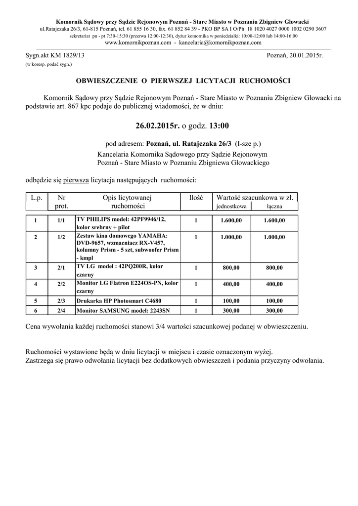 Komornik Sądowy przy Sądzie Rejonowym Poznań - Stare Miasto w Poznaniu Zbigniew Głowacki ul.Ratajczaka 26/3, 61-815 Poznań, tel. 61 855 16 30, fax. 61 852 84 39 - PKO BP SA I O/Pń 18 1020 4027 0000 1002 0290 3607 sekretariat pn - pt 7:30-15:30 (przerwa 12:00-12:30), dyżur komornika w poniedziałki: 10:00-12:00 lub 14:00-16:00 www.komornikpoznan.com - [email protected] Sygn.akt KM 1829/13 Poznań, 20.01.2015r. (w koresp. podać sygn.) OBWIESZCZENIE O PIERWSZEJ LICYTACJI RUCHOMOŚCI Komornik Sądowy przy Sądzie Rejonowym Poznań - Stare Miasto w Poznaniu Zbigniew Głowacki na podstawie art. 867 kpc podaje do publicznej wiadomości, że w dniu: 26.02.2015r. o godz. 13:00 pod adresem: Poznań, ul. Ratajczaka 26/3 (I-sze p.) Kancelaria Komornika Sądowego przy Sądzie Rejonowym Poznań - Stare Miasto w Poznaniu Zbigniewa Głowackiego odbędzie się pierwsza licytacja następujących ruchomości: L.p. Nr prot. Opis licytowanej ruchomości Ilość 1 1/1 2 1/2 3 2/1 4 2/2 TV PHILIPS model: 42PF9946/12, kolor srebrny + pilot Zestaw kina domowego YAMAHA: DVD-9657, wzmacniacz RX-V457, kolumny Prism - 5 szt, subwoofer Prism - kmpl TV LG model : 42PQ200R, kolor czarny Monitor LG Flatron E224OS-PN, kolor czarny 5 2/3 6 2/4 Wartość szacunkowa w zł. jednostkowa łączna 1 1.600,00 1.600,00 1 1.000,00 1.000,00 1 800,00 800,00 1 400,00 400,00 Drukarka HP Photosmart C4680 1 100,00 100,00 Monitor SAMSUNG model: 2243SN 1 300,00 300,00 Cena wywołania każdej ruchomości stanowi 3/4 wartości szacunkowej podanej w obwieszczeniu. Ruchomości wystawione będą w dniu licytacji w miejscu i czasie oznaczonym wyżej. Zastrzega się prawo odwołania licytacji bez dodatkowych obwieszczeń i podania przyczyny odwołania.