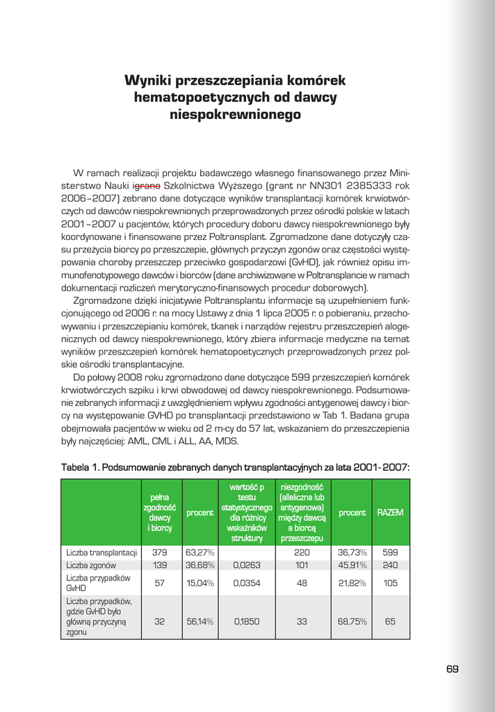 Wyniki przeszczepiania komórek hematopoetycznych od dawcy niespokrewnionego W ramach realizacji projektu badawczego w³asnego finansowanego przez Ministerstwo Nauki igrano Szkolnictwa Wy¿szego (grant nr NN301 2385333 rok 20062007) zebrano dane dotycz¹ce wyników transplantacji komórek krwiotwórczych od dawców niespokrewnionych przeprowadzonych przez orodki polskie w latach 20012007 u pacjentów, których procedury doboru dawcy niespokrewnionego by³y koordynowane i finansowane przez Poltransplant. Zgromadzone dane dotyczy³y czasu prze¿ycia biorcy po przeszczepie, g³ównych przyczyn zgonów oraz czêstoci wystêpowania choroby przeszczep przeciwko gospodarzowi (GvHD), jak równie¿ opisu immunofenotypowego dawców i biorców (dane archiwizowane w Poltransplancie w ramach dokumentacji rozliczeñ merytoryczno-finansowych procedur doborowych). Zgromadzone dziêki inicjatywie Poltransplantu informacje s¹ uzupe³nieniem funkcjonuj¹cego od 2006 r. na mocy Ustawy z dnia 1 lipca 2005 r. o pobieraniu, przechowywaniu i przeszczepianiu komórek, tkanek i narz¹dów rejestru przeszczepieñ alogenicznych od dawcy niespokrewnionego, który zbiera informacje medyczne na temat wyników przeszczepieñ komórek hematopoetycznych przeprowadzonych przez polskie orodki transplantacyjne. Do po³owy 2008 roku zgromadzono dane dotycz¹ce 599 przeszczepieñ komórek krwiotwórczych szpiku i krwi obwodowej od dawcy niespokrewnionego. Podsumowanie zebranych informacji z uwzglêdnieniem wp³ywu zgodnoci antygenowej dawcy i biorcy na wystêpowanie GVHD po transplantacji przedstawiono w Tab 1. Badana grupa obejmowa³a pacjentów w wieku od 2 m-cy do 57 lat, wskazaniem do przeszczepienia by³y najczêciej: AML, CML i ALL, AA, MDS. Tabela 1. Podsumowanie zebranych danych transplantacyjnych za lata 2001- 2007: pe³na zgodnoæ dawcy i biorcy Liczba transplantacji Liczba zgonów Liczba przypadków GvHD Liczba przypadków, gdzie GvHD by³o g³ówn¹ przyczyn¹ zgonu wartoæ p testu statystycznego procent dla ró¿nicy wskaników struktury niezgodnoæ (alleliczna lub antygenowa) miêdzy dawc¹ a biorc¹ przeszczepu procent RAZEM 379 139 63,27% 36,68% 0,0263 220 101 36,73% 45,91% 599 240 57 15,04% 0,0354 48 21,82% 105 32 56,14% 0,1850 33 68,75% 65 69 U biorców, którzy otrzymali przeszczep od dawcy nie w pe³ni dopasowanego zaobserwowano statystycznie istotne zwiêkszenie czêstoci wystêpowania objawów GvHD, natomiast hipoteza o wiêkszej miertelnoci powi¹zanej z wyst¹pieniem GvHD w grupie pacjentów przeszczepionych od nieoptymalnego dawcy nie znajduje statystycznego potwierdzenia (p > 0,05). Zauwa¿ono natomiast istotne podwy¿szenie ryzyka i skrócenie czasu prze¿ycia po przeszczepie u pacjentów, u których zdiagnozowano GvHD (bez wzglêdu na dopasowanie dawcy) (Rys. 1). Opieraj¹c siê na dostêpnych zestawieniach wyników procedur doborowych ustalono, ¿e w latach 20012007 najczêciej akceptowano niezgodnoci w HLA-Cw, potem w HLA-DQB1, najrzadziej decydowano siê na przeszczepienie komórek hematopoetycznych od dawców niedopasowanych w HLA-DRB1 (5% przypadków przeszczepieñ od dawcy nieoptymalnego). Ta be la 2. Pr ze s zcze pie n ia k omór e k k r wiot wór czy ch od da wcy n ie s pok r e wn ion e go wed³ug akceptowanych niezgodnoci: Pacjenci przeszczepieni od dawcy z niezgodnoci¹ w locus: HLA-Cw HLA-B HLA-DR HLA-A HLA-DQ z niezgodnoci¹ w 2 loci razem Liczba procent 108 21 11 15 33 32 220 49,09% 9,55% 5,00% 6,82% 15,00% 14,55% 100% Tabela 3. Wiek biorców przeszczepu komórek krwiotwórczych od dawcy niespokrewnionego. wiek biorcy w chwili przeszczepienia (w latach) 05 610 1115 1620 2125 2630 3135 3640 4145 pow. 45 70 procent 12,50% 8,47% 9,07% 11,09% 14,52% 11,29% 11,09% 9,07% 6,05% 6,85% Rys. 1. Porównanie krzywych prze¿ycia dla pacjentów, u których stwierdzono GvHD i pacjentów bez objawów GvHD (p = 0,000) (log rank test). Na osi x od³o¿ono czas prze¿y cia po przeszczepie (w dniach). Stosunkowo czêsto dochodzi³o do transplantacji, je¿eli dawca by³ niezgodny z biorc¹ w wiêcej ni¿ jednym loci (ponad 14% przypadków), co mog³o byæ zwi¹zane z rzadkoci¹ haplotypów biorcy i trudnoci¹ doboru dawcy w pe³ni zgodnego po³¹czon¹ z pilnoci¹ przeszczepienia. Na podstawie informacji o stopniu zgodnoci miêdzy dawc¹ i biorc¹ przeszczepu z komórek hematopoetycznych wykonano analizê wp³ywu poziomu zgodnoci (poziom allelu lub antygenu) oraz rodzaju locus, którego dotyczy³a niezgodnoæ na prze¿ycie pacjentów po HSCT. Sporód pacjentów wyodrêbniono grupê kontroln¹, któr¹ stanowili biorcy przeszczepieni od w pe³ni zgodnego dawcy (FM- FULLMATCH Rys. 2, 3, 4). Pe³na zgodnoæ, szczególnie dla pacjentów przeszczepianych przed 2004 rokiem, nie zawsze oznacza³a zgodnoæ na poziomie wysokiej rozdzielczoci, co jest zwi¹zane ze zmianami standardów typowania HLA. Dlatego z analizowanej grupy wyodrêbniono pacjentów przeszczepionych po 2004 roku, typowanych wed³ug obecnie obowi¹zuj¹cego standardu typowania (10 antygenów HLA A, B, C , DRB1 i DQB1 na poziomie wysokiej rozdzielczoci) i powtórzono analizê prze¿ycia, której wyniki przedstawiono na Rys. 3. Wp³yw niezgodnoci HLA na prze¿ycie pacjentów w obu przypadkach by³ podobny i istotny statystycznie, natomiast prawdopodobieñstwo prze¿ycia pacjentów po roku 2004 jest wyranie wy¿sze (krzywa kontrolna stabilizuje siê na poziomie ok. 60%). Na podstawie zgromadzonych danych nie uda³o siê okreliæ wp³ywu locus, którego dotyczy niezgodnoæ miêdzy dawc¹ a biorc¹ przeszczepu na wyniki transplantacji (Rys.3). Nie zauwa¿ono te¿ istotnej ró¿nicy miêdzy krzyw¹ prze¿ycia dla pacjentów przeszczepionych od dawcy niezgodnego na poziomie allelu a krzyw¹ otrzyman¹ dla pacjentów przeszczepionych od dawców niezgodnych na poziomie antygenu HLA (Rys.4) 71 Rys. 2. Prze¿ycia pacjentów, którzy otrzymali przeszczep z komórek hematopoetycznych od dawcy w pe³ni zgodnego (FM) i od dawcy z niezgodnoci¹ (MM) w jednym ant
