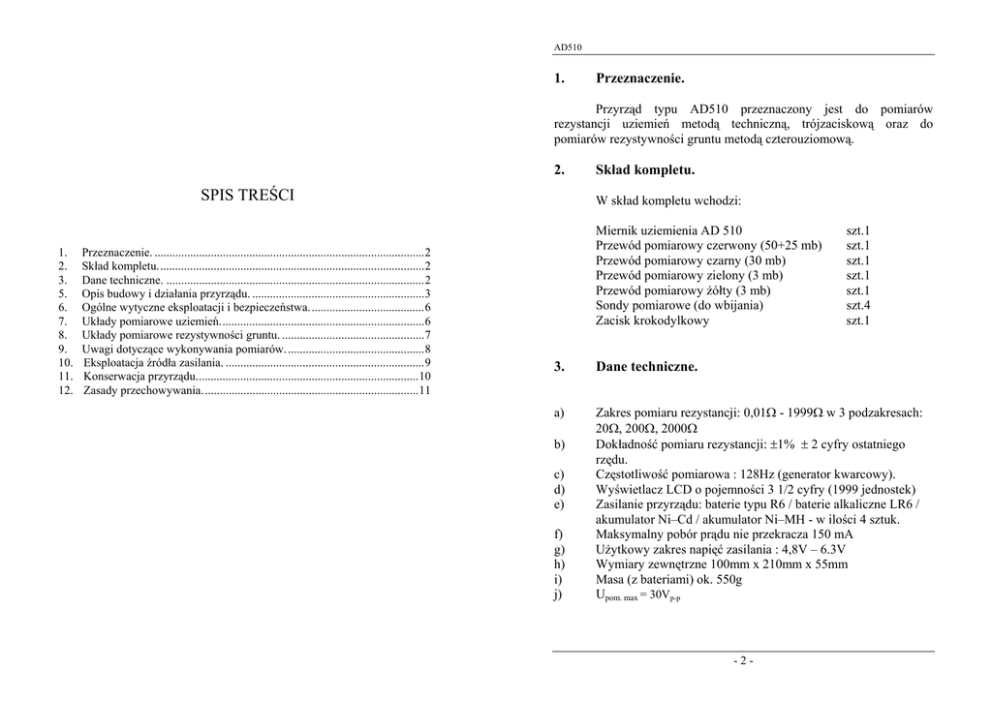 AD510 1. Przeznaczenie. Przyrząd typu AD510 przeznaczony jest do pomiarów rezystancji uziemień metodą techniczną, trójzaciskową oraz do pomiarów rezystywności gruntu metodą czterouziomową. 2. SPIS TREŚCI 1. 2. 3. 5. 6. 7. 8. 9. 10. 11. 12. Przeznaczenie. ...........................................................................................2 Skład kompletu..........................................................................................2 Dane techniczne. .......................................................................................2 Opis budowy i działania przyrządu. ..........................................................3 Ogólne wytyczne eksploatacji i bezpieczeństwa.......................................6 Układy pomiarowe uziemień.....................................................................6 Układy pomiarowe rezystywności gruntu. ................................................7 Uwagi dotyczące wykonywania pomiarów. ..............................................8 Eksploatacja źródła zasilania. ...................................................................9 Konserwacja przyrządu...........................................................................10 Zasady przechowywania. ........................................................................11 Skład kompletu. W skład kompletu wchodzi: Miernik uziemienia AD 510 Przewód pomiarowy czerwony (50+25 mb) Przewód pomiarowy czarny (30 mb) Przewód pomiarowy zielony (3 mb) Przewód pomiarowy żółty (3 mb) Sondy pomiarowe (do wbijania) Zacisk krokodylkowy szt.1 szt.1 szt.1 szt.1 szt.1 szt.4 szt.1 3. Dane techniczne. a) Zakres pomiaru rezystancji: 0,01Ω - 1999Ω w 3 podzakresach: 20Ω, 200Ω, 2000Ω Dokładność pomiaru rezystancji: ±1% ± 2 cyfry ostatniego rzędu. Częstotliwość pomiarowa : 128Hz (generator kwarcowy). Wyświetlacz LCD o pojemności 3 1/2 cyfry (1999 jednostek) Zasilanie przyrządu: baterie typu R6 / baterie alkaliczne LR6 / akumulator Ni–Cd / akumulator Ni–MH - w ilości 4 sztuk. Maksymalny pobór prądu nie przekracza 150 mA Użytkowy zakres napięć zasilania : 4,8V – 6.3V Wymiary zewnętrzne 100mm x 210mm x 55mm Masa (z bateriami) ok. 550g Upom. max = 30Vp-p b) c) d) e) f) g) h) i) j) -2- AD510 4. Znamionowe warunki użytkowania. a) b) Temperatura otoczenia podczas pracy: -5 C°..... 23 C°.....40 C° Wilgotność względna otaczającego powietrza: 25....45....75....85% AD510 E S ES S1 GKD zacisk pomiarowy prądowy „zimny” zacisk pomiarowy napięciowy „gorący” zacisk pomiarowy napięciowy „zimny” klucz zwierający zaciski E-ES generator kwarcowy z dzielnikiem częstotliwości Miernik nie powinien podlegać bezpośredniemu nasłonecznieniu oraz działaniu wody. Powietrze otaczające nie powinno zawierać zanieczyszczeń powodujących korozję. 5. 1 Opis budowy i działania przyrządu. S H GU- ES E Ui W Ro GU+ TYPE AD 510 2 3WRE/4WRE U’i Rw DS 128Hz GKD EARTH TESTER S1 16 ON OFF BATT. 4 15 14 US 13 Ux 12 START E RANGE ES 4 WIRE E STOP HOLD 3 WIRE 11 GU Ro DS. Rw a/d w LCD K H generator napięcia przemiennego o f=128Hz rezystor ograniczający prostownik synchroniczny rezystancja wzorcowa przetwornik analogowo-cyfrowy wzmacniacz napięciowy wyświetlacz ciekłokrystaliczny klawiatura sterująca zacisk pomiarowy prądowy „gorący” -3- 7 8 9 10 rys. 2 5 6 ES LCD K 3 E ES S H rys. 1 1. 2. 3. 4. Wyświetlacz LCD. Wyłącznik przyrządu. Klawisz kontroli baterii. Cykliczna zmiana podzakresów: 2kΩ →200Ω → 20Ω → 2kΩ → ... . 5. Zatrzymanie pomiaru. -4- AD510 Pomiar metodą trójprzewodową. Zatrzaśnięcie wyniku pomiaru. 8,9,10,11. Gniazda pomiarowe. 12. Pomiar metodą czteroprzewodową. 13. Sygnalizacja włączenia metody czteroprzewodowej. 14. Uruchomienie pomiaru. 15. Sygnalizacja trwania pomiaru. 16. Włącznik przyrządu. 6. 7. Przyrząd AD510 wykonano w oparciu o układy logiczne CMOS, oraz precyzyjne wzmacniacze operacyjne o bardzo niskim napięciu niezrównoważenia. Generator napięcia przemiennego GU+/GU- wytwarza pomiarowe napięcie o kształcie prostokątnym, symetryczne względem masy przyrządu o amplitudzie ok. 30V RMS. Napięcie to poprzez blok rezystorów ograniczających Ro, zależnych od podzakresu pomiarowego podawane jest na gniazdo pomiarowe H, poprzez układ zabezpieczeń (nie zaznaczony na rysunku). Częstotliwość napięcia pomiarowego wynosząca 128Hz, pochodzi z generatora kwarcowego i jej wartość jest tak dobrana aby został spełniony warunek: f = n fs, gdzie fs = 50Hz; aby uniknąć błędnych wskazań spowodowanych obecnością zakłóceń o częstotliwości sieci energetycznej i jej harmonicznych. Gniazda napięciowe współpracują z synchronicznym prostownikiem symetrycznym, taktowanym z częstotliwością sygnału pomiarowego 128Hz. Powstałe napięcie Ux doprowadzone jest do przetwornika analogowo- cyfrowego a/d. Przetwornik a/d realizuje funkcję ilorazu : N= AD510 Na wyświetlaczu LCD ukazuje się liczba N z odpowiednią pozycją przecinka dziesiętnego, będąca wynikiem pomiaru rezystancji. Układ sterujący US, współpracujący z klawiaturą K, steruje pracą i wyborem funkcji urządzenia. 6. Ogólne wytyczne eksploatacji i bezpieczeństwa. Miernik wykonano w II klasie ochronności z obudową izolacyjną. Przed dołączeniem przewodów pomiarowych do obiektu należy upewnić się, czy na obiekcie nie występuje niebezpieczne napięcie. 7. Układy pomiarowe uziemień. Przyrząd AD510 pracuje w oparciu o tzw. techniczną metodę pomiaru. Sposób pomiaru przedstawiono na rys.3 E ES S H mU U U x =m x = m x =pR . x U′ k U k Rw I x i i gdzie: m – stała przetwornika a/d, k – wzmocnienie wzmacniacza, Rw – rezystancja wzorcowa dla danego podzakresu, Rx – mierzona rezystancja. Rx = -5- U x. I x Ux 20m 20m rys. 3 Przyrząd AD510 ustawiony jest w pozycji „3 wire” -6- AD510 AD510 Rx – rezystancja badanego uziomu Sn – sonda napięciowa Sp – sonda prądowa b) metoda Wen