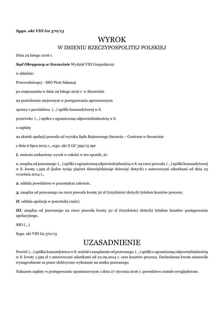 Sygn. akt VIII Ga 370/15 WYROK W IMIENIU RZECZYPOSPOLITEJ POLSKIEJ Dnia 29 lutego 2016 r. Sąd Okręgowy w Szczecinie Wydział VIII Gospodarczy w składzie: Przewodniczący - SSO Piotr Sałamaj po rozpoznaniu w dniu 29 lutego 2016 r. w Szczecinie na posiedzeniu niejawnym w postępowaniu uproszczonym sprawy z powództwa (...) spółki komandytowej w S. przeciwko (...) spółce z ograniczoną odpowiedzialnością w S. o zapłatę na skutek apelacji powoda od wyroku Sądu Rejonowego Szczecin – Centrum w Szczecinie z dnia 6 lipca 2015 r., sygn. akt X GC 399/15 upr I. zmienia zaskarżony wyrok w całości w ten sposób, że: 1. zasądza od pozwanego (...) spółki z ograniczoną odpowiedzialnością w S. na rzecz powoda (...) spółki komandytowej w S. kwotę 1.599 zł (jeden tysiąc pięćset dziewięćdziesiąt dziewięć złotych) z ustawowymi odsetkami od dnia 25 września 2014 r., 2. oddala powództwo w pozostałym zakresie, 3. zasądza od pozwanego na rzecz powoda kwotę 30 zł (trzydzieści złotych) tytułem kosztów procesu; II. oddala apelację w pozostałej części; III. zasądza od pozwanego na rzecz powoda kwotę 30 zł (trzydzieści złotych) tytułem kosztów postępowania apelacyjnego. SSO (...) Sygn. akt VIII Ga 370/15 UZASADNIENIE Powód (...) spółka komandytowa w S. wniósł o zasądzenie od pozwanego (...) spółki z ograniczoną odpowiedzialnością w S. kwoty 1.599 zł z ustawowymi odsetkami od 22.09.2014 r. oraz kosztów procesu. Dochodzona kwota stanowiła wynagrodzenie za prace elektryczne wykonane na statku pozwanego. Nakazem zapłaty w postępowaniu upominawczym z dnia 27 stycznia 2016 r. powództwo zostało uwzględnione. W sprzeciwie od powyższego nakazu pozwany wniósł o oddalenie powództwa i zasądzenie od powoda kosztów postępowania. Wyrokiem z dnia 6 lipca 2015 r. (sygn. akt XI GC 399/15 upr) Sąd Rejonowy Szczecin - Centrum w Szczecinie oddalił powództwo i zasądził od powoda na rzecz pozwanej kwotę 617 zł tytułem zwrotu kosztów procesu. Sąd Rejonowy wskazał, że pracownicy powódki w lipcu 2014 r. naprawiali na statku pozwanego nieprawidłowo przez nich usuniętą w czerwcu 2014 r. usterkę. W ocenie Sądu Rejonowego powodowi nie przysługuje wynagrodzenie za prace wykonane w lipcu 2014 r. Powód zaskarżył powyższy wyrok w całości, zarzucając orzeczeniu: 1) naruszenie przepisów prawa procesowego, tj. art. 233 § 1 k.p.c. poprzez niedokonanie wszechstronnej oceny materiału dowodowego oraz dowolną, a nie swobodną ocenę dowodów, co skutkowało w szczególności: a) nieprawidłową oceną jakości wykonanej naprawy skutkującej przyjęciem, jakoby pozwana, zgodnie z brzmieniem art. 636 § 1 k.c. została wezwana do usunięcia zaistniałej usterki w urządzeniu (...) definitywnie, a tym samym wykonała dzieło w sposób wadliwy albo sprzeczny z umową, b) nieuzasadnione przyjęcie, jako niemożliwe do ustalenia, na podstawie zgromadzonego materiału dowodowego, iż powódka wykonywała dodatkowe prace zlecone przez pozwaną jako dwie odrębne prace dotyczące naprawy odrębnych podzespołów tego samego elementu; 2) naruszenie przepisów prawa materialnego, tj. art. 6 k.c. poprzez przyjęcie, że powódka niedostatecznie udowodniła fakt konieczności przeprowadzenia dodatkowej naprawy odrębnego zespołu wcześniej serwisowanego urządzenia (...), mimo, że przedstawiła rzetelne dowody na poparcie swoich tez z pozwu, a pozwana zakwestionowała tę naprawę dopiero po upływie miesiąca od wystawienia faktury; 3) błąd w ustaleniach faktycznych poprzez przyjęcie, że pomimo nieotrzymania przez powódkę zlecenia przystąpiła do wykonywania prac, co odczytywać należy jako zgodę na wykonywanie prac na podstawie poprzedniego zlecenia serwisowego. Mając na uwadze powyższe zarzuty powód wniósł o zmianę zaskarżonego wyroku poprzez uwzględnienie powództwa w całości oraz zasądzenie na jego rzecz zwrotu kosztów procesu za obie instancje, ewentualnie przekazanie sprawy sądowi I instancji do ponownego orzekania oraz orzekania o kosztach procesu za obie instancje. W odpowiedzi na apelację pozwany wniósł o jej oddalenie i zasądzenie na jego rzecz zwrotu kosztów procesu. Sąd Okręgowy ustalił i zważył, co następuje: Apelacja okazała się uzasadniona, doprowadzając do zmiany wyroku i uwzględnienia powództwa. Zaznaczyć należy, że sprawa była rozpoznawana w postępowaniu uproszczonym, zaś Sąd odwoławczy nie przeprowadzał postępowania dowodowego, zatem zgodnie z art. 50513 § 2 k.p.c. uzasadnienie niniejszego orzeczenia powinno zawierać jedynie wyjaśnienie podstawy prawnej wyroku z przytoczeniem przepisów prawa. Katalog zarzutów, które skarżąca może uczynić podstawą apelacji jest w postępowaniu uproszczonym ograniczony do zarzutu naruszenia prawa materialnego przez błędną jego wykładnię lub niewłaściwe zastosowanie oraz naruszenia przepisów postępowania, jeżeli mogło ono mieć wpływ na wynik sprawy (art. 5059 § 1 k.p.c.). Enumeratywne wyliczenie zarzutów mogących stanowić podstawę apelacji oznacza, że w postępowaniu uproszczonym ten środek odwoławczy ma charakter ograniczony, a sąd odwoławczy rozpoznaje sprawę w granicach wyznaczonych przez treść podniesionych zarzutów apelacyjnych. Apelacja w tym postępowaniu ma charakter apelacji ograniczonej. Jej funkcją nie jest ponowne rozpoznanie sprawy, lecz wyłącznie kontrola wyroku wydanego przez sąd I instancji. Sąd odwoławczy nie rozpoznaje powództwa (roszczenia), a jedynie trafność (słuszność) zaskarżonego rozstrzygnięcia. Chodzi tu o zgodność z materiałem procesowym pozostającym w dyspozycji sądu orzekającego (por. uchwała składu 7 sędziów Sądu Najwyższego z dnia 31 stycznia 2008 r., III CZP 49/07). W związku z powyższym wyjaśnić należy, że podstawą zarzutu apelacji uproszczonej nie może być błędne ustalenie stanu faktycznego sprawy przez sąd I instancji jeżeli nie wiąże się z zarz