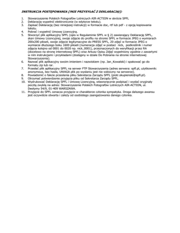 INSTRUKCJA POSTĘPOWANIA [!NIE PRZYSYŁAĆ Z DEKLARACJĄ!]: 1. 2. 3. Stowarzyszenie Polskich Fotografów Lotniczych AIR-ACTION w skrócie SPFL Deklarację wypełnić elektronicznie (w edytorze tekstu). Zapisać Deklarację (bez niniejszej instrukcji) w formacie doc, rtf lub pdf - z opcją kopiowania tekstu. 4. Pobrać i wypełnić Umowę Licencyjną. 5. Stworzyć plik aplikacyjny SPFL (opis w Regulaminie SPFL w § 2) zawierający Deklarację SPFL, skan Umowy Licencyjnej, swoje zdjęcie do profilu na stronie SPFL w formacie JPEG o wymiarach 200x200 pikseli, swoje zdjęcie legitymacyjne do PRESS SPFL, 20 zdjęć w formacie JPEG o wymiarze dłuższego boku 1600 pikseli (numeracja zdjęć w postaci nick, podkreślnik i numer zdjęcia kolejno od 0001 do 0020 np. nick_0001), przeznaczonych do weryfikacji przez RA (docelowo na stronę internetową SPFL) oraz Arkusz Opisu Zdjęć wypełniony zgodnie z zawartymi w nim instrukcjami i przykładami (dostępny w dziale Do Pobrania na stronie internetowej Stowarzyszenia). 6. Nazwać plik aplikacyjny swoim imieniem i nazwiskiem (np. Jan_Kowalski) i spakować go do formatu zip lub rar. 7. Przesłać plik aplikacyjny SPFL na serwer FTP Stowarzyszenia (adres serwera: spfl.pl, użytkownik: anonymous, bez hasła, UWAGA plik po wysłaniu jest nie widoczny na serwerze). 8. Powiadomić o fakcie przesłania pliku Sekretarza Zarządu SPFL ([email protected]). 9. Otrzymać potwierdzenie przyjęcia pliku od Sekretarza Zarządu SPFL. 10. Wydrukować Deklarację SPFL i Umowę Licencyjną, własnoręcznie podpisać i wysłać oryginały pocztą zwykłą na adres: Stowarzyszenie Polskich Fotografów Lotniczych AIR-ACTION, ul. Deotymy 54/9, 01-409 WARSZAWA. 11. Przyjęcie do SPFL oznacza przyjęcie w charakterze członka sympatyka. Droga dalszego awansu jest oczywiście otwarta i zależy od osobistego zaangażowania danego członka. .........................................................., ....................... Miejscowość Data DEKLARACJA SPFL Niniejszym ja, ………………………………………………………………...................................................................….......……… imię i nazwisko kandydata ………………………………………………………………..........................................................................………… adres zamieszkania ……………………………………………… ………..........................................................................………… ……………………………………………… ....................................................................................……… telefon kontaktowy seria i numer dowodu osobistego data i miejsce urodzenia PESEL ………………………………………………………………..........................................................................………… adres poczty elektronicznej ………………………………………………………………..........................................................................………… adres strony www (jeśli chcesz by jej adres był podawany na stronach SPFL) ………………………………………………………………..........................................................................………… nick na forum (zostanie zamieszczony na stronie SPFL) Proszę o przyjęcie mnie do Stowarzyszenia Polskich Fotografów Lotniczych AIR-ACTION. Oświadczam, że zapoznałem się ze Statutem SPFL i zobowiązuję się do przestrzegania jego postanowień. 3. Oświadczam, że zapoznałem się z Regulaminem SPFL i zobowiązuję się do przestrzegania jego postanowień. 4. Informacje o sobie (do informacji zarządu i do przedstawienia kandydata na forum SPFL oraz zamieszczenia na stronie SPFL, im więcej tym lepiej maks. 2500 znaków): ........................................ 5. Wszelkie informacje, również te dotyczące Walnych Zebrań Członków SPFL, proszę wysyłać na podany powyżej adres poczty elektronicznej TAK NIE (w przypadku wybrania opcji NIE, wszelkie informacje wysyłane będą pocztą zwykłą na podany adres zamieszkania). 6. Uzasadnienie mojej prośby o przyjęcie do SPFL (maks. 1500 znaków): ................................ Podpis kandydata: ………………………………… Wyrażam zgodę na przetwarzanie moich danych osobowych zawartych w Deklaracji SPFL dla celów ewidencji członków SPFL, zgodnie z przepisami ustawy z 29.08.1997 r. o ochronie danych osobowych (Dz. U. z 2002 r. Nr 101, poz.926).