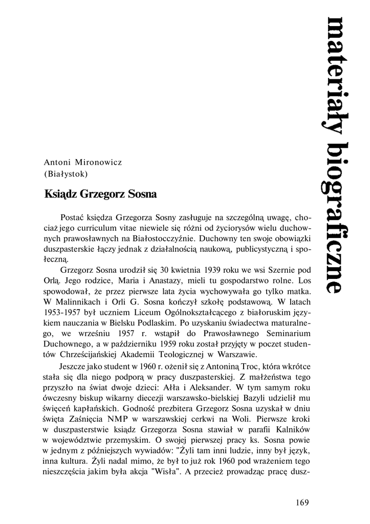Antoni Mironowicz (Białystok) Ksiądz Grzegorz Sosna Postać księdza Grzegorza Sosny zasługuje na szczególną uwagę, cho ciaż jego curriculum vitae niewiele się różni od życiorysów wielu duchow nych prawosławnych na Białostocczyźnie. Duchowny ten swoje obowiązki duszpasterskie łączy jednak z działalnością naukową, publicystyczną i spo łeczną. Grzegorz Sosna urodził się 30 kwietnia 1939 roku we wsi Szernie pod Orlą. Jego rodzice, Maria i Anastazy, mieli tu gospodarstwo rolne. Los spowodował, że przez pierwsze lata życia wychowywała go tylko matka. W Malinnikach i Orli G. Sosna kończył szkołę podstawową. W latach 1953-1957 był uczniem Liceum Ogólnokształcącego z białoruskim języ kiem nauczania w Bielsku Podlaskim. Po uzyskaniu świadectwa maturalne go, we wrześniu 1957 r. wstąpił do Prawosławnego Seminarium Duchownego, a w październiku 1959 roku został przyjęty w poczet studen tów Chrześcijańskiej Akademii Teologicznej w Warszawie. Jeszcze jako student w 1960 r. ożenił się z Antoniną Troc, która wkrótce stała się dla niego podporą w pracy duszpasterskiej. Z małżeństwa tego przyszło na świat dwoje dzieci: Ałła i Aleksander. W tym samym roku ówczesny biskup wikarny diecezji warszawsko-bielskiej Bazyli udzielił mu święceń kapłańskich. Godność prezbitera Grzegorz Sosna uzyskał w dniu święta Zaśnięcia NMP w warszawskiej cerkwi na Woli. Pierwsze kroki w duszpasterstwie ksiądz Grzegorza Sosna stawiał w parafii Kalników w województwie przemyskim. O swojej pierwszej pracy ks. Sosna powie w jednym z późniejszych wywiadów: "Żyli tam inni ludzie, inny był język, inna kultura. Żyli nadal mimo, że był to już rok 1960 pod wrażeniem tego nieszczęścia jakim była akcja "Wisła". A przecież prowadząc pracę dusz169 pasterską nie sposób nie wejść w życie ludzi. Zacząłem więc sięgać do tradycji, do podłoża, wnikać w sens ludzkich trosk". Zainteresowanie historią Cerkwi ks. Grzegorz Sosna pogłębił, gdy został skierowany do parafii w Kodniu nad Bugiem. Tragiczna historia Cerkwi prawosławnej i jej wiernych na tym obszarze wpłynęły na wybór pracy magisterskiej: Podłoże, na którym kształtowała się idea unii kościelnej w Polsce pod koniec XVI wieku. Przez sześć lat ks. Grzegorz Sosna zbierał materiały, by w 1966 r. obronić pracę magisterską w Chrześcijańskiej Akademii Teologicznej w Warszawie. W tym czasie był wikariuszem proboszcza parafii w Siemiatyczach. O swoim powrocie na Białostocczyznę powiedział na łamach prasy: "Ciągnęło mnie na Białostocczyznę. Na Białostocczyźnie przetrwało prawosławie w formie, która nie straciła swego oblicza. Chciałem badać naszą historię i historię naszej wiary". Rzeczywi ście, od czasu powrotu, na łamach wydawnictw cerkiewnych i białoruskich opublikował setki artykułów o historii parafii prawosławnych. Stale pisuje do "Wiadomości Polskiego Autokefalicznego Kościoła Prawosławnego" i "Cerkiewnego Wiestnika". Jego nazwisko często pojawia się na łamach "Niwy", "Przeglądu Prawosławnego" i "Czasopisu". Szczególnie cenne są monografie poszczególnych parafii prawosławnych, wykorzystywane przez wielu badaczy dziejów Cerkwi i regionu. Podczas pobytu w Siemiatyczach gromadził materiały do rozprawy doktorskiej. W tym celu penetrował liczne biblioteki i archiwa w kraju i za granicą. Na terenie parafii zainicjował budowę nowej plebanii i odbudowę cerkwi Wniebowstąpienia Pańskiego w Ciechanowcu. Za swoje zaangażo wanie zdobył szacunek i zaufanie parafian. W 1987 r. metropolita Bazyli przeniósł ks. Grzegorza Sosnę do Ryboł, gdzie kontynuuje po dziś dzień swoje prace badawcze, aktywnie działa społecznie, duchowo wspiera odradzający się po 1989 r. ruch białoruski. Jako badacz dziejów Białostocczyzny na łamach "Kuriera Porannego" w 1992 roku mówił na temat stanu świadomości narodowej swych parafian: "Ludzie określali się jako "tutejsi", bo inaczej nie mogli. Te ziemie prze chodziły z rąk do rąk. Mieszkańcom tutaj przypisywano wówczas, za każdym razem, inną narodowość. "Tutejszość" to niwelowała (.;.). "Tutej szość" wywodzi się z kultury ruskiej. Była ona podstawą do powołania kilku narodowości. W przypadku Białostocczyzny była to narodowość białoru ska. Mimo, że dzisiaj większość wyznawców prawosławia deklaruje się jako Polacy, to moim zdaniem ich rodowód jest niepolski". Ostatnie lata w życiu ks. G. Sosny były okresem wytężonej pracy i wielu sukcesów. Ukazały się bowiem Bibliografie parafii prawosławnych na Białostocczyźnie. Bibliografie... składają się z czterech serii: alfabetycznej, chronologicznej, osobowej i demograficznej. Pierwszy tom części alfabety cznej ukazał się w 1984 r., a następne w 1991 i 1993. Trzy tomy bibliografii zawierają około 8 tysięcy pozycji i są zaopatrzone w indeksy osobowe i 170 Ksiądz Grzegorz Sosna. Fot. z prywatnych zbiorów autora. geograficzne. Część chronologiczna, wydana w 1985 roku, jest podstawo wym przewodnikiem po zespołach źródeł do dziejów parafii prawosław nych, podobnie jak tomy części alfabetycznej po literaturze przedmiotu. Uzupełnieniem części chronologicznej stał się wykaz dokumentów wyda nych w osobnej pozycji pt.: Kościół prawosławny na Białostocczyźnie w ocenie władz II Rzeczypospolitej. W części osobowej bibliografii zatytuło wanej: Wykaz hierarchii i kleru oraz opiekunów cerkiewnych Kościoła prawosławnego na Białostocczyźnie, podane są informacje o duchowień stwie i starostach cerkiewnych. Część demograficzna bibliografii została wydana w osobnym tomie. Zawiera ona zestawienia ilości chrztów, ślubów i zgonów na podstawie ksiąg metrykalnych parafii prawosławnych. Wszy stkie pozycje bibliograficzne ks. Grzegorza Sosny są poprzedzone wprowa dzeniami wyjaśniającymi możliwości wykorzystania poszczególnych tomów oraz charakteryzującymi baz