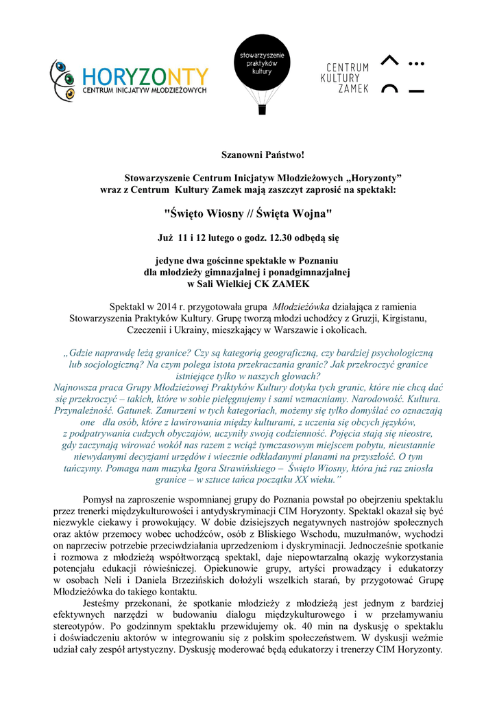 Szanowni Państwo! Stowarzyszenie Centrum Inicjatyw Młodzieżowych „Horyzonty” wraz z Centrum Kultury Zamek mają zaszczyt zaprosić na spektakl: "Święto Wiosny // Święta Wojna" Już 11 i 12 lutego o godz. 12.30 odbędą się jedyne dwa gościnne spektakle w Poznaniu dla młodzieży gimnazjalnej i ponadgimnazjalnej w Sali Wielkiej CK ZAMEK Spektakl w 2014 r. przygotowała grupa Młodzieżówka działająca z ramienia Stowarzyszenia Praktyków Kultury. Grupę tworzą młodzi uchodźcy z Gruzji, Kirgistanu, Czeczenii i Ukrainy, mieszkający w Warszawie i okolicach. „Gdzie naprawdę leżą granice? Czy są kategorią geograficzną, czy bardziej psychologiczną lub socjologiczną? Na czym polega istota przekraczania granic? Jak przekroczyć granice istniejące tylko w naszych głowach? Najnowsza praca Grupy Młodzieżowej Praktyków Kultury dotyka tych granic, które nie chcą dać się przekroczyć – takich, które w sobie pielęgnujemy i sami wzmacniamy. Narodowość. Kultura. Przynależność. Gatunek. Zanurzeni w tych kategoriach, możemy się tylko domyślać co oznaczają one dla osób, które z lawirowania między kulturami, z uczenia się obcych języków, z podpatrywania cudzych obyczajów, uczyniły swoją codzienność. Pojęcia stają się nieostre, gdy zaczynają wirować wokół nas razem z wciąż tymczasowym miejscem pobytu, nieustannie niewydanymi decyzjami urzędów i wiecznie odkładanymi planami na przyszłość. O tym tańczymy. Pomaga nam muzyka Igora Strawińskiego – Święto Wiosny, która już raz zniosła granice – w sztuce tańca początku XX wieku.” Pomysł na zaproszenie wspomnianej grupy do Poznania powstał po obejrzeniu spektaklu przez trenerki międzykulturowości i antydyskryminacji CIM Horyzonty. Spektakl okazał się być niezwykle ciekawy i prowokujący. W dobie dzisiejszych negatywnych nastrojów społecznych oraz aktów przemocy wobec uchodźców, osób z Bliskiego Wschodu, muzułmanów, wychodzi on naprzeciw potrzebie przeciwdziałania uprzedzeniom i dyskryminacji. Jednocześnie spotkanie i rozmowa z młodzieżą współtworzącą spektakl, daje niepowtarzalną okazję wykorzystania potencjału edukacji rówieśniczej. Opiekunowie grupy, artyści prowadzący i edukatorzy w osobach Neli i Daniela Brzezińskich dołożyli wszelkich starań, by przygotować Grupę Młodzieżówka do takiego kontaktu. Jesteśmy przekonani, że spotkanie młodzieży z młodzieżą jest jednym z bardziej efektywnych narzędzi w budowaniu dialogu międzykulturowego i w przełamywaniu stereotypów. Po godzinnym spektaklu przewidujemy ok. 40 min na dyskusję o spektaklu i doświadczeniu aktorów w integrowaniu się z polskim społeczeństwem. W dyskusji weźmie udział cały zespół artystyczny. Dyskusję moderować będą edukatorzy i trenerzy CIM Horyzonty. KIEDY? Dostępne są dwa terminy spektaklu: 11 lutego czwartek godz. 12.30 12 lutego piątek godz. 12.30 GDZIE? Centrum Kultury Zamek - Sala Wielka DLA KOGO JEST SPEKTAKL? Uczennice i uczniowie szkół gimnazjalnych i ponadgimnazjalnych Czas trwania spotkania: ok. 90 minut 50 minut spektakl z muzyką na żywo oraz dyskusja ok. 40 min BILETY Cena biletu za spektakl i spotkanie dyskusyjne to 15 zł. Opiekunowie wchodzą za darmo. Całkowity zysk z biletów jest przeznaczony na pokrycie kosztów transportu z Warszawy i pobytu 20-osobowej grupy teatralnej Młodzieżówka w Poznaniu, w związku z gościnnym wystawieniem spektaklu. Zamówienia grupowe tylko w CIM Horyzonty. Zamówienia biletów i wszelkie pytania proszę kierować do koordynatorki wydarzenia: Olgi Stobieckiej-Rozmiarek [email protected] Ilość miejsc ograniczona, liczy się kolejność zgłoszeń drogą mailową; o ostatecznej rezerwacji decydują wpłaty za bilety najpóźniej 2 tygodnie od wysłania zgłoszenia. W przypadku braku wpłaty rezerwacja biletów przepada. Aby zarezerwować bilety należy wysłać maila do koordynatorki z zamówieniem. W zamówieniu proszę podać ilość biletów dla uczniów, dla opiekunów oraz podstawowe informacje o grupie ( wiek, adres szkoły, dane mailowe i telefoniczne osoby kontaktowej). Link do trailera spektaklu na YT: https://www.youtube.com/watch?v=3zSEzy_pZmo Link do fotografii ze spektaklu autorstwa Piotra Karczmarczyka: https://www.facebook.com/media/set/?set=a.10154191315962565.1073741906.305590782564& type=3 W imieniu organizatorów zachęcamy do aktywnego uczestnictwa Poznańskie Szkoły. Zależy nam, by tworzyć w naszym mieście bezpieczną przestrzeń do dialogu międzykulturowego i wspólnie przeciwdziałać wszelkim formom dyskryminacji ze względu na pochodzenie etniczne czy wyznanie.