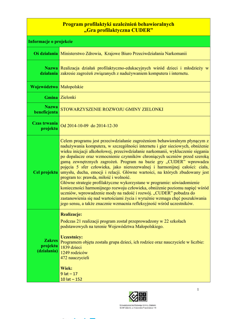 Program profilaktyki uzależnień behawioralnych „Gra profilaktyczna CUDER” Informacje o projekcie Oś działania Ministerstwo Zdrowia, Krajowe Biuro Przeciwdziałania Narkomanii Nazwa Realizacja działań profilaktyczno-edukacyjnych wśród dzieci i młodzieży w działania zakresie zagrożeń związanych z nadużywaniem komputera i internetu. Województwo Małopolskie Gmina Zielonki Nazwa STOWARZYSZENIE ROZWOJU GMINY ZIELONKI beneficjenta Czas trwania Od 2014-10-09 do 2014-12-30 projektu Celem programu jest przeciwdziałanie zagrożeniom behawioralnym płynącym z nadużywania komputera, w szczególności internetu i gier sieciowych, obniżenie wieku inicjacji alkoholowej, przeciwdziałanie narkomanii, wykluczenie sięgania po dopalacze oraz wzmocnienie czynników chroniących uczniów przed szeroką gamą zewnętrznych zagrożeń. Program na bazie gry „CUDER” wprowadza pojęcia 5 sfer człowieka, jako nierozerwalnej i harmonijnej całości: ciała, Cel projektu umysłu, ducha, emocji i relacji. Główne wartości, na których zbudowany jest program to: prawda, miłość i wolność. Główne strategie profilaktyczne wykorzystane w programie: uświadomienie konieczności harmonijnego rozwoju człowieka, obniżenie poziomu napięć wśród uczniów, wprowadzenie mody na radość i rozwój. „CUDER” pobudza do zastanowienia się nad wartościami życia i wyraźnie wzmaga chęć poszukiwania jego sensu, a także znacznie wzmacnia refleksyjność wśród uczestników. Realizacje: Podczas 21 realizacji program został przeprowadzony w 22 szkołach podstawowych na terenie Województwa Małopolskiego. Uczestnicy: Zakres Programem objęta została grupa dzieci, ich rodzice oraz nauczyciele w liczbie: projektu 1839 dzieci (działania) 1249 rodziców 472 nauczycieli Wiek: 9 lat – 17 10 lat – 152 1 11 lat – 709 12 lat – 814 13 lat – 125 14 lat – 2 38 lat nauczyciel - 1 Płeć: Kobiety – 905 Mężczyźni – 915 Ewaluacja: Program został wysoko oceniony zarówno przez biorące w nim udział dzieci jak i przez pedagogów i rodziców. Podsumowaniem każdej realizacji było przeprowadzenie ankiety ewaluacyjnej. Ankiety wypełniło: 1839 uczniów, z czego 19 nie nadawało się do analizy. Współcześnie coraz większym problemem zarówno dla diagnostów, terapeutów jak i dla profilaktyków są „uzależnienia behawioralne”. O patologicznym używaniu komputera i Internetu można mówić w przypadku, gdy mamy do czynienia z intensywnym korzystaniem z tego medium (70-80% czasu wolnego), upośledzeniem kontroli zwłaszcza czasu spędzanego przed komputerem, szukaniem społecznego uznania poprzez korzystanie z komputera, co może prowadzić do izolacji społecznej w normalnych kontaktach (upośledzenie zdolności interpersonalnych w świecie realnym), czy nawet imersji czyli zatraceniu się w świecie wirtualnym i braku umiejętności rozgraniczenia go ze światem realnym. Konsekwencje wynikające z takich zachowań mogą być zarówno somatyczne (nadwaga, problemy z kręgosłupem, problemy z oczami), psychiczne (depresja, fobie społeczne) oraz społeczne. Opis projektu Projekt zakłada przeprowadzenie w każdej szkole dużego mitingu z uczniami klas V i VI, podczas którego wprowadzona zostaje gra planszowa, jako sposób na spędzanie wolnego czasu poza światem wirtualnym oraz pokazane zostają sposoby na racjonale i bezpieczne korzystanie z komputera i internetu. Każda klasa obecna na spotkaniu otrzymuje grę planszową i wraz z trenerem oraz wychowawcą udaje się na warsztaty praktycznego wykorzystania tego narzędzia. Integralną częścią projektu są spotkania z wychowawcami i nauczycielami oraz rodzicami uczniów, w czasie których zwrócona zostaje uwaga na zagrożenia związane z komputerami i internetem oraz jak rozpoznawać sygnały ostrzegawcze o podnoszącym się ryzyku uzależnienia. Uczestnicy spotkania otrzymują ulotkę. Pokazane zostaną również sposoby na aktywizację młodych ludzi, którzy przedkładają świat wirtualny i relacje tam nawiązywane nad związki zawierane w świecie realnym. Dodatkowo wychowawcy zostają poinstruowani przez trenerów jak w najefektywniejszy sposób wykorzystywać grę profilaktyczną w przyszłości. Opis projektu Podczas spotkań z każdą z grup (uczniowie, rodzice, wychowawcy i nauczyciele) przeprowadzone zostały ankiety ewaluacyjne połączone z badaniem poziomu zagrożeń w danej szkole i społeczności. Szkoła otrzyma raport opisujący sytuację w placówce, co pozwoli na lepsze dopasowanie dalszych 2 działań. Wyniki badania zagrożeń przekazane zostały do Krajowego Biura Przeciwdziałania Narkomanii. Do obejrzenia: FILM 1 Gra profilaktyczna Cuder FILM 2 Gra profilaktyczna Cuder www.cuder.pl Wartość całkowita projektu (zł) 76 051,53 Dofinansowanie ze środków Funduszu Rozwiązywania Problemów Hazardowych będącego w dyspozycji Ministra Zdrowia (zł) 60 000,00 Udział własny beneficjenta (zł) 16 051,53 3