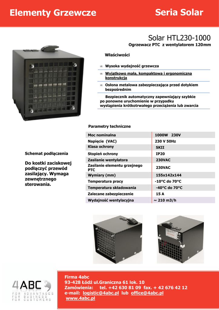 Seria Solar Elementy Grzewcze Solar HTL230-1000 Ogrzewacz PTC z wentylatorem 120mm Właściwości • Wysoka wydajność grzewcza • Wyjątkowo mała, kompaktowa i ergonomiczna konstrukcja • Osłona metalowa zabezpieczająca przed dotykiem bezpośrednim Bezpiecznik automatyczny zapewniający szybkie po ponowne uruchomienie w przypadku wystąpienia krótkotrwałego przeciążenia lub zwarcia Parametry techniczne Schemat podłączenia Do kostki zaciskowej podłączyć przewód zasilający. Wymaga zewnętrznego sterowania. Moc nominalna 1000W 230V Napięcie (VAC) Klasa ochrony 230 V 50Hz Stopień ochrony IP20 Zasilanie wentylatora Zasilanie elementu grzejnego PTC Wymiary (mm) 230VAC 230VAC Temperatura pracy -10°C do 70°C Temperatura składowania -40°C do 70°C Zalecane zabezpieczenie 15 A Wydajność wentylacyjna SKII 155x142x144 ~ 210 m3/h Firma 4abc 93-428 Łódź ul.Graniczna 61 lok. 10 Zamówienia: tel. +42 630 81 09 fax. + 42 676 42 12 e-mail: [email protected] lub [email protected] www.4abc.pl Uwagi instalacyjne: