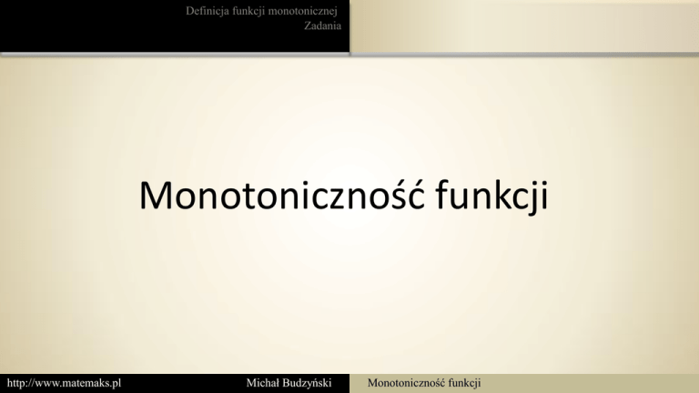 Definicja funkcji monotonicznej Zadania Monotoniczność funkcji http://www.matemaks.pl Michał Budzyński Monotoniczność funkcji Definicja funkcji monotonicznej Zadania Rosnącej Malejącej Nierosnącej i niemalejącej Funkcję f nazywamy rosnącą, gdy dla dowolnych argumentów spełniony jest warunek: http://www.matemaks.pl Michał Budzyński Monotoniczność funkcji Definicja funkcji monotonicznej Zadania Rosnącej Malejącej Nierosnącej i niemalejącej Funkcję f nazywamy malejącą, gdy dla dowolnych argumentów spełniony jest warunek: http://www.matemaks.pl Michał Budzyński Monotoniczność funkcji Definicja funkcji monotonicznej Zadania Rosnącej Malejącej Nierosnącej i niemalejącej Funkcję f jest nierosnąca, Funkcję f jest niemalejącą, nierosnąca http://www.matemaks.pl niemalejąca Michał Budzyński Monotoniczność funkcji Definicja funkcji monotonicznej Zadania Określanie monotoniczności funkcji danej wzorem Zbadaj monotoniczność funkcji 1) Funkcję f jest rosnąca, Funkcję f jest malejąca, Musimy zbadać: Mamy: http://www.matemaks.pl Michał Budzyński Monotoniczność funkcji Definicja funkcji monotonicznej Zadania Określanie monotoniczności funkcji danej wzorem Zbadaj monotoniczność funkcji 1) Funkcja f(x) jest rosnąca. http://www.matemaks.pl Michał Budzyński Monotoniczność funkcji Definicja funkcji monotonicznej Zadania Określanie monotoniczności funkcji danej wzorem Zbadaj monotoniczność funkcji 2) Zakładamy: Badamy znak: Funkcja f(x) jest malejąca. http://www.matemaks.pl Michał Budzyński Monotoniczność funkcji Definicja funkcji monotonicznej Zadania Określanie monotoniczności funkcji danej wzorem 3) I II Funkcja f(x) jest malejąca w przedziałach http://www.matemaks.pl Michał Budzyński . Monotoniczność funkcji