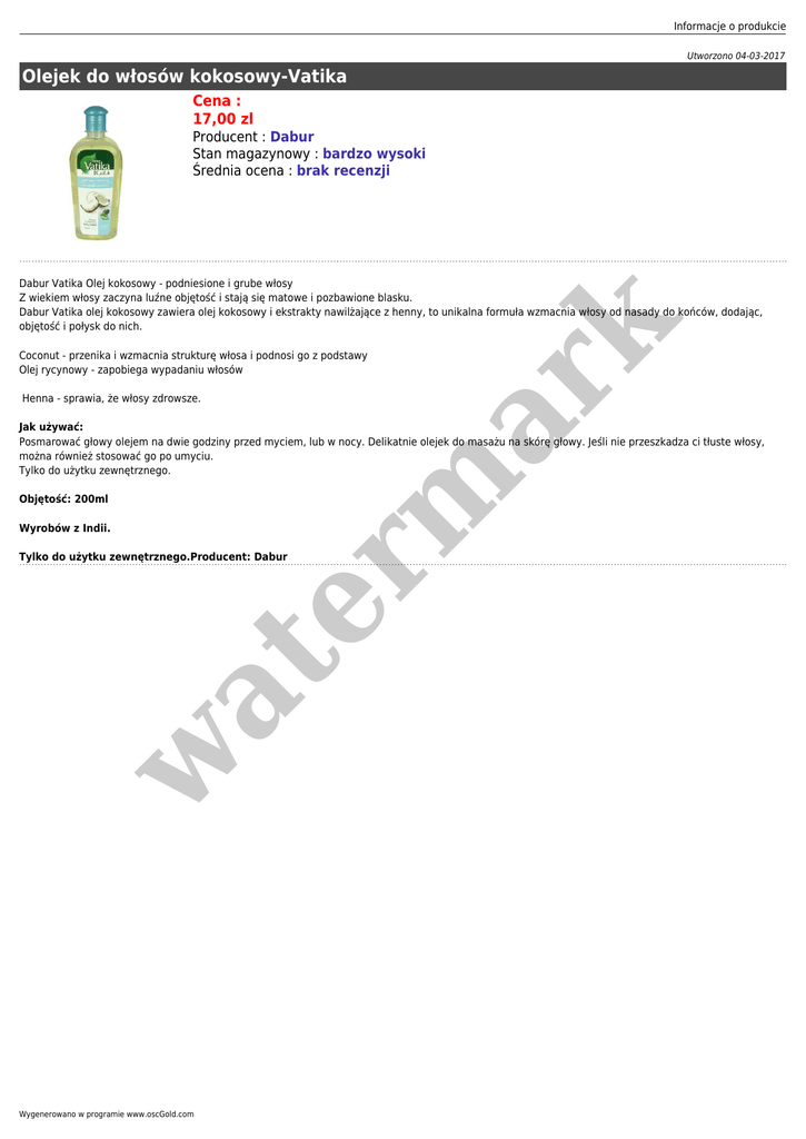 Informacje o produkcie Utworzono 04-03-2017 Olejek do włosów kokosowy-Vatika Cena : 17,00 zl Producent : Dabur Stan magazynowy : bardzo wysoki Średnia ocena : brak recenzji er m ar k Dabur Vatika Olej kokosowy - podniesione i grube włosy Z wiekiem włosy zaczyna luźne objętość i stają się matowe i pozbawione blasku. Dabur Vatika olej kokosowy zawiera olej kokosowy i ekstrakty nawilżające z henny, to unikalna formuła wzmacnia włosy od nasady do końców, dodając, objętość i połysk do nich. Coconut - przenika i wzmacnia strukturę włosa i podnosi go z podstawy Olej rycynowy - zapobiega wypadaniu włosów Henna - sprawia, że włosy zdrowsze. Jak używać: Posmarować głowy olejem na dwie godziny przed myciem, lub w nocy. Delikatnie olejek do masażu na skórę głowy. Jeśli nie przeszkadza ci tłuste włosy, można również stosować go po umyciu. Tylko do użytku zewnętrznego. Objętość: 200ml Wyrobów z Indii. w at Tylko do użytku zewnętrznego.Producent: Dabur Wygenerowano w programie www.oscGold.com