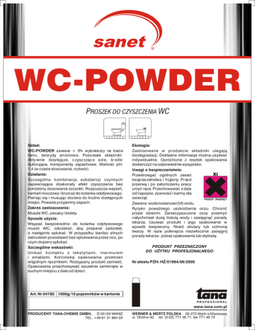 sanet WC-POWDER PROSZEK DO CZYSZCZENIA WC Sk³ad: WC-POWDER zawiera < 5% wybielaczy na bazie tlenu , tenz ydy an ionow e. Pozo sta³e sk³ad niki: Akty wnie dzia ³aj¹ ce, c zysz cz¹c e sol e, œr odki buforuj¹ce, komponenty zapachowe. Wartoœæ pH: 1,4 (w czasie stosowania, roztwór). Dzia³anie: Szczególna kombinacja substancji czynnych zapewniaj¹ca doskona³y efekt czyszczenia bez potrzebny stosowania szczotki. Rozpuszcza wapieñ, kamieñ moczowy i brud a¿ do kolanka odp³ywowego. Pieni¹c siê i musuj¹c dociera do trudno dostêpnych miejsc. Posiada przyjemny zapach. Zakres zastosowania: Muszle WC, pisuary i bidety. Sposób u¿ycia: Wsypaæ bezpoœrednio do kolanka odp³ywowego muszli WC, odczekaæ, aby preparat zadzia³a³, a nastêpnie sp³ukaæ. W przypadku bardzo silnych zabrudzeñ pozostawiæ bez sp³ukiwania przez noc, po czym dopiero sp³ukaæ. Szczególne wskazówki: Unikaæ kontaktu z tekstyliami, marmurem i emaliami. Koñcówkê opakowania przetrzeæ wilgotnym rêcznikiem. Rozsypany produkt zamieœæ. Opakowania przechowywaæ szczelnie zamkniête w suchym miejscu z dala od dzieci. Ekologia: Zastosowane w produkcie sk³adniki ulegaj¹ biodegradacji. Dok³adne informacje mo¿na uzyskaæ indywidualnie. Opró¿nione z resztek opakowania dostarczyæ na odpowiednie wysypisko. Uwagi o bezpieczeñstwie: Xi Przestrzegaæ ogólnych zasad bezpieczeñstwa i higieny. Przed przerw¹ i po zakoñczeniu pracy umyæ rêce. Przechowywaæ z dala od napojów, ¿ywnoœci i karmy dla zwierz¹t. PRODUKT DRA¯NI¥CY Zawiera: wodorosiarczan(VI) sodu. Ryzyko powa¿nego uszkodzenia oczu. Chroniæ przed dzieæmi. Zanieczyszczone oczy przemyæ natychmiast du¿¹ iloœci¹ wody i zasiêgn¹æ porady lekarza. Usuwaæ produkt i jego opakowanie w sposób bezpieczny. Nosiæ okulary lub ochronê twarzy. W razie po³kniêcia niezw³ocznie zasiêgnij porady lekarza - poka¿ opakowanie lub etykietê. PRODUKT PRZEZNACZONY DO U¯YTKU PROFESJONALNEGO Nr atestu PZH: H¯/01964/06/2005 Art. Nr 04785 1000g/10 pojemników w kartonie PROFESSIONAL www.tana.com.pl PRODUCENT: TANA-CHEMIE GMBH, D-55120 MAINZ TEL. +49 61 31 964 03 WERNER & MERTZ POLSKA 05-270 Marki k/Warszawy ul. Okólna 40, tel. (0-22) 771 46 71, fax 771 46 73