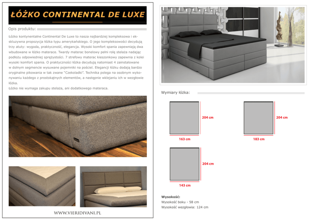 ŁÓŻKO continental de luxe Opis produktu: Łóżko kontynentalne Continental De Luxe to nasza najbardziej kompleksowa i ekskluzywna propozycja łóżka typu amerykańskiego. O jego kompleksowości decydują trzy atuty: wygoda, praktyczność, elegancja. Wysoki komfort spania zapewniają dwa wbudowane w łóżko materace. Twardy materac bonelowy pełni rolę stelaża nadając podłożu odpowiedniej sprężystości. 7 strefowy materac kieszonkowy zapewnia z kolei wysoki komfort spania. O praktyczności łóżka decydują natomiast 4 zainstalowane w dolnym segmencie wysuwane pojemniki na pościel. Elegancji łóżku dodają bardzo oryginalne pikowania w tak zwane “Czekoladki”. Technika polega na osobnym wykonywaniu każdego z prostokątnych elementów, a następnie wklejaniu ich w wezgłowie łóżka. Łóżko nie wymaga zakupu stelaża, ani dodatkowego materaca. Wymiary łóżka: 204 cm 163 cm 183 cm 204 cm 143 cm Wysokość: Wysokość boku - 58 cm Wysokość wezgłowia: 124 cm www.vieridivani.pl 204 cm