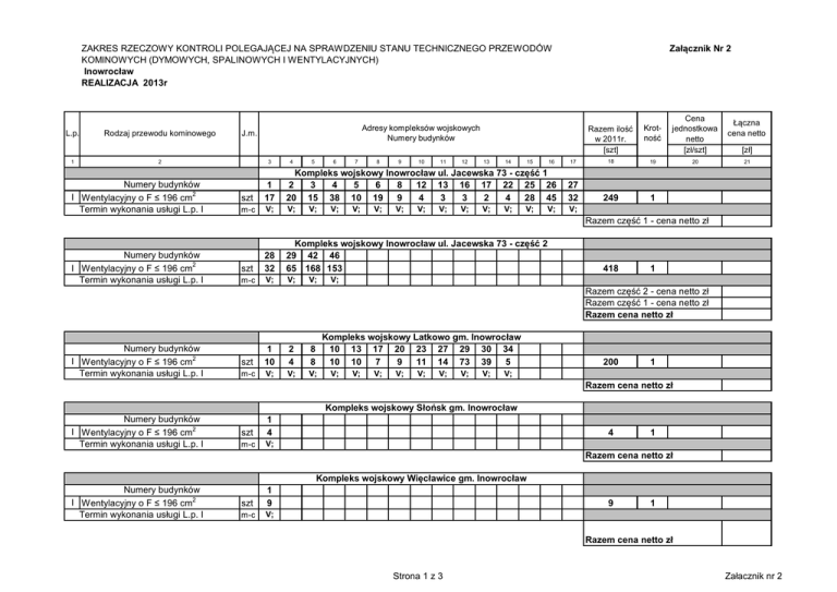 ZAKRES RZECZOWY KONTROLI POLEGAJĄCEJ NA SPRAWDZENIU STANU TECHNICZNEGO PRZEWODÓW KOMINOWYCH (DYMOWYCH, SPALINOWYCH I WENTYLACYJNYCH) Inowrocław REALIZACJA 2013r L.p. Rodzaj przewodu kominowego 1 2 Numery budynków I Wentylacyjny o F ≤ 196 cm2 Termin wykonania usługi L.p. I Załącznik Nr 2 Razem ilość w 2011r. [szt] Krotność Cena jednostkowa netto [zł/szt] 17 18 19 20 27 32 249 1 V; Adresy kompleksów wojskowych Numery budynków J.m. 3 4 5 6 7 8 9 10 11 12 13 14 15 16 szt 1 17 Kompleks wojskowy Inowrocław ul. Jacewska 73 - część 1 2 3 4 5 6 8 12 13 16 17 22 25 26 20 15 38 10 19 9 4 3 3 2 4 28 45 m-c V; V; V; V; V; V; V; V; V; V; V; V; V; V; Łączna cena netto [zł] 21 Razem część 1 - cena netto zł Numery budynków I Wentylacyjny o F ≤ 196 cm2 Termin wykonania usługi L.p. I szt 28 32 Kompleks wojskowy Inowrocław ul. Jacewska 73 - część 2 29 42 46 65 168 153 m-c V; V; V; 418 1 V; Razem część 2 - cena netto zł Razem część 1 - cena netto zł Razem cena netto zł Numery budynków I Wentylacyjny o F ≤ 196 cm2 Termin wykonania usługi L.p. I Kompleks wojskowy Latkowo gm. Inowrocław 10 13 17 20 23 27 29 30 34 10 10 7 9 11 14 73 39 5 szt 1 10 2 4 8 8 m-c V; V; V; V; V; V; V; V; V; V; V; 200 1 V; Razem cena netto zł Kompleks wojskowy Słońsk gm. Inowrocław Numery budynków I Wentylacyjny o F ≤ 196 cm2 Termin wykonania usługi L.p. I szt 1 4 m-c V; 4 1 Razem cena netto zł Kompleks wojskowy Więcławice gm. Inowrocław Numery budynków I Wentylacyjny o F ≤ 196 cm2 Termin wykonania usługi L.p. I szt 1 9 m-c V; 9 1 Razem cena netto zł Strona 1 z 3 Załacznik nr 2 L.p. Rodzaj przewodu kominowego 1 2 Adresy kompleksów wojskowych Numery budynków J.m. 3 4 1 5 6 7 8 9 10 11 12 13 14 15 16 17 Numery budynków I Spalinowy o F ≤ 196 cm2 Termin wykonania usługi L.p. I szt Kompleks wojskowy Inowrocław ul. Dworcowa 56 - część 1 2 3 4 5 6 7 8 9 11 13 14 18 23 1 2 m-c V; II Wentylacyjny o F ≤ 196 cm2 Termin wykonania usługi L.p. II szt 40 43 40 40 32 18 16 98 89 29 4 2 2 2 12 m-c V; V; V; V; V; V; V; V; V; V; V; V; V; V; V; Razem ilość w czasie umowy [szt] Krotność Cena jednostkowa netto [zł/szt] 18 19 20 3 1 467 1 Łączna cena netto [zł] 21 28 V; Razem część 1 - cena netto zł Numery budynków I Spalinowy o F ≤ 196 cm2 Termin wykonania usługi L.p. I II Wentylacyjny o F ≤ 196 cm2 Termin wykonania usługi L.p. II 30 szt Kompleks wojskowy Inowrocław ul. Dworcowa 56- część 2 36 37 54 62 63 1 1 V; m-c 2 1 47 1 V; szt 4 22 12 5 1 3 m-c V; V; V; V; V; V; Razem część 2 - cena netto zł Razem część 1 - cena netto zł Razem cena netto zł Numery budynków spalinowy o F ≤ 196 cm2 I Wentylacyjny o F ≤ 196 cm2 Termin wykonania usługi L.p. I 1 szt 2 13 1 2 m-c V; V; Kompleks wojskowy Sławęcinek gm. Inowrocław 42 1 2 6 1 1 V; Razem cena netto zł Kompleks wojskowy Inowrocław ul. Dworcowa 27 (WKU) Numery budynków I Wentylacyjny o F ≤ 196 cm2 Termin wykonania usługi L.p. I szt 1 20 2 15 m-c V; V; 35 1 Razem cena netto zł Strona 2 z 3 Załacznik nr 2 L.p. Rodzaj przewodu kominowego 1 2 Adresy kompleksów wojskowych Numery budynków J.m. 3 4 5 6 7 8 9 10 11 12 13 14 15 16 17 Razem ilość w czasie umowy [szt] Krotność Cena jednostkowa netto [zł/szt] 18 19 20 8 1 Łączna cena netto [zł] 21 Kompleks wojskowy Łojewo gm. Inowrocław Numery budynków I Wentylacyjny o F ≤ 196 cm2 Termin wykonania usługi L.p. I szt 1 8 m-c V; Razem cena netto zł Kompleks wojskowy Inowrocław ul. Narutowicza (Koścół) Numery budynków I Wentylacyjny o F ≤ 196 cm2 Termin wykonania usługi L.p. I szt 1 4 2 4 m-c V; V; 8 1 Razem cena netto zł Strona 3 z 3 Załacznik nr 2