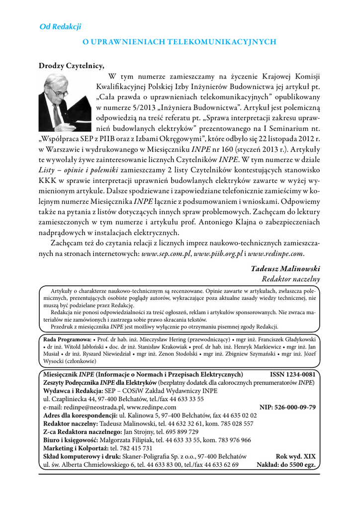 Od Redakcji O uprawnieniach telekomunikacyjnych Drodzy Czytelnicy, W tym numerze zamieszczamy na życzenie Krajowej Komisji Kwalifikacyjnej Polskiej Izby Inżynierów Budownictwa jej artykuł pt. „Cała prawda o uprawnieniach telekomunikacyjnych” opublikowany w numerze 5/2013 „Inżyniera Budownictwa”. Artykuł jest polemiczną odpowiedzią na treść referatu pt. „Sprawa interpretacji zakresu uprawnień budowlanych elektryków” prezentowanego na I Seminarium nt. „Współpraca SEP z PIIB oraz z Izbami Okręgowymi”, które odbyło się 22 listopada 2012 r. w Warszawie i wydrukowanego w Miesięczniku INPE nr 160 (styczeń 2013 r.). Artykuły te wywołały żywe zainteresowanie licznych Czytelników INPE. W tym numerze w dziale Listy – opinie i polemiki zamieszczamy 2 listy Czytelników kontestujących stanowisko KKK w sprawie interpretacji uprawnień budowlanych elektryków zawarte w wyżej wymienionym artykule. Dalsze spodziewane i zapowiedziane telefonicznie zamieścimy w kolejnym numerze Miesięcznika INPE łącznie z podsumowaniem i wnioskami. Odpowiemy także na pytania z listów dotyczących innych spraw problemowych. Zachęcam do lektury zamieszczonych w tym numerze i artykułu prof. Antoniego Klajna o zabezpieczeniach nadprądowych w instalacjach elektrycznych. Zachęcam też do czytania relacji z licznych imprez naukowo-technicznych zamieszczanych na stronach internetowych: www.sep.com.pl, www.piib.org.pl i www.redinpe.com. Tadeusz Malinowski Redaktor naczelny Artykuły o charakterze naukowo-technicznym są recenzowane. Opinie zawarte w artykułach, zwłaszcza polemicznych, prezentujących osobiste poglądy autorów, wykraczające poza aktualne zasady wiedzy technicznej, nie muszą być podzielane przez Redakcję. Redakcja nie ponosi odpowiedzialności za treść ogłoszeń, reklam i artykułów sponsorowanych. Nie zwraca materiałów nie zamówionych i zastrzega sobie prawo skracania tekstów. Przedruk z miesięcznika INPE jest możliwy wyłącznie po otrzymaniu pisemnej zgody Redakcji. Rada Programowa: • Prof. dr hab. inż. Mieczysław Hering (przewodniczący) • mgr inż. Franciszek Gładykowski • dr inż. Witold Jabłoński • doc. dr inż. Stanisław Krakowiak • prof. dr hab. inż. Henryk Markiewicz • mgr inż. Jan Musiał • dr inż. Ryszard Niewiedział • mgr inż. Zenon Stodolski • mgr inż. Zbigniew Szymański • mgr inż. Józef Wysocki (członkowie) Miesięcznik INPE (Informacje o Normach i Przepisach Elektrycznych) ISSN 1234-0081 Zeszyty Podręcznika INPE dla Elektryków (bezpłatny dodatek dla całorocznych prenumeratorów INPE) Wydawca i Redakcja: SEP – COSiW Zakład Wydawniczy INPE ul. Czapliniecka 44, 97-400 Bełchatów, tel./fax 44 633 33 55 e-mail: [email protected], www.redinpe.com NIP: 526-000-09-79 Adres dla korespondencji: ul. Kalinowa 5, 97-400 Bełchatów, fax 44 635 02 02 Redaktor naczelny: Tadeusz Malinowski, tel. 44 632 32 61, kom. 785 028 557 Z-ca Redaktora naczelnego: Jan Strojny, tel. 695 899 729 Biuro i księgowość: Małgorzata Filipiak, tel. 44 633 33 55, kom. 783 976 966 Marketing i Kolportaż: tel. 782 415 731 Skład komputerowy i druk: Skaner-Poligrafia Sp. z o.o., 97-400 Bełchatów Rok wyd. XIX ul. św. Alberta Chmielowskiego 6, tel. 44 633 83 00, tel./fax 44 633 62 69 Nakład: do 5500 egz.