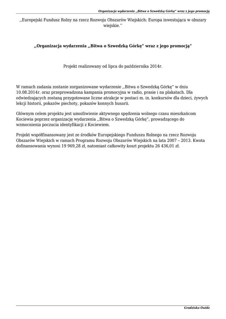 Organizacja wydarzenia ,,Bitwa o Szwedzką Górkę” wraz z jego promocją ,,Europejski Fundusz Rolny na rzecz Rozwoju Obszarów Wiejskich: Europa inwestująca w obszary wiejskie.’’ ,,Organizacja wydarzenia ,,Bitwa o Szwedzką Górkę” wraz z jego promocją” Projekt realizowany od lipca do października 2014r. W ramach zadania zostanie zorganizowane wydarzenie ,,Bitwa o Szwedzką Górkę” w dniu 10.08.2014r. oraz przeprowadzona kampania promocyjna w radio, prasie i na plakatach. Dla odwiedzających zostaną przygotowane liczne atrakcje w postaci m. in. konkursów dla dzieci, żywych lekcji historii, pokazów piechoty, pokazów konnych husarii. Głównym celem projektu jest umożliwienie aktywnego spędzenia wolnego czasu mieszkańcom Kociewia poprzez organizację wydarzenia ,,Bitwa o Szwedzką Górkę”, prowadzącego do wzmocnienia poczucia identyfikacji z Kociewiem. Projekt współfinansowany jest ze środków Europejskiego Funduszu Rolnego na rzecz Rozwoju Obszarów Wiejskich w ramach Programu Rozwoju Obszarów Wiejskich na lata 2007 – 2013. Kwota dofinansowania wynosi 19 969,28 zł, natomiast całkowity koszt projektu 26 436,01 zł. Grodzisko Owidz