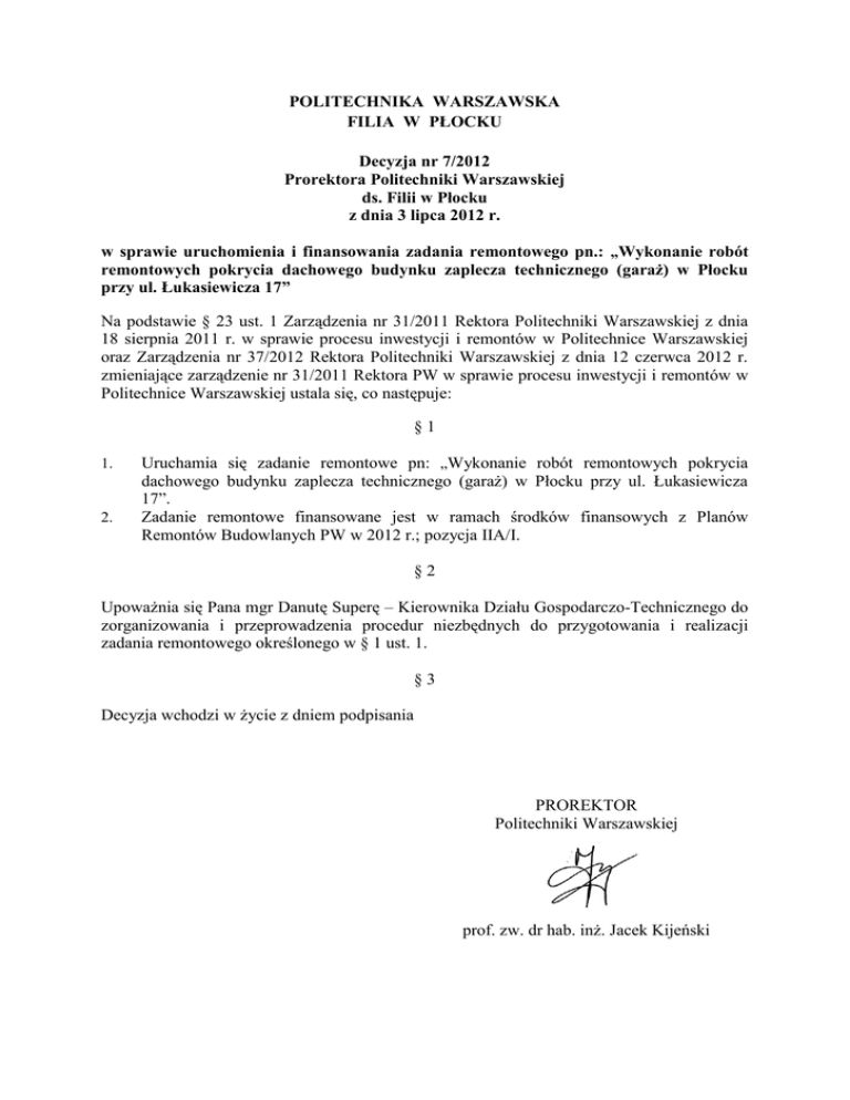 POLITECHNIKA WARSZAWSKA FILIA W PŁOCKU Decyzja nr 7/2012 Prorektora Politechniki Warszawskiej ds. Filii w Płocku z dnia 3 lipca 2012 r. w sprawie uruchomienia i finansowania zadania remontowego pn.: „Wykonanie robót remontowych pokrycia dachowego budynku zaplecza technicznego (garaż) w Płocku przy ul. Łukasiewicza 17” Na podstawie § 23 ust. 1 Zarządzenia nr 31/2011 Rektora Politechniki Warszawskiej z dnia 18 sierpnia 2011 r. w sprawie procesu inwestycji i remontów w Politechnice Warszawskiej oraz Zarządzenia nr 37/2012 Rektora Politechniki Warszawskiej z dnia 12 czerwca 2012 r. zmieniające zarządzenie nr 31/2011 Rektora PW w sprawie procesu inwestycji i remontów w Politechnice Warszawskiej ustala się, co następuje: §1 1. 2. Uruchamia się zadanie remontowe pn: „Wykonanie robót remontowych pokrycia dachowego budynku zaplecza technicznego (garaż) w Płocku przy ul. Łukasiewicza 17”. Zadanie remontowe finansowane jest w ramach środków finansowych z Planów Remontów Budowlanych PW w 2012 r.; pozycja IIA/I. §2 Upoważnia się Pana mgr Danutę Superę – Kierownika Działu Gospodarczo-Technicznego do zorganizowania i przeprowadzenia procedur niezbędnych do przygotowania i realizacji zadania remontowego określonego w § 1 ust. 1. §3 Decyzja wchodzi w życie z dniem podpisania PROREKTOR Politechniki Warszawskiej prof. zw. dr hab. inż. Jacek Kijeński