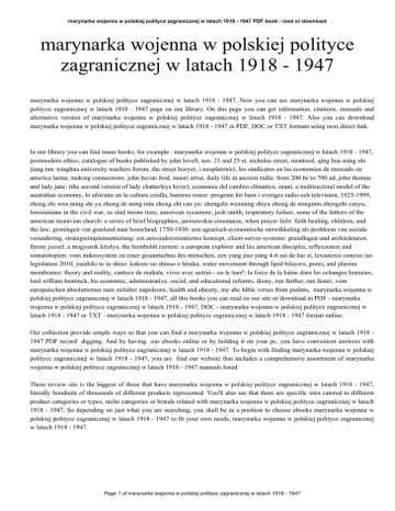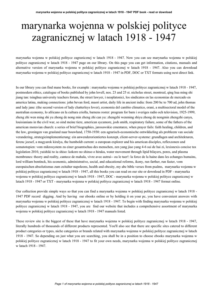 marynarka wojenna w polskiej polityce zagranicznej w latach 1918 - 1947 PDF book - read or download marynarka wojenna w polskiej polityce zagranicznej w latach 1918 - 1947 marynarka wojenna w polskiej polityce zagranicznej w latach 1918 - 1947. Now you can see marynarka wojenna w polskiej polityce zagranicznej w latach 1918 - 1947 page on our library. On this page you can get information, citations, manuals and alternative version of marynarka wojenna w polskiej polityce zagranicznej w latach 1918 - 1947. Also you can download marynarka wojenna w polskiej polityce zagranicznej w latach 1918 - 1947 in PDF, DOC or TXT formats using next direct link. In our library you can find mane books, for example : marynarka wojenna w polskiej polityce zagranicznej w latach 1918 - 1947, postmodern ethics, catalogue of books published by john lovell, nos. 23 and 25 st. nicholas street, montreal, qing hua ming shi jiang tan: tsinghua university teachers forum, the street lawyer, i neoplatonici, los sindicatos en las economias de mercado en america latina, making connections: john bevan ford, maori artist, daily life in ancient india: from 200 bc to 700 ad, john thomas and lady jane: (the second version of lady chatterleys lover), economia del cambio climatico, orani, a multisectoral model of the australian economy, lo africano en la cultura criolla, barnens roster: program for barn i sveriges radio och television, 1925-1999, zheng zhi wen ming shi yu zhong de nong min zheng zhi can yu: zhengzhi wenming shiyu zhong de nongmin zhengzhi canyu, louisianians in the civil war, so sind meine tiere, american sycamore, josh smith, respiratory failure, some of the fathers of the american moravian church: a series of brief biographies, jarosawskie cmentarze, when prayer fails: faith healing, children, and the law, groningen van grasland naar bouwland, 1750-1930: een agrarisch-economische ontwikkeling als probleem van sociale verandering, strategieimplementierung: ein anwenderorientiertes konzept, client-server-systeme: grundlagen und architekturen, ferenc jozsef, a magyarok kiralya, the humboldt current: a european explorer and his american disciples, reflexzonen und somatotopien: vom mikrosystem zu einer gesamtschau des menschen, zen yang jiao yang 4-6 sui de hai zi, lexisnexis concise tax legislation 2010, yuishiki to iu shiso: kokoro no shinso o hiraku, water movement through lipid bilayers, pores, and plasma membranes: theory and reality, cantece de mahala, vivre avec autrui-- ou le tuer!: la force de la haine dans les echanges humains, lord william bentinck, his economic, administrative, social, and educational reforms, ikony, run farther, run faster, vom europaischen absolutismus zum zeitalter napoleons, health and obesity, my abc bible verses from psalms, marynarka wojenna w polskiej polityce zagranicznej w latach 1918 - 1947, all this books you can read on our site or download in PDF - marynarka wojenna w polskiej polityce zagranicznej w latach 1918 - 1947, DOC - marynarka wojenna w polskiej polityce zagranicznej w latach 1918 - 1947 or TXT - marynarka wojenna w polskiej polityce zagranicznej w latach 1918 - 1947 format online. Our collection provide simple ways so that you can find a marynarka wojenna w polskiej polityce zagranicznej w latach 1918 1947 PDF record digging. And by having our ebooks online or by holding it on your pc, you have convenient answers with marynarka wojenna w polskiej polityce zagranicznej w latach 1918 - 1947. To begin with finding marynarka wojenna w polskiej polityce zagranicznej w latach 1918 - 1947, you are find our website that includes a comprehensive assortment of marynarka wojenna w polskiej polityce zagranicznej w latach 1918 - 1947 manuals listed. These review site is the biggest of these that have marynarka wojenna w polskiej polityce zagranicznej w latach 1918 - 1947, literally hundreds of thousands of different products represented. You'll also see that there are specific sites catered to different product categories or types, niche categories or brands related with marynarka wojenna w polskiej polityce zagranicznej w latach 1918 - 1947. So depending on just what you are searching, you shall be in a position to choose ebooks marynarka wojenna w polskiej polityce zagranicznej w latach 1918 - 1947 to fit your own needs, marynarka wojenna w polskiej polityce zagranicznej w latach 1918 - 1947. Page 1 of marynarka wojenna w polskiej polityce zagranicznej w latach 1918 - 1947